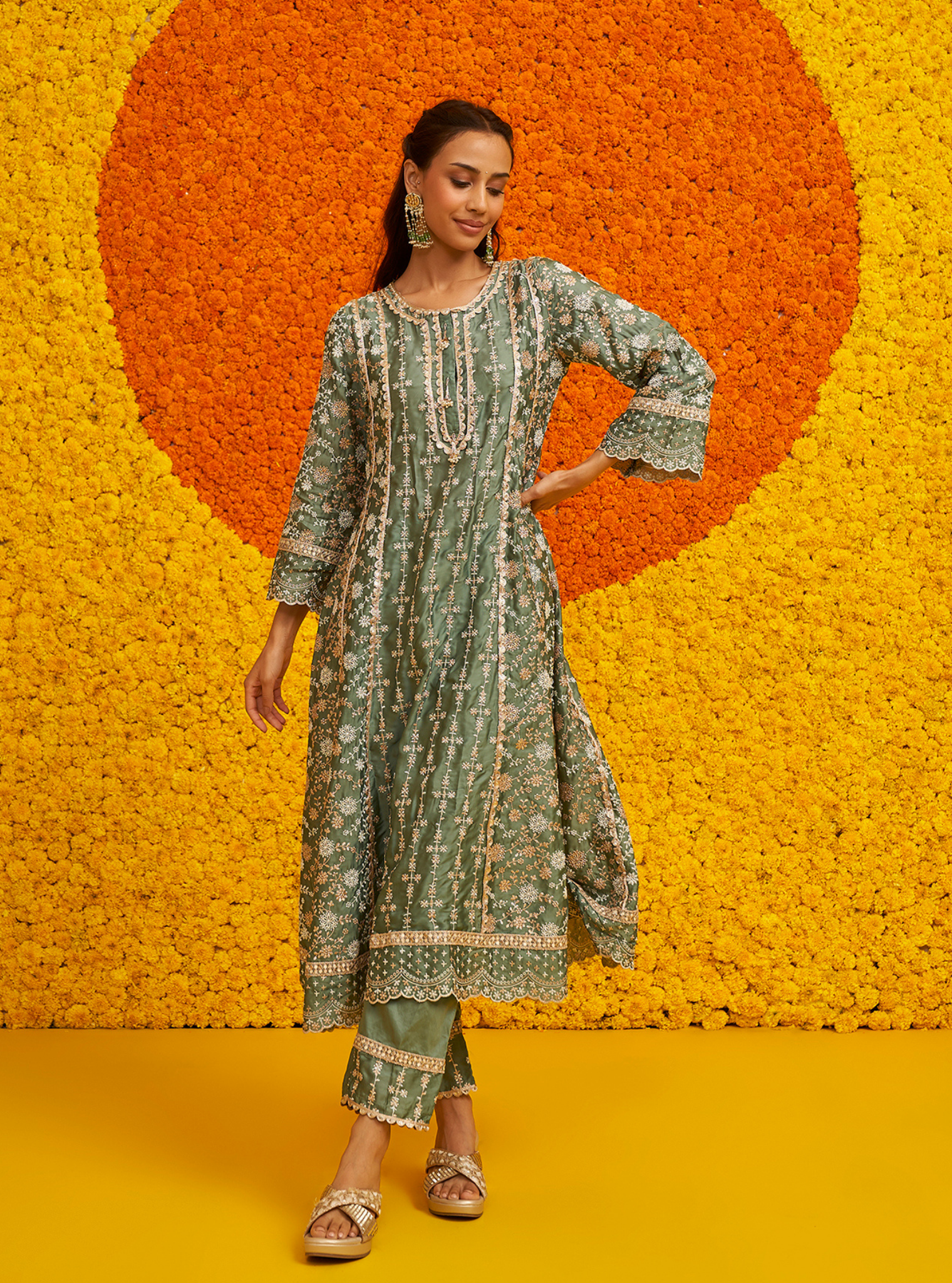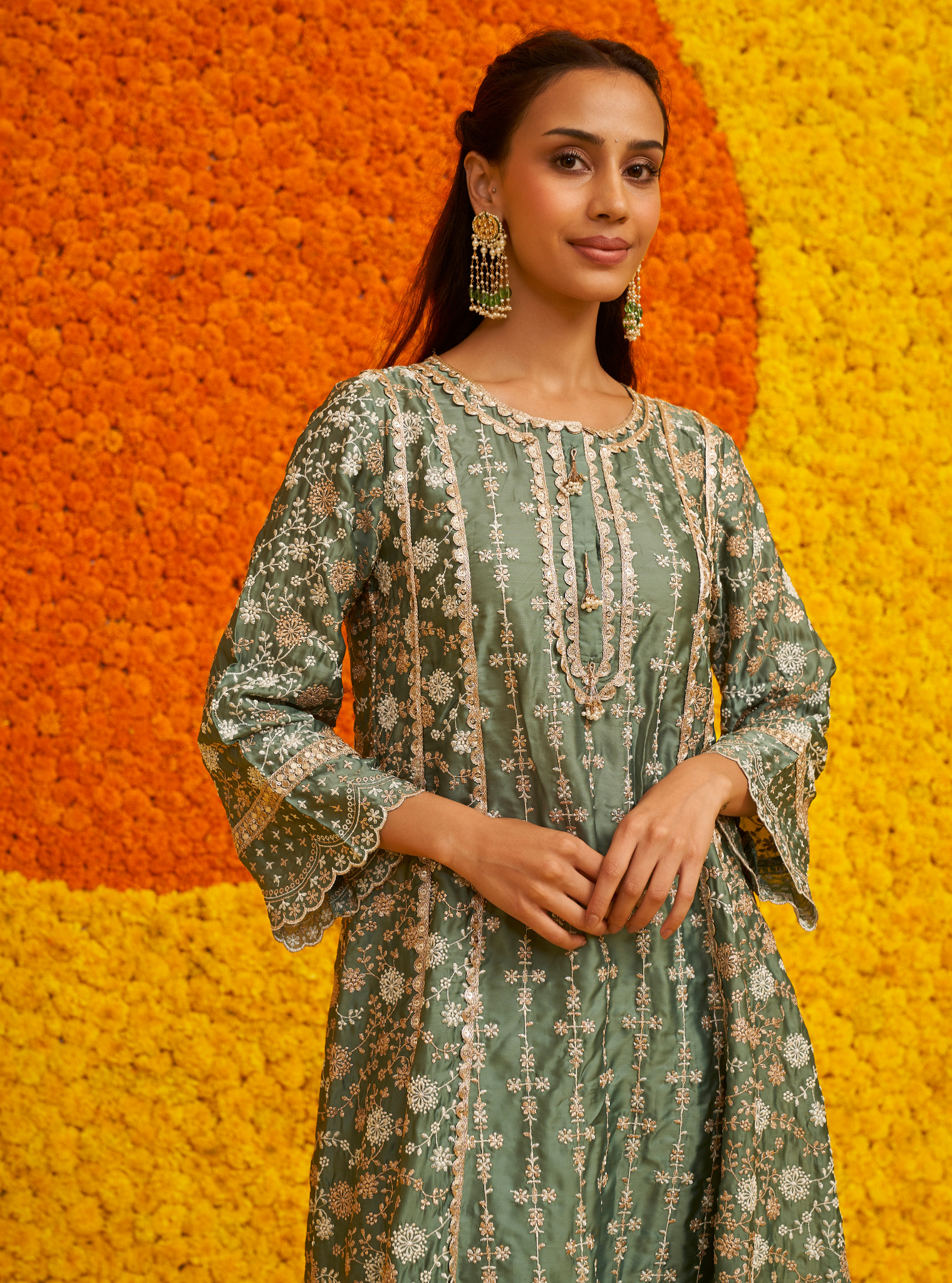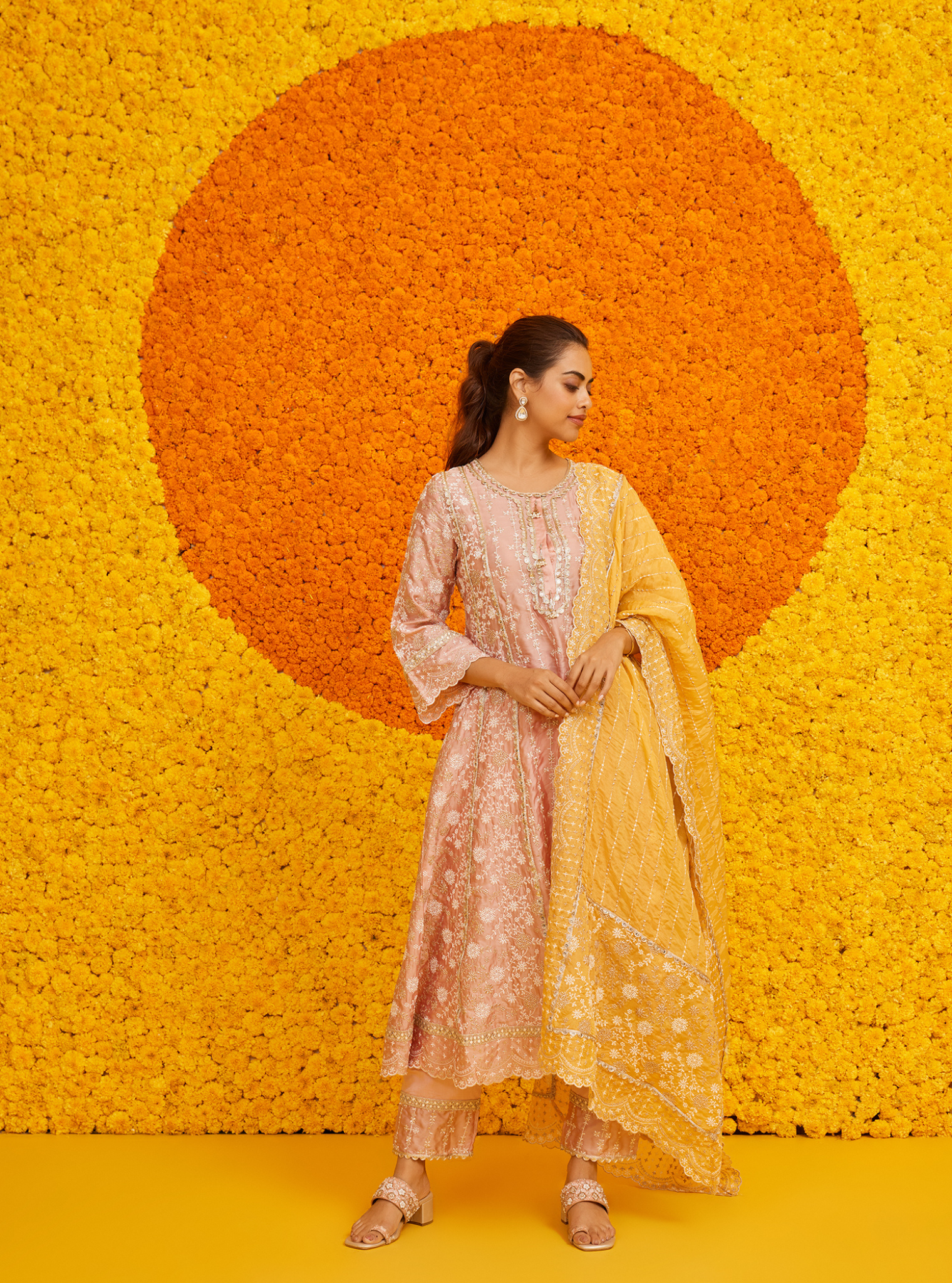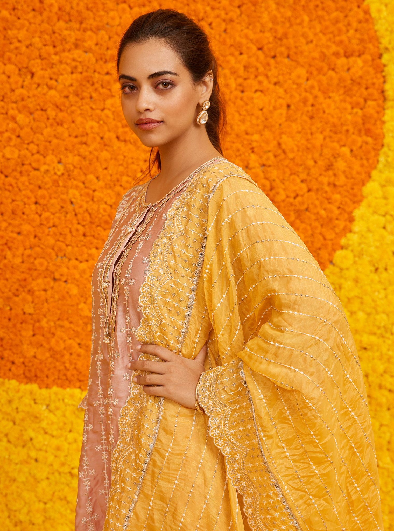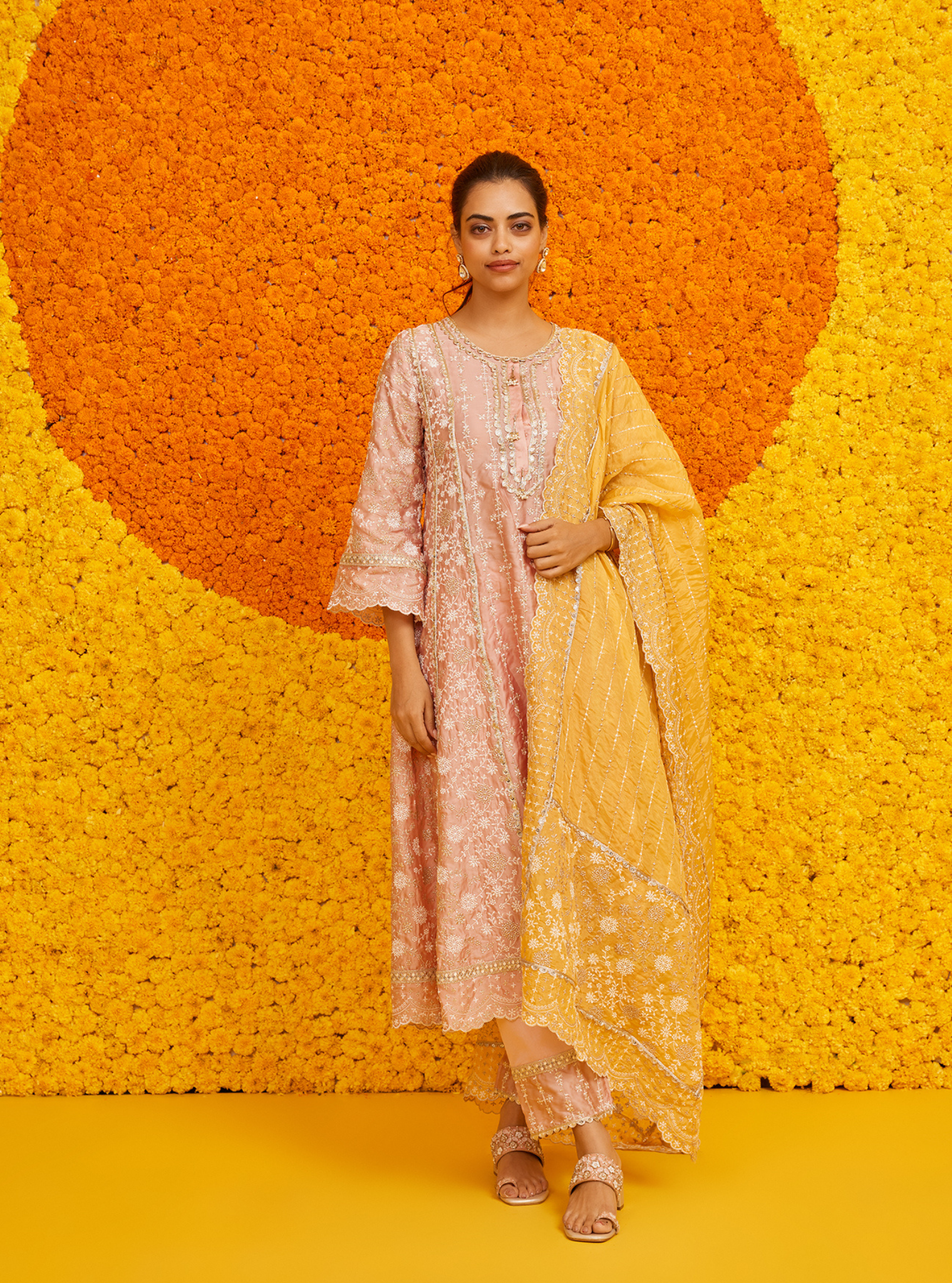 Step into the spotlight with this exquisite teal blue/pink kurta set, perfect for wedding festivities. This masterpiece is adorned with intricate embroidery work that sprawls across the entirety of the kurta, giving it an ethereal charm, while the gotta detailing adds a touch of elegance. The flowing silhouette, paired with matching pants, offers both comfort and grace, making it ideal for dancing the night away. The ensemble is completed with a beautifully embroidered dupatta, with scalloped edges