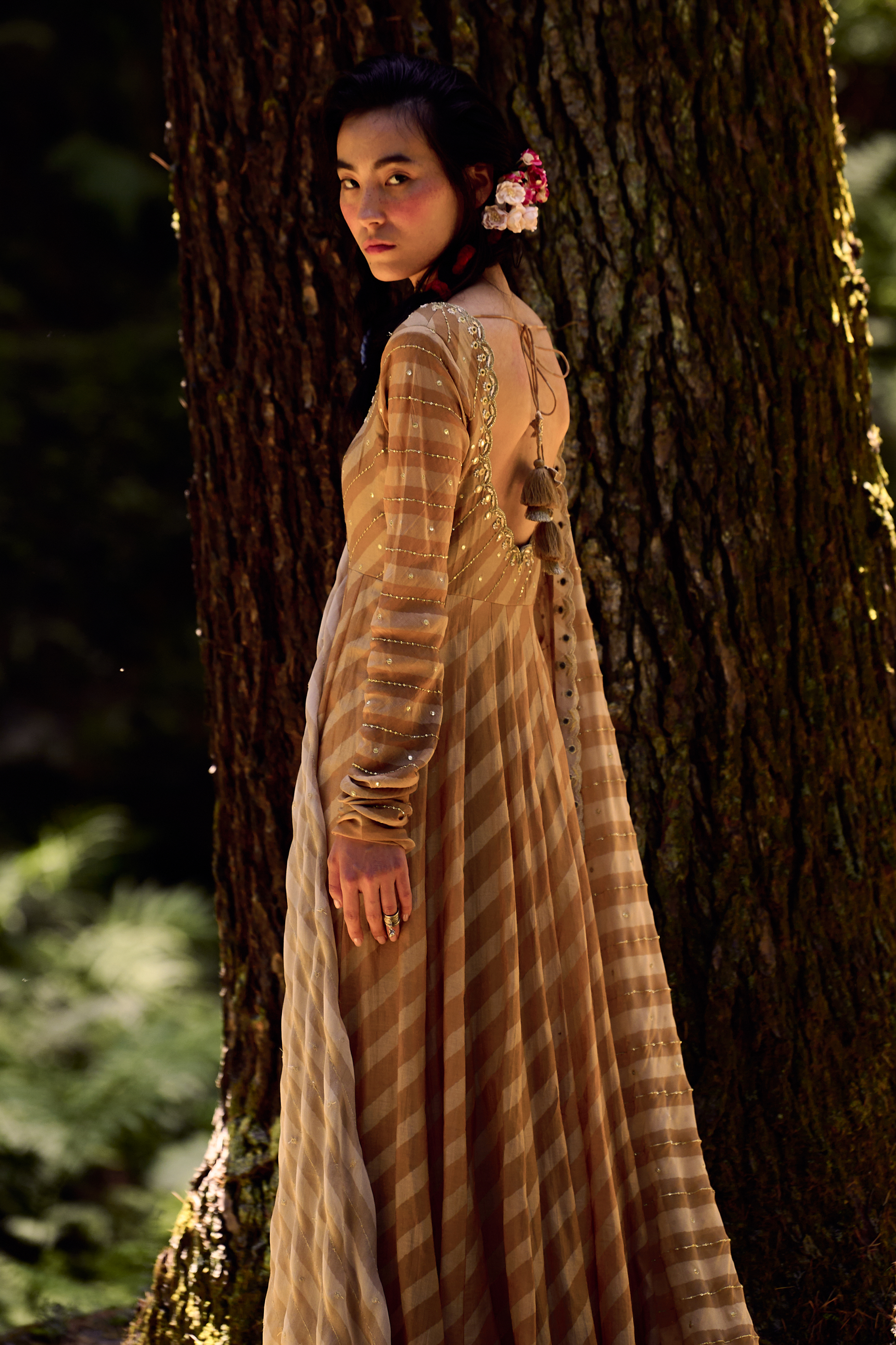 Beige leheriya print kurta set of hand–embroidered anarkali and dupatta embellished with mirrors, dabka work, zari, cutdana, sequins and moti.