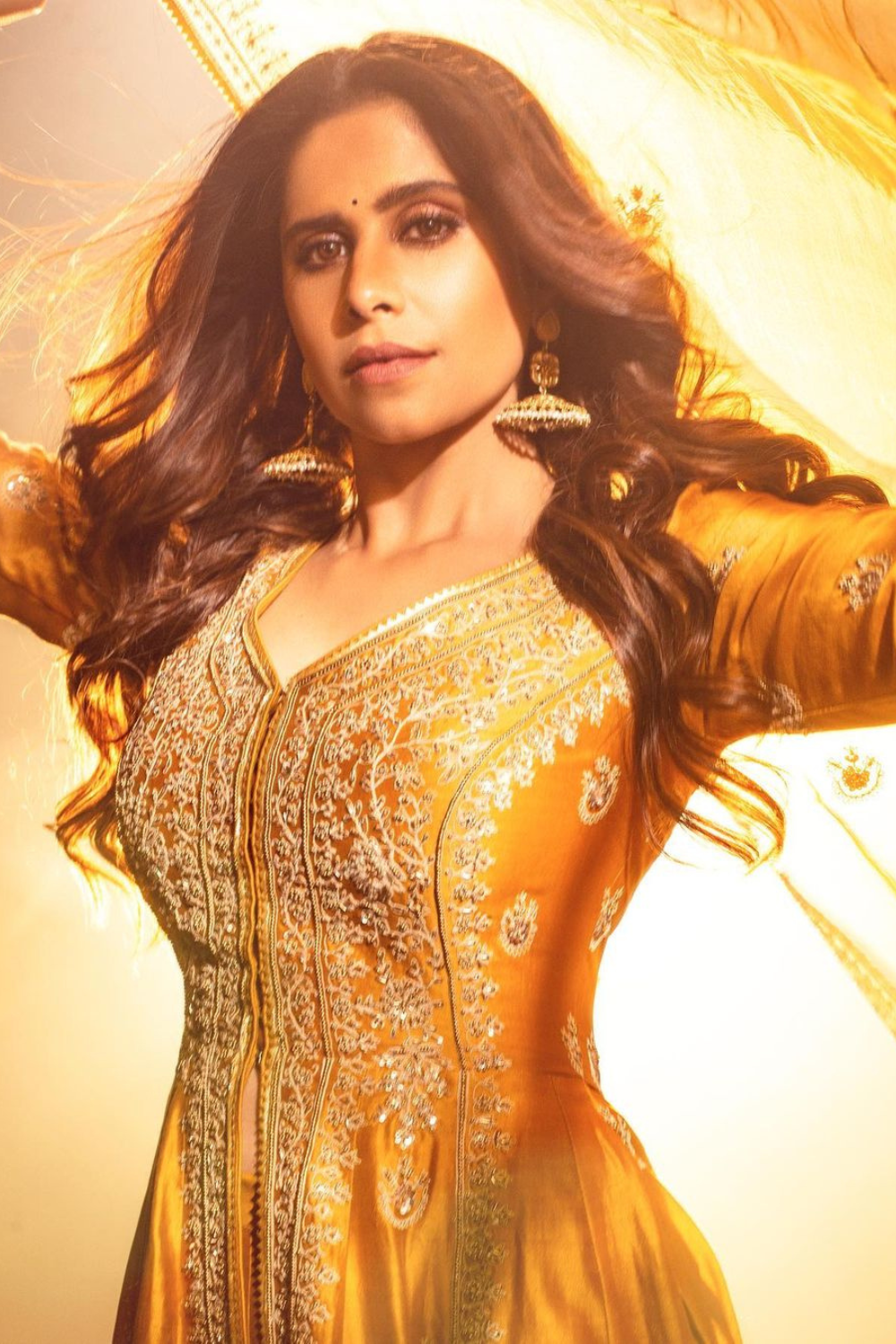 Featuring a mustard Chanderi Jacket and pant set paired with an organza base dupatta with gold dori and aari