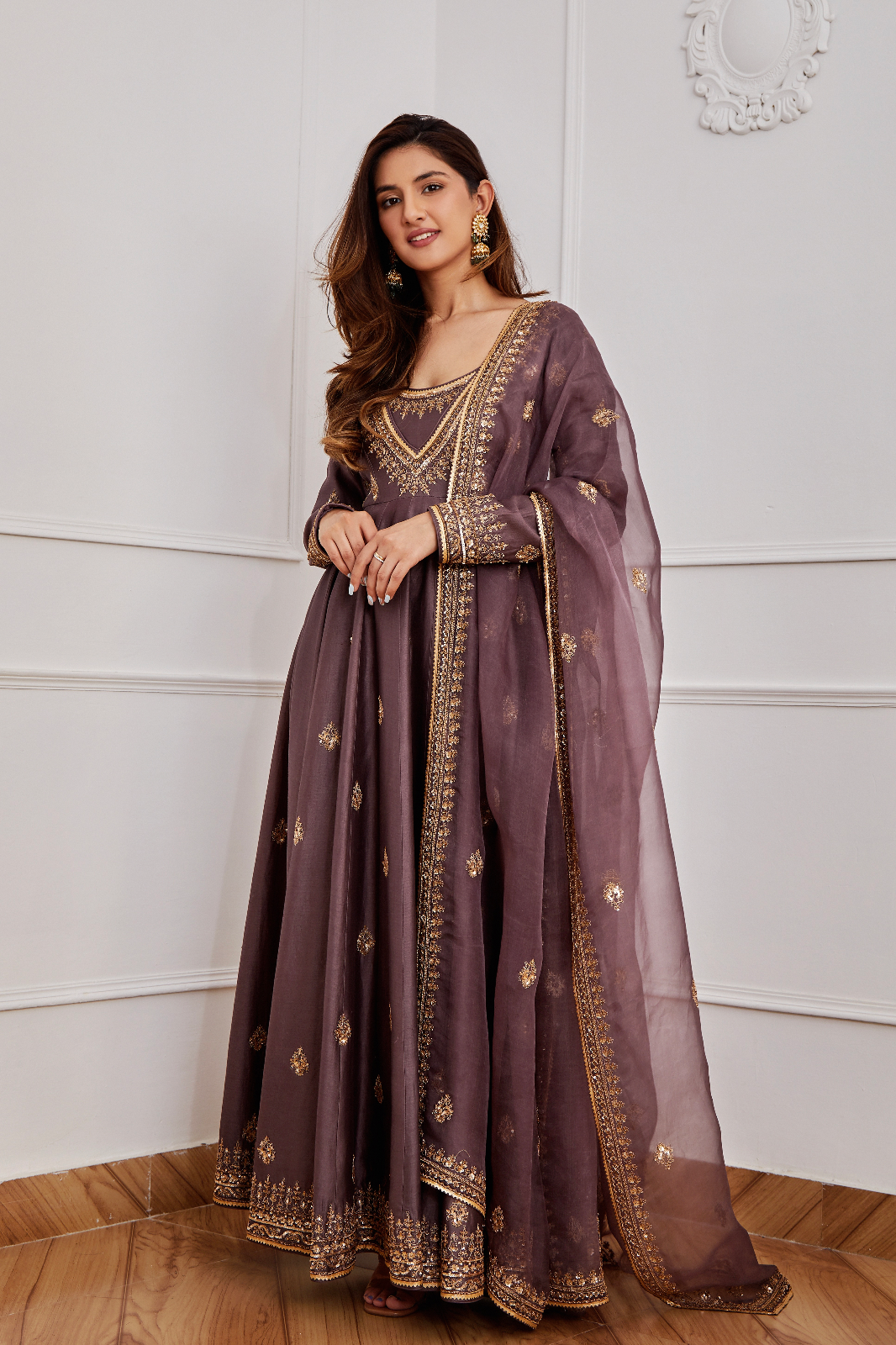 Featuring a dark purple Chanderi Anarkali paired with a cotton silk churidar and organza dupatta with gold dori and aari embroidery