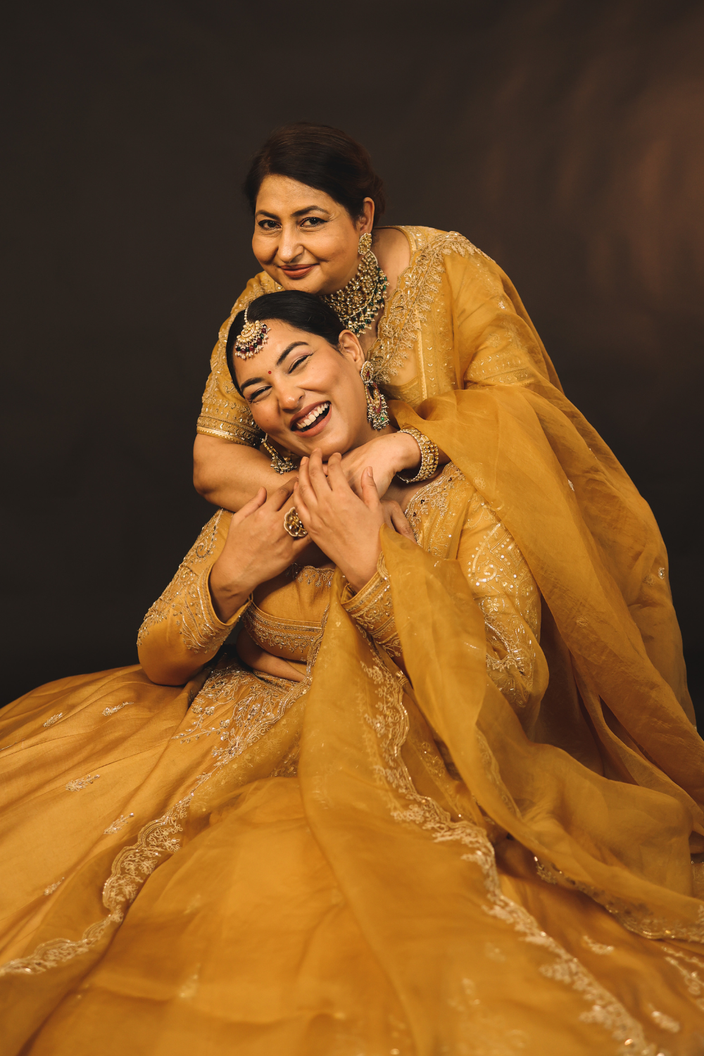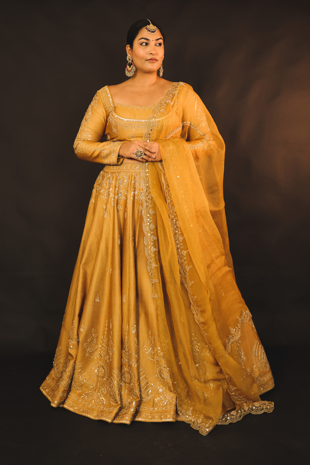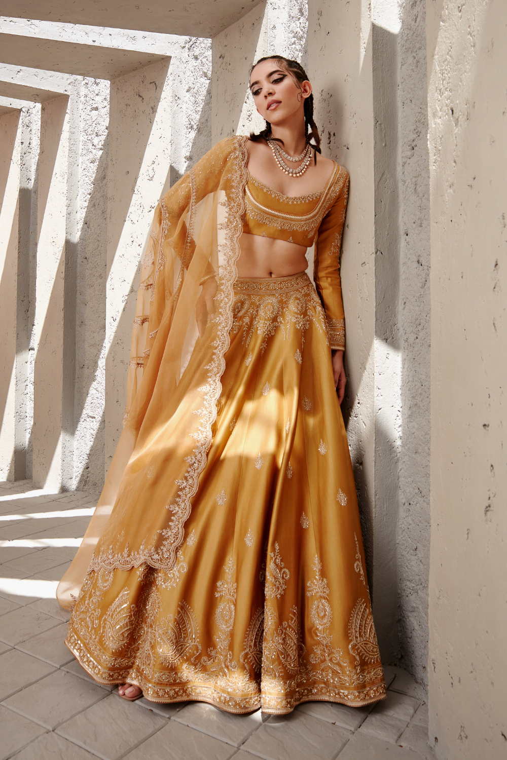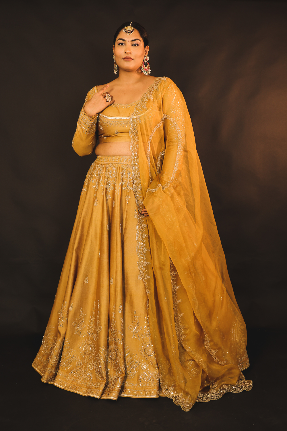 Featuring a mustard Chanderi Lehenga set paired with organza base dupatta with gold dori and aari embroidery