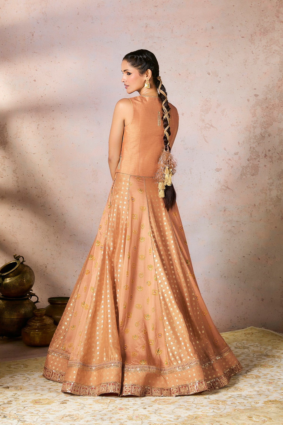 Lehenga- Lehenga comes with beautiful alternate foil printed kalis | Embellished with embroidered borders and edged with kinari | Side zip closure | Pocket detailing | Comes with attached Can Can Koti- Koti embellished with all over gold embroidery | 'V' neckline | Sleeveless | Center Front Opening