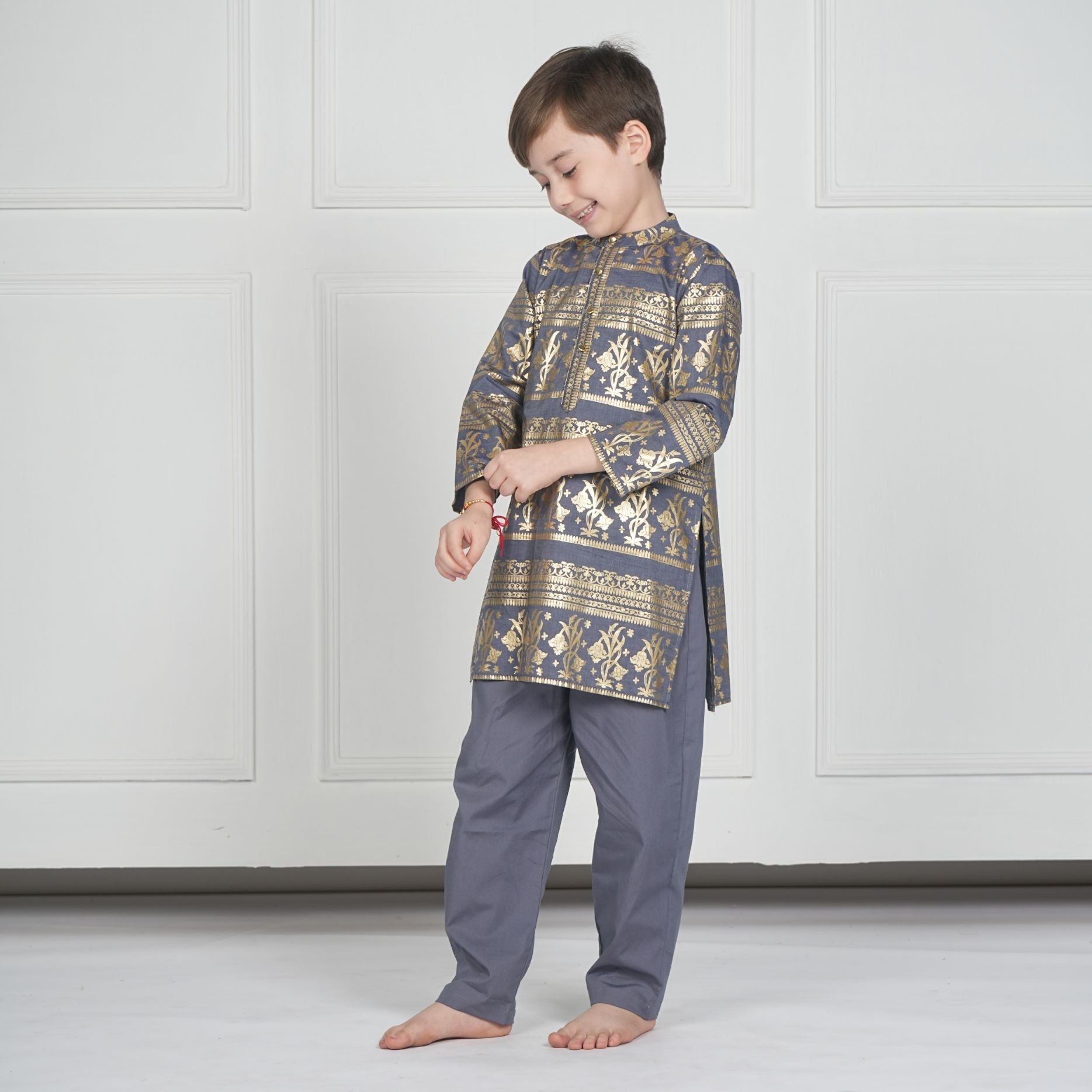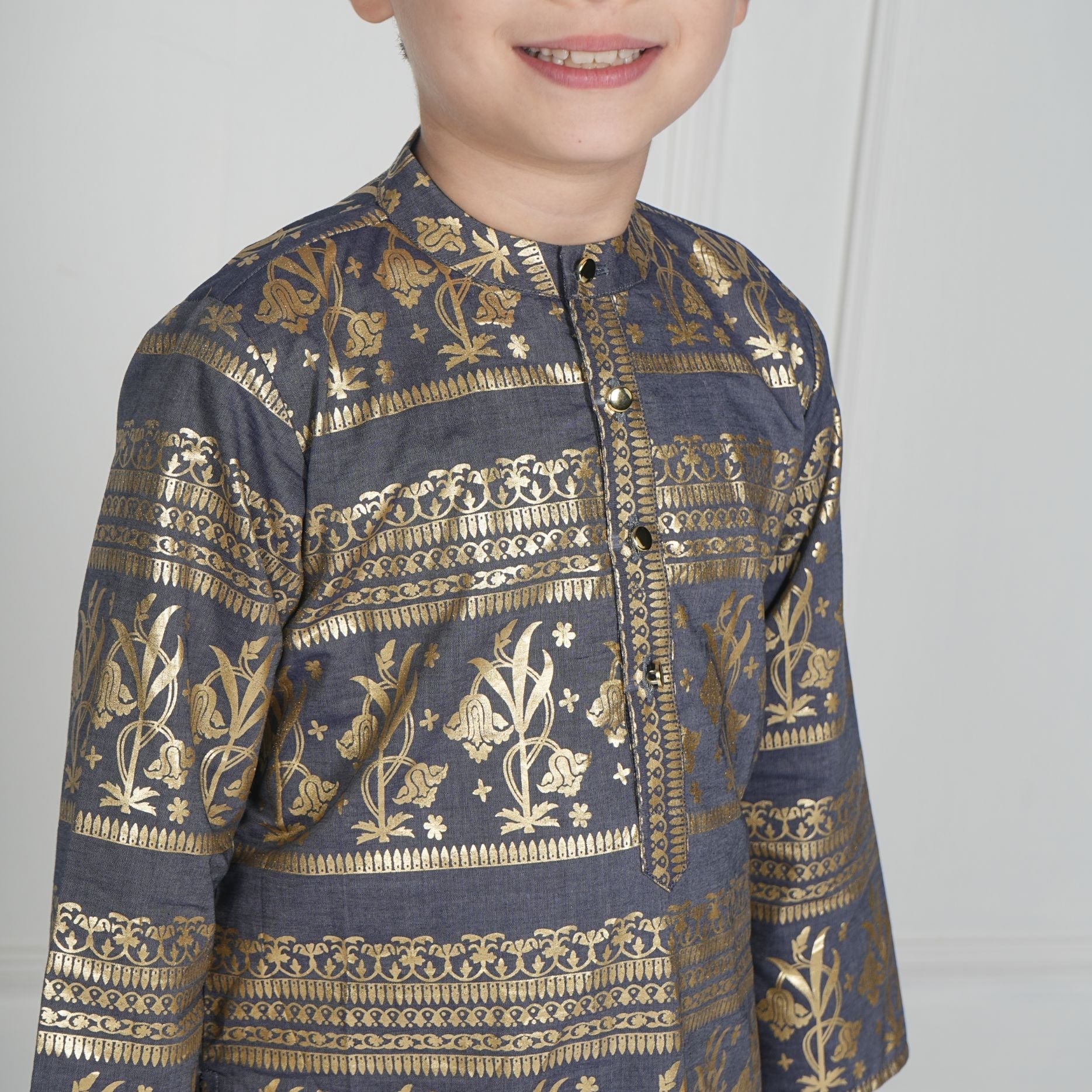 Sameer from Noora 3.0 is perfect for your little champ to cheer up this festive season. Set in the finest quality of cotton, this 2-piece set is designed to cast a smile so alluring you won’t be able to look away! The kurta features a regal foil print that will instantly transport you to royal festive vibes.
