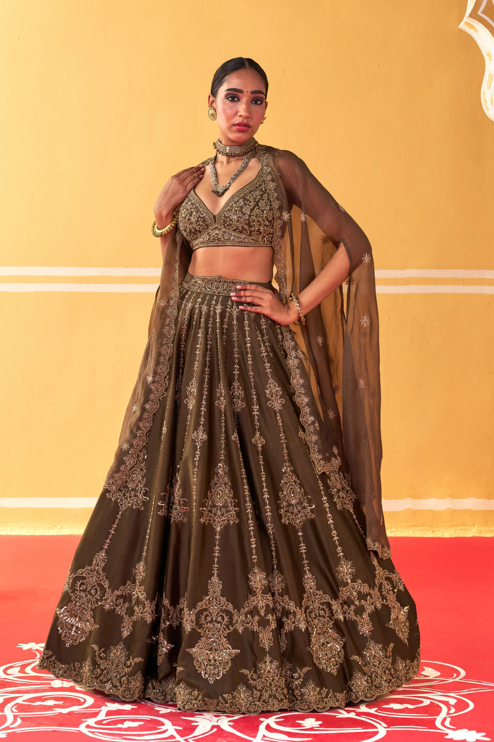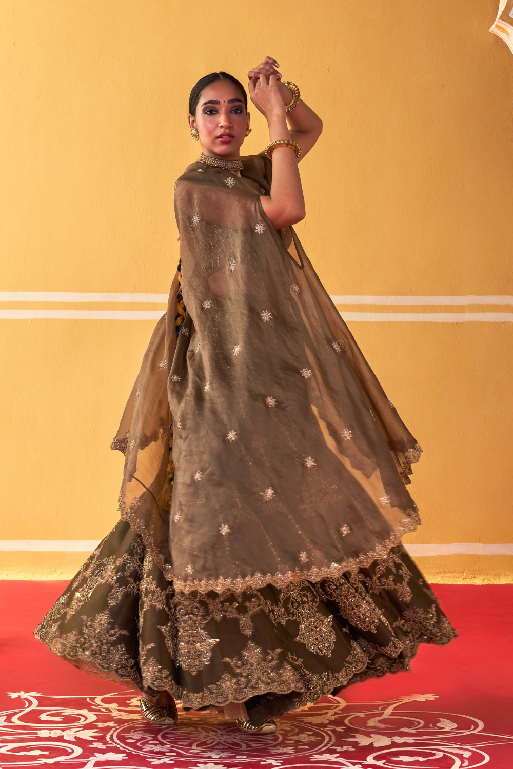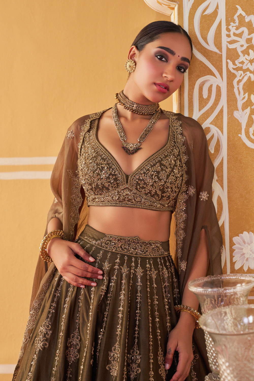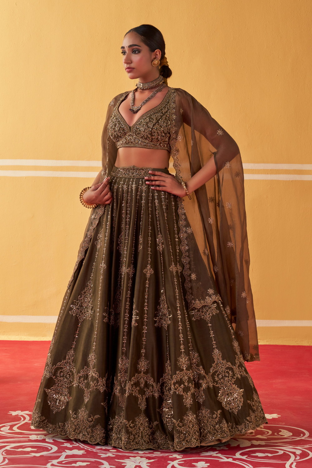 Featuring an olive green chanderi silk lehenga set paired with organza base cape with antique gold dori and embellished hand embroidery.