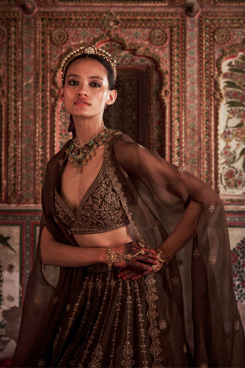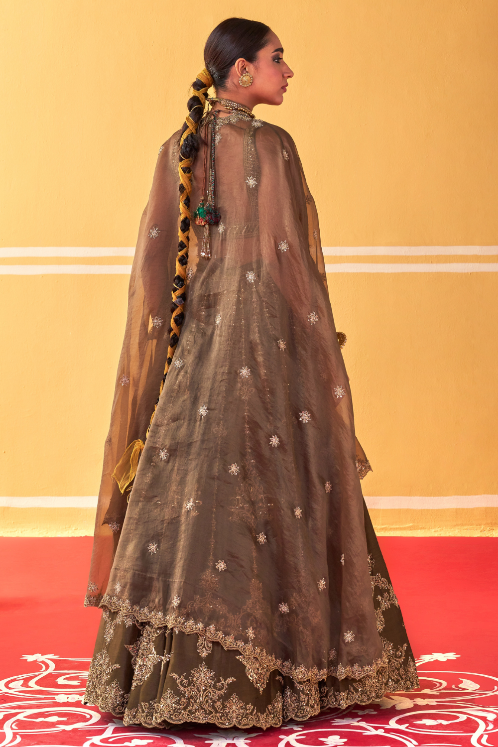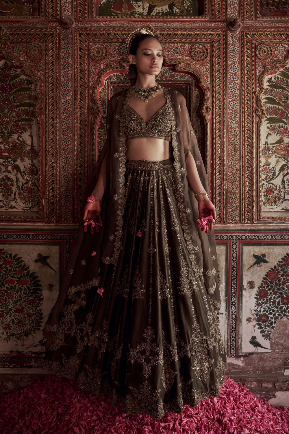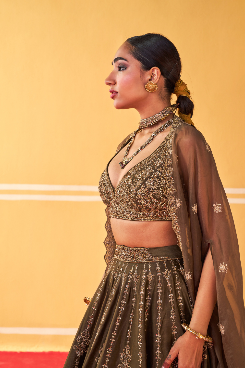 Featuring an olive green chanderi silk lehenga set paired with organza base cape with antique gold dori and embellished hand embroidery.