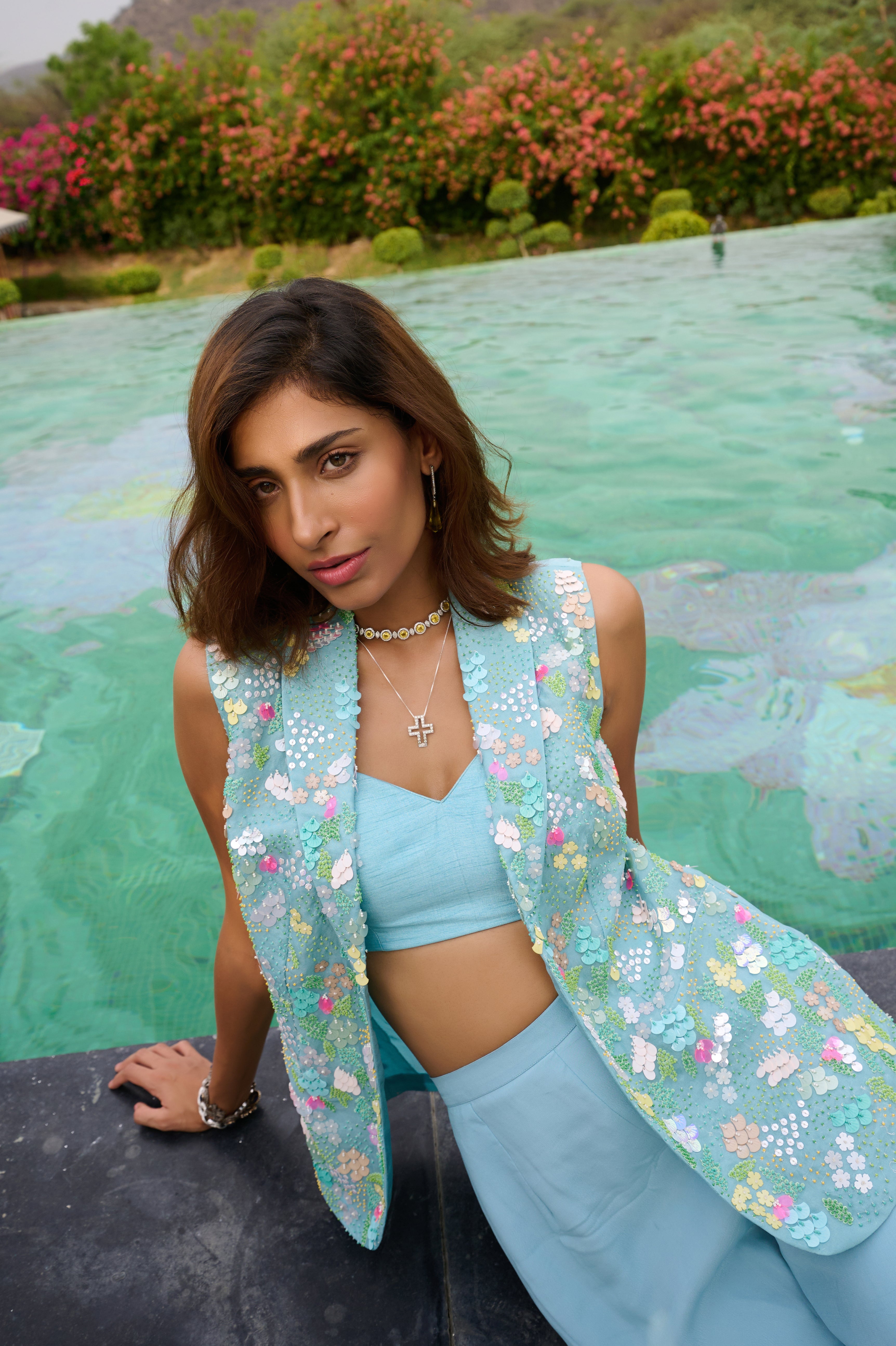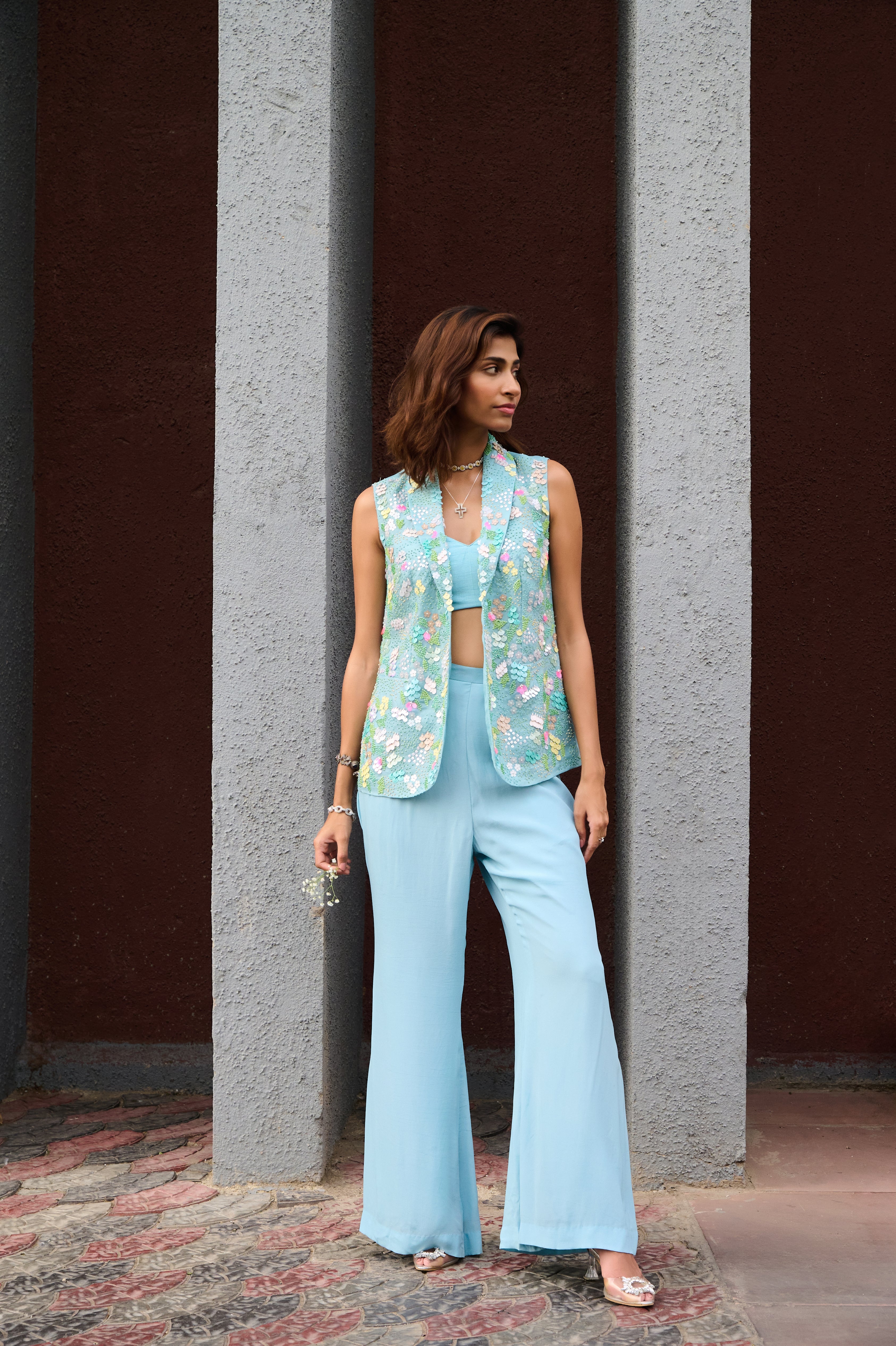 Powder blue organza jacket with colorful sequin and beads paired with a bustier and pants.