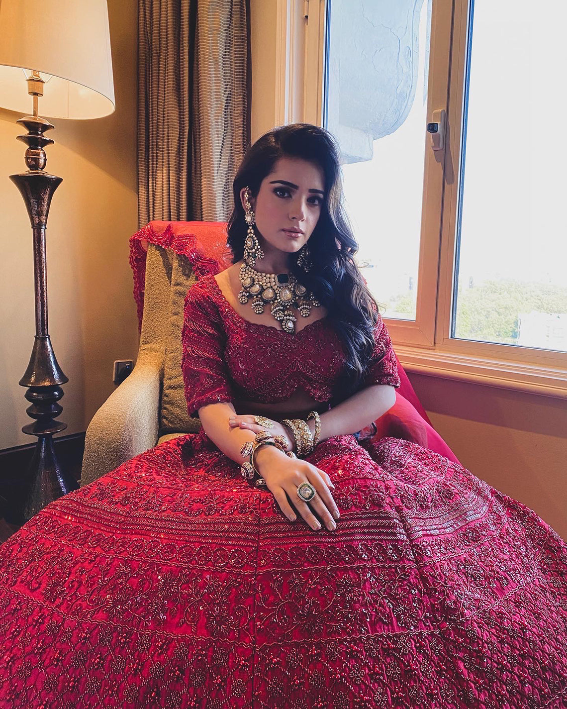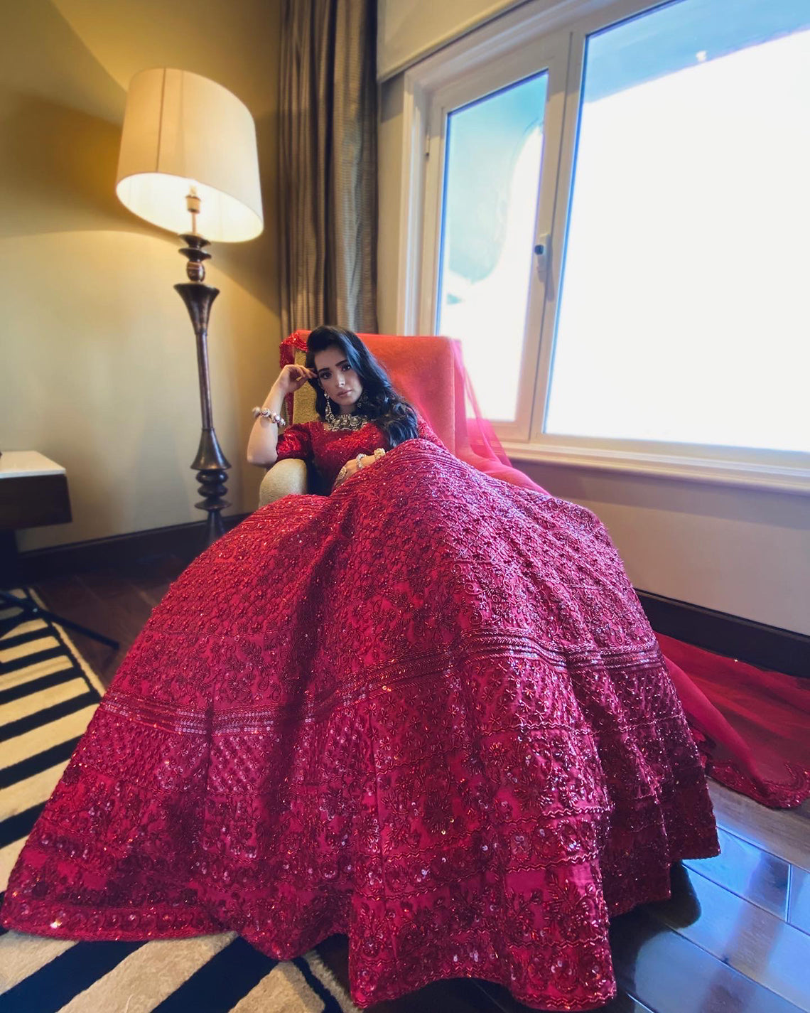 The crimson Mirielle lehenga set is a pure raw silk 120 gms modern bridal 12 kalis set with heavy floral geometric embroidery throughout each kalis. Paired with a heavily floral embroidered scoop V neck top, and paired with a pure organza scallop floral dupatta.