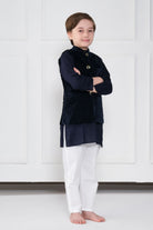 - Navy blue rayon kurta, white cotton pajama, and navy blue sleeveless velvet jacket.