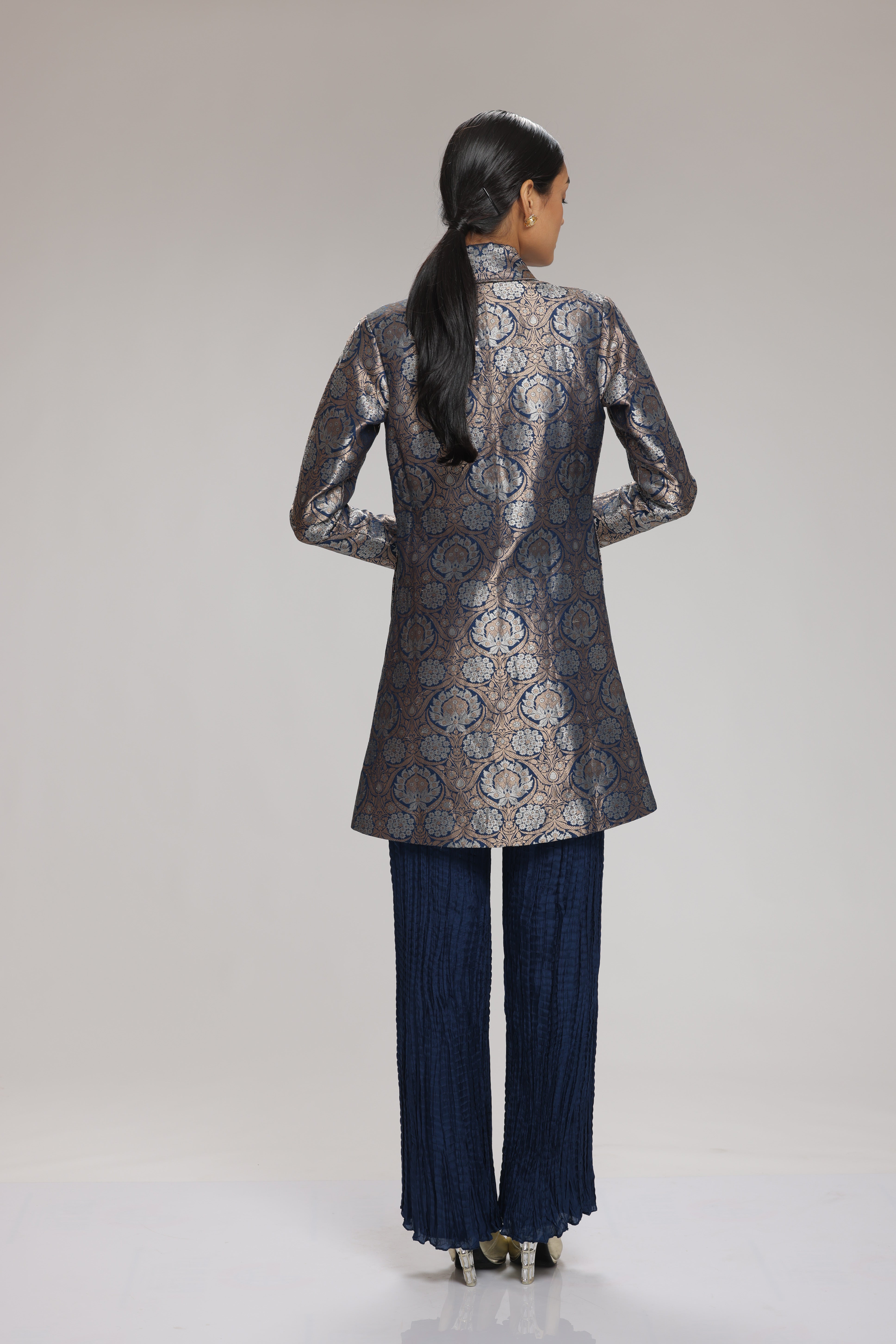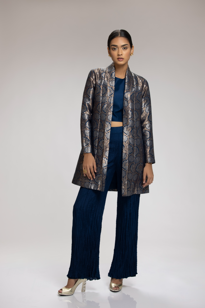 Navy Blue Banarasi brocade jacket paired with crushed Habutai silk pants and a silk crop top.