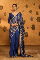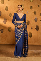 Details: Draped in regal elegance, this sapphire blue saree is adorned with Midas touch gold foil along the palla, featuring a graceful cluster of motifs arranged in lines. The pleats are framed with a gold foil border, adding subtle sheen with every movement. Paired with it is a full-sleeved blouse, detailed with delicate scalloped edges and a distinctive coin trim at the wrist hem, lending a touch of heritage charm to this contemporary classic.