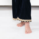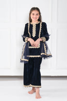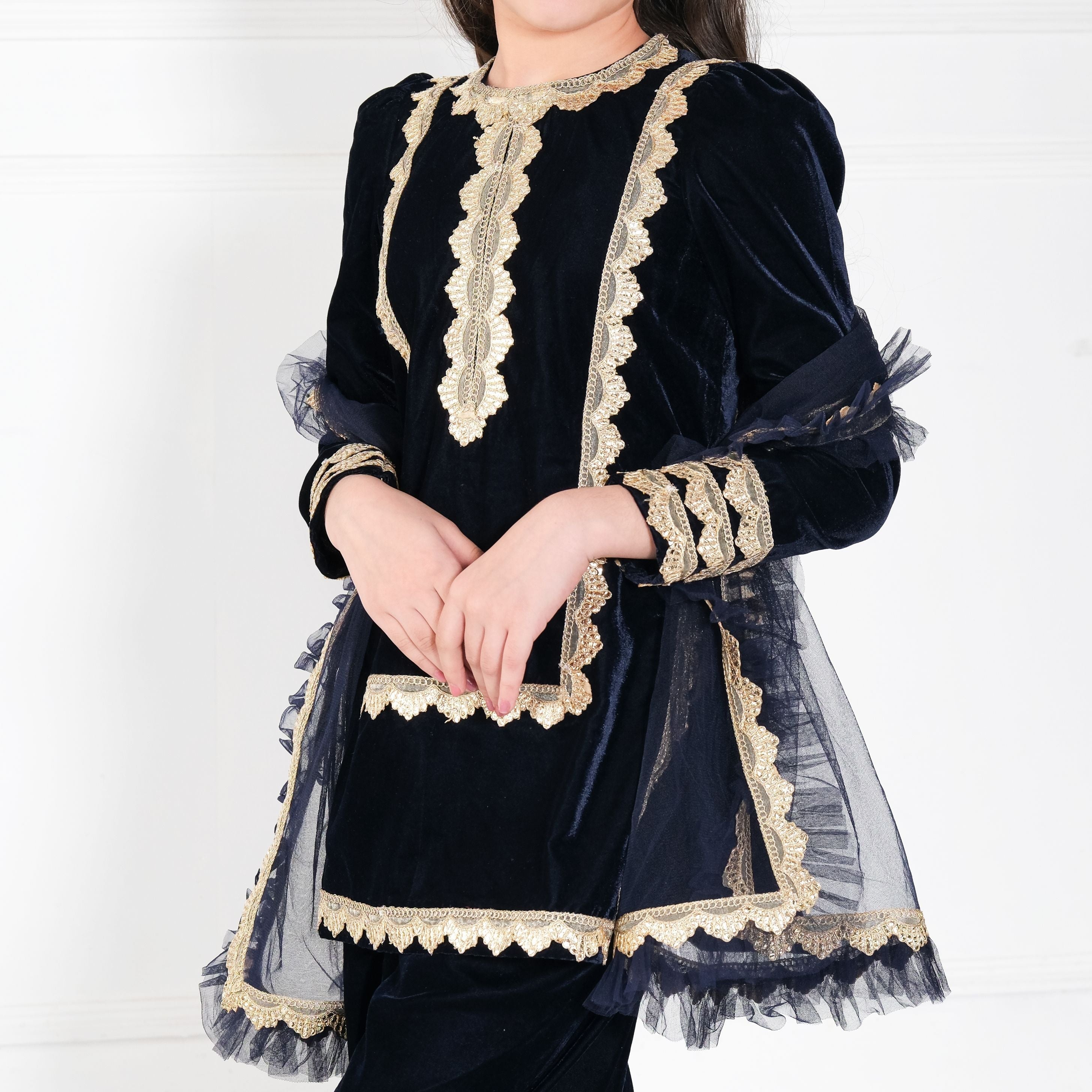 Set of 3 - Top, Lowers, and Dupatta. Made in navy blue velvet, embellished with beautiful gold gota. Soft net dupatta with frills and gota.