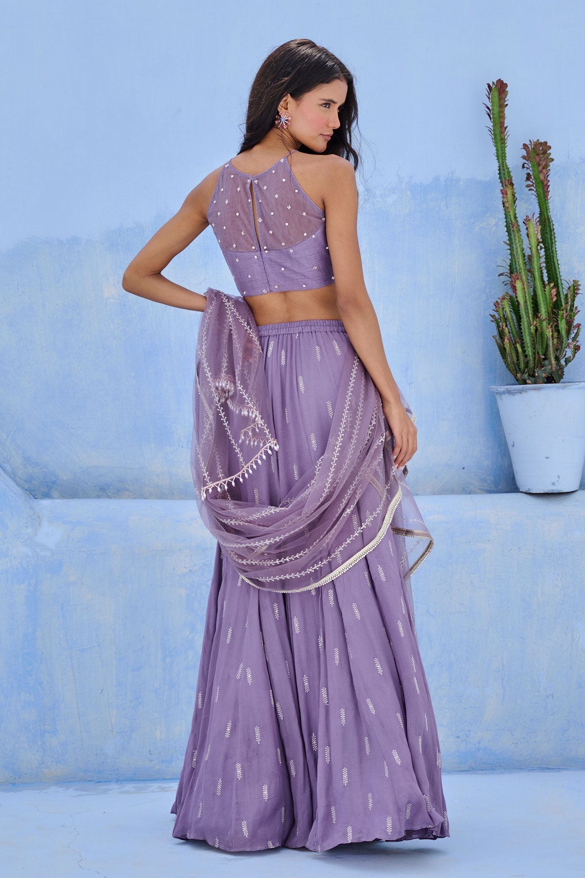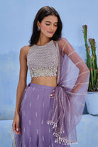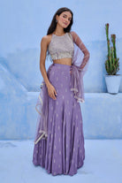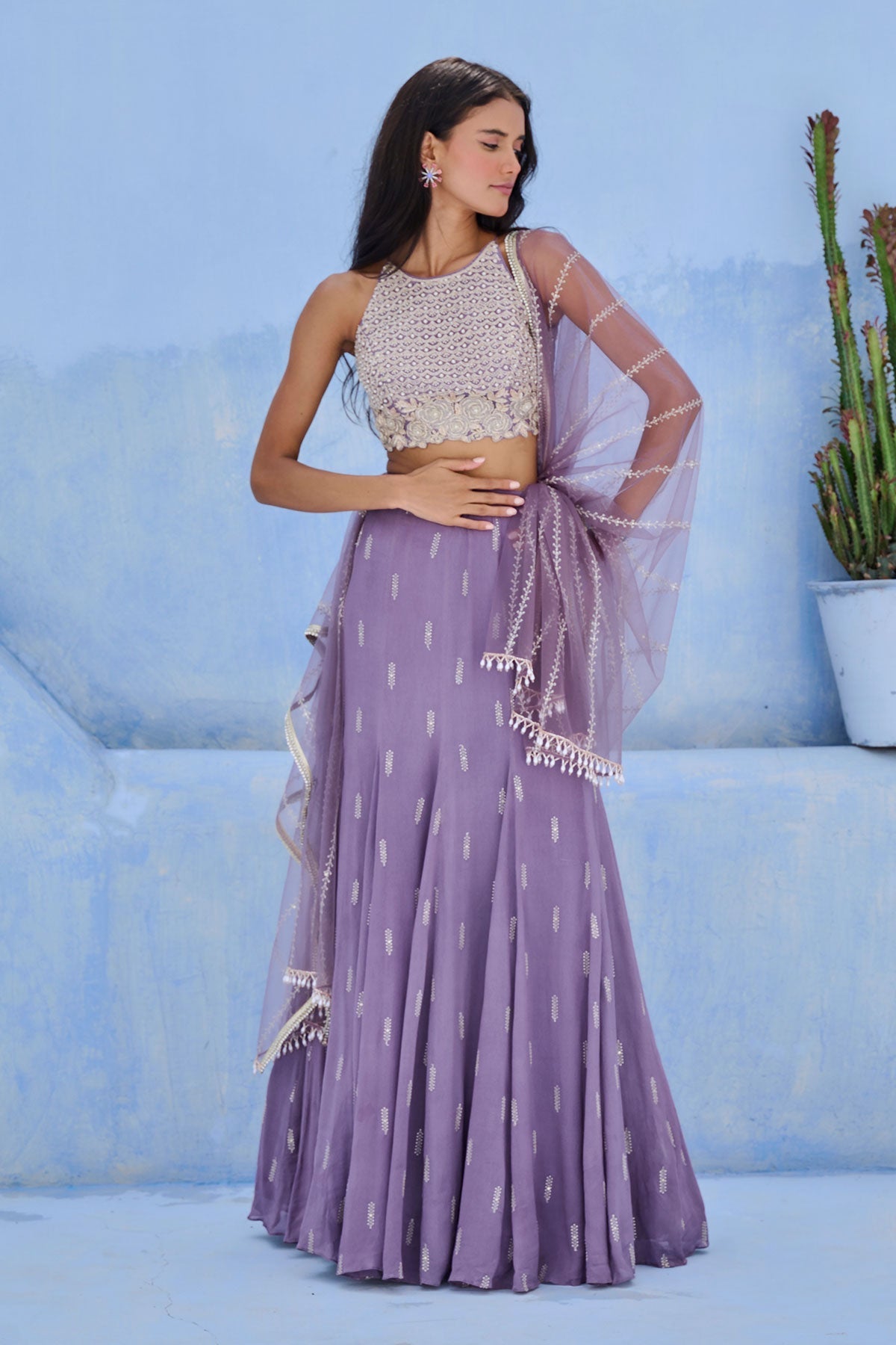 Sequence embellished gusset skirt paired with glassbeads and pearl embroidered halter neck blouse and embellished tulle dupatta.