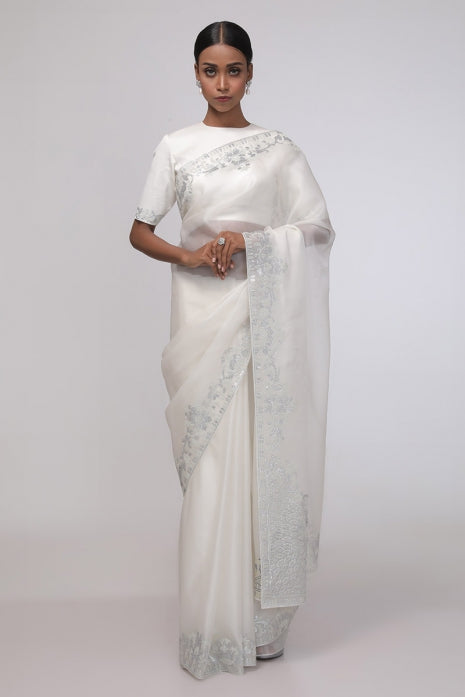 A White and Pearl rhinestone embellished Silk Organza saree, adorned. This saree is elegantly paired with a Twill Satin blouse, where the sleeves are accentuated with exquisite rhinestones.