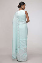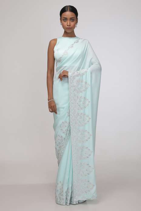 A White Pearl and Silver rhinestone embellished scalloped pallu Twill Satin saree. This exquisite saree features intricate detailing along the pallu, exuding sophistication. The ensemble is completed with a complementary blouse.