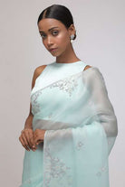 A White Pearl and Silver rhinestone border and buti all-over design half-n-half Organza Satin and Twill Satin saree. This exquisite saree beautifully combines two luxurious fabrics and intricate embellishments. The ensemble is elegantly completed with a blouse, resulting in a captivating portrayal of modern elegance and opulence.