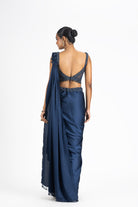 Midnight Blue Satin Draped Saree With A Blouse Embroidered In Gunmetal Beads, Metallics, And Crystals, With 3-D Flowers Placed On The Shoulder.