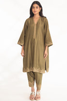 A Henna Green kurta set paired with salwar, embellished with intricate antique gold zardozi embroidery.