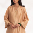A Beige kurta set paired with salwar, embellished with intricate antique gold zardozi embroidery.