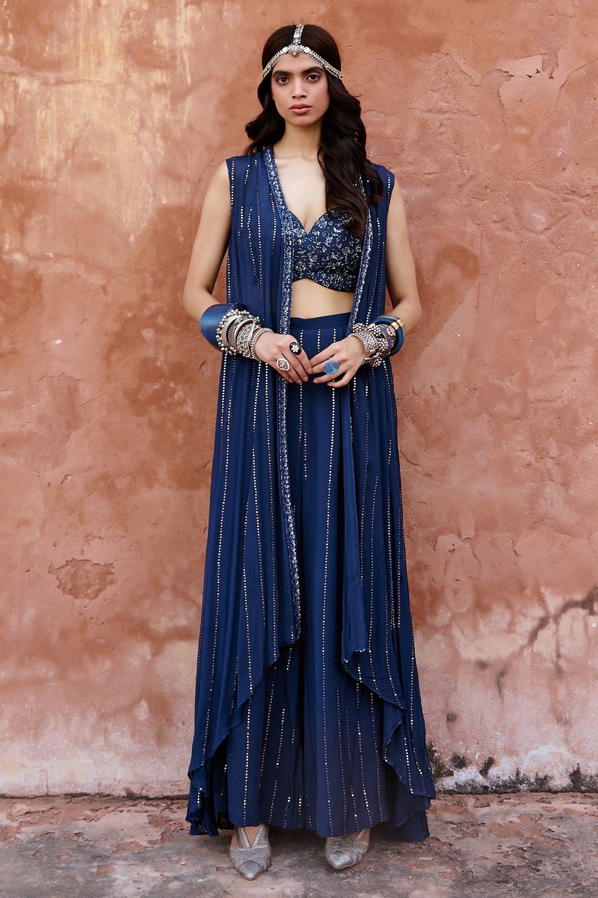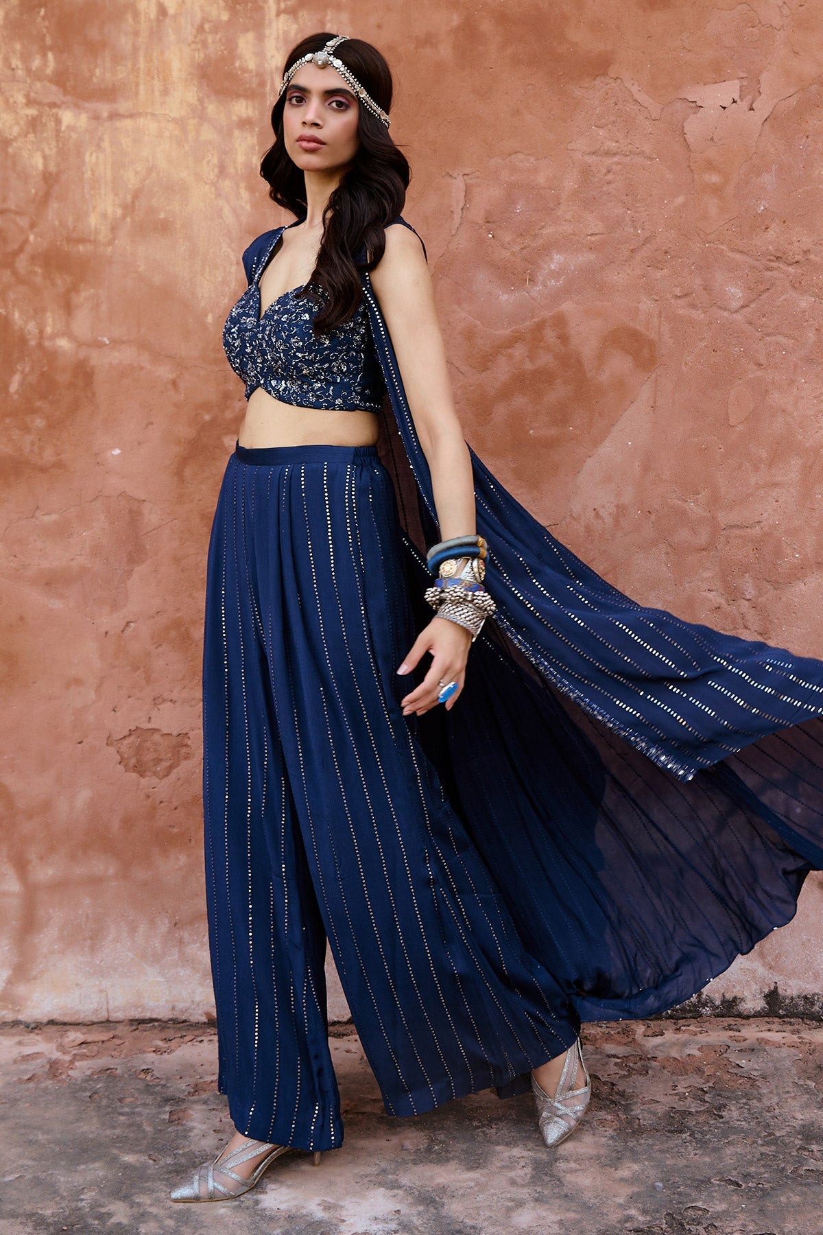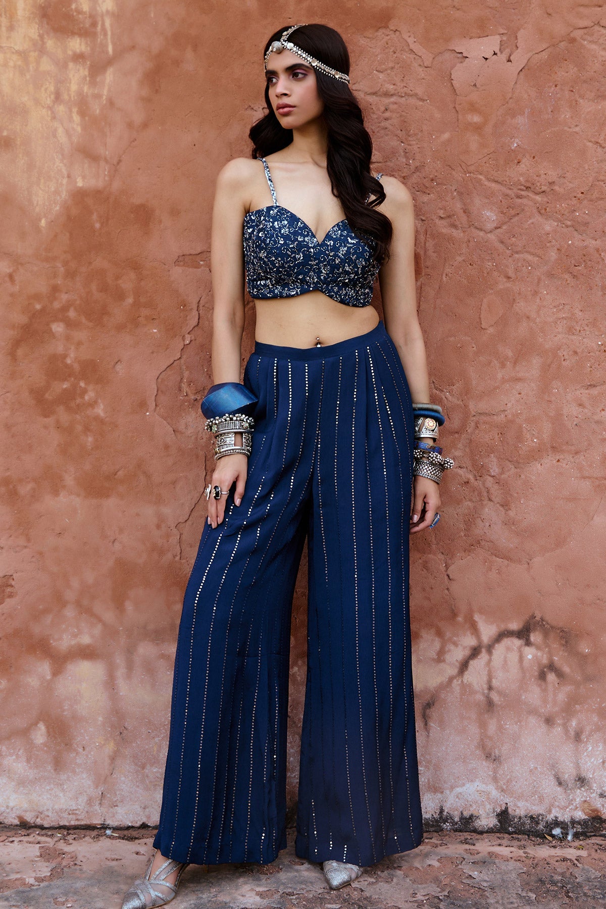Georgette pants and jacket paired with sequins and a glass beads blouse.
