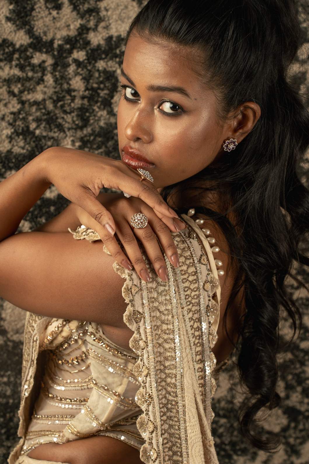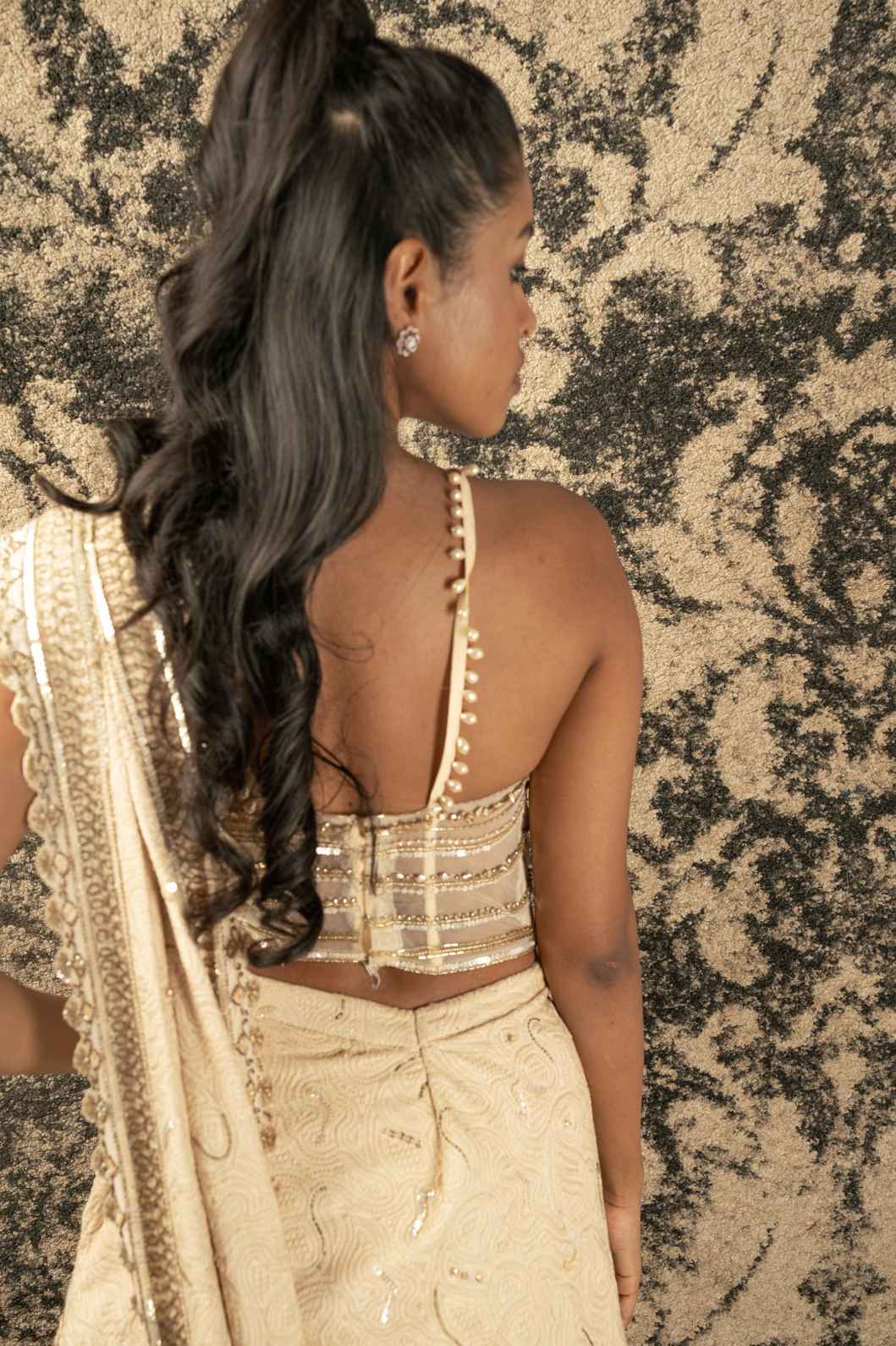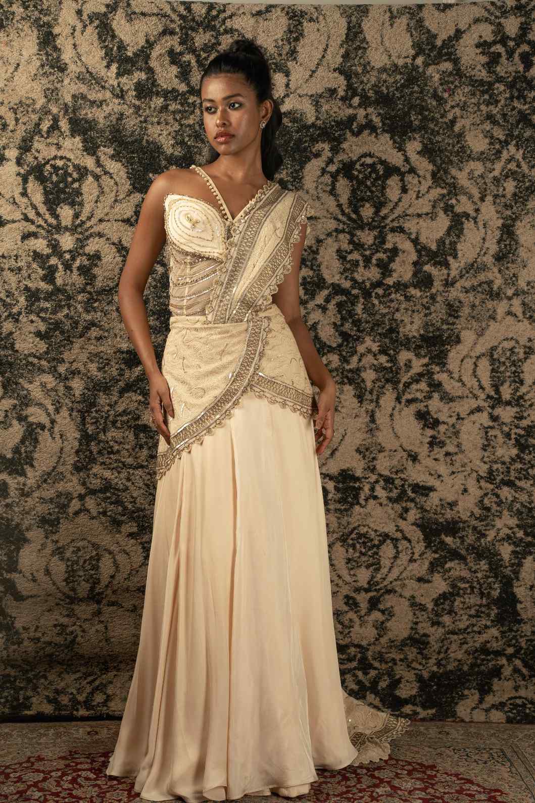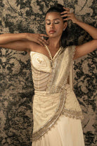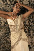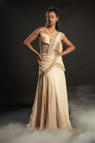 This light gold pre-draped saree is a vision of modern elegance. The skirt, fashioned from luxurious silk satin, offers a lustrous drape that accentuates the figure with grace. The blouse, crafted from delicate net fabric, adds a touch of sheer sophistication to the ensemble. Draped elegantly over the shoulder is a luckhnawi silk drape, adorned with intricate embroidery, exuding timeless charm and allure. Together, these elements create a seamless and effortlessly chic look, perfect for any occasion where sophistication meets contemporary style.