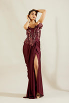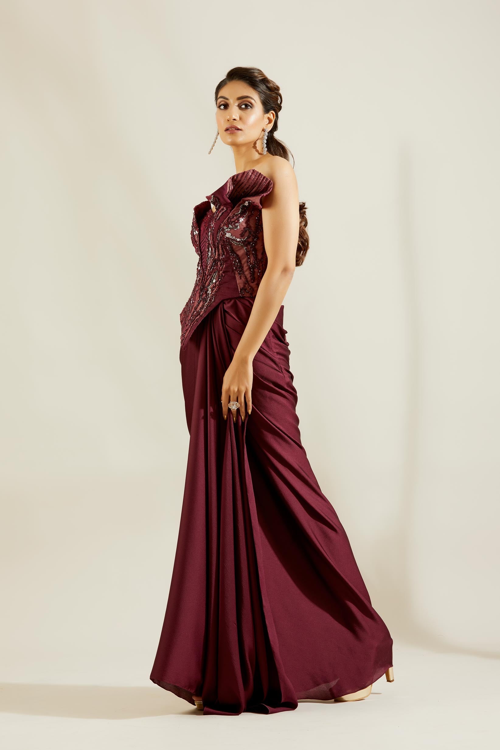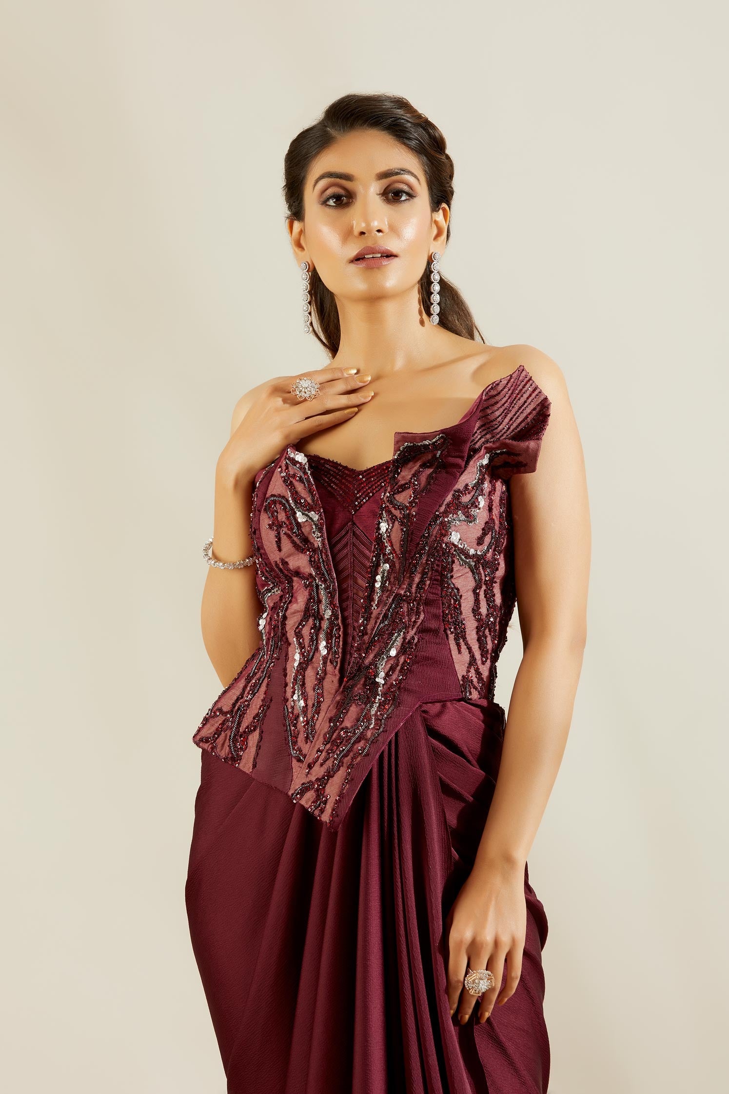 wine drape gown saree comes with vivtorian corset blouse. with brush stroke embellishments and placement embroidery