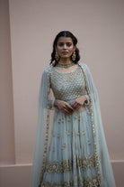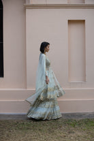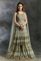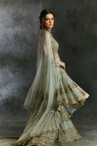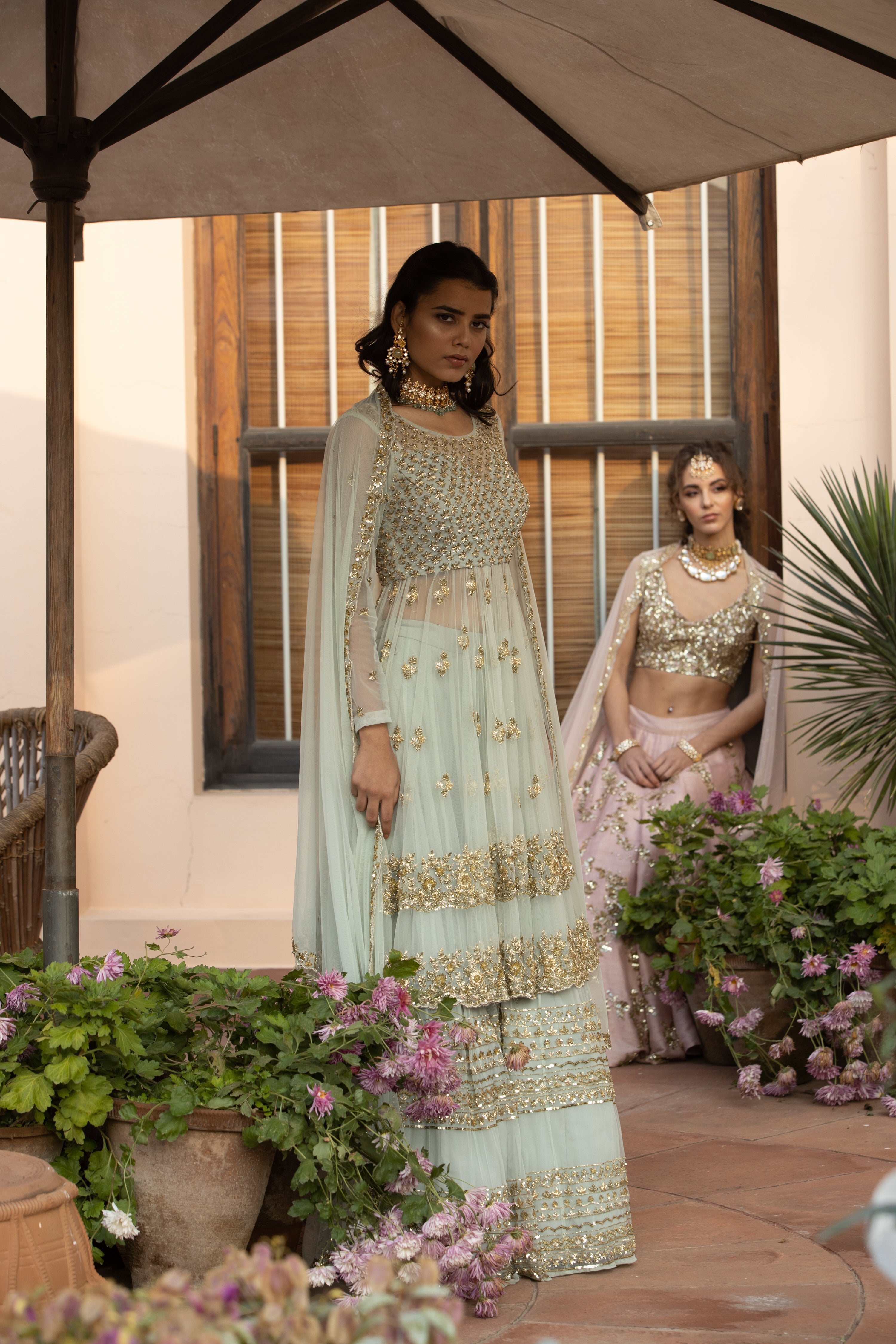 Featuring a SEA GREEN ZARI AND SEQUIN SHARARA SET IN Net.