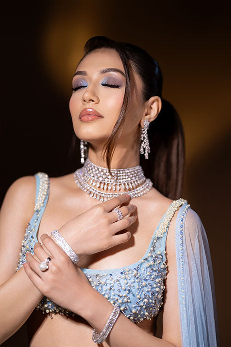 This three-piece Sea Spray Mermaid Lehenga includes a blouse, skirt, and a versatile dupatta or cape. Customizable neckline, sleeve length, and color options make it uniquely yours, adding an ocean-inspired elegance to your bridal or bridesmaid attire. Connect on Whatsapp to customise