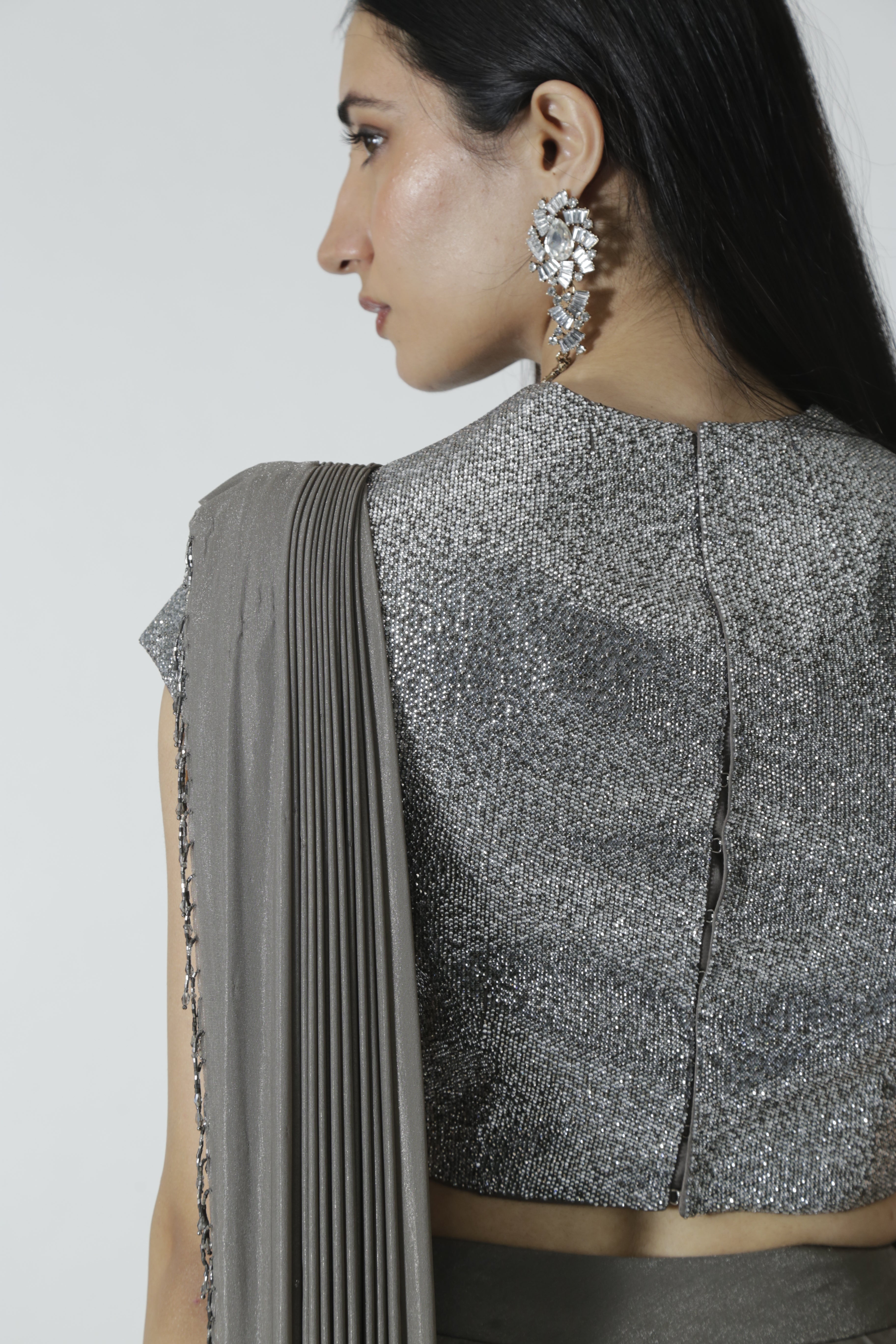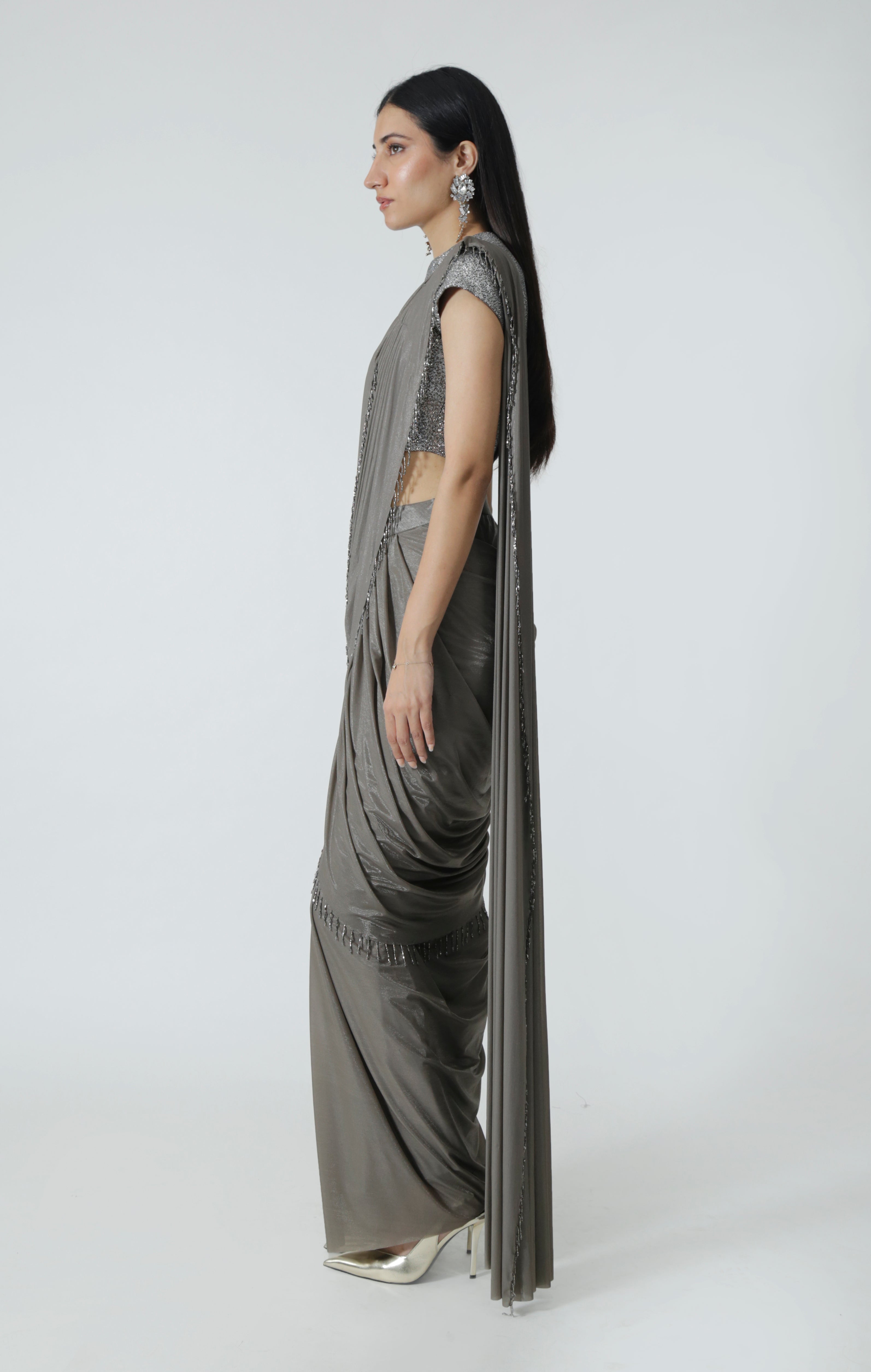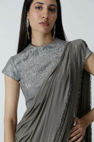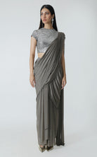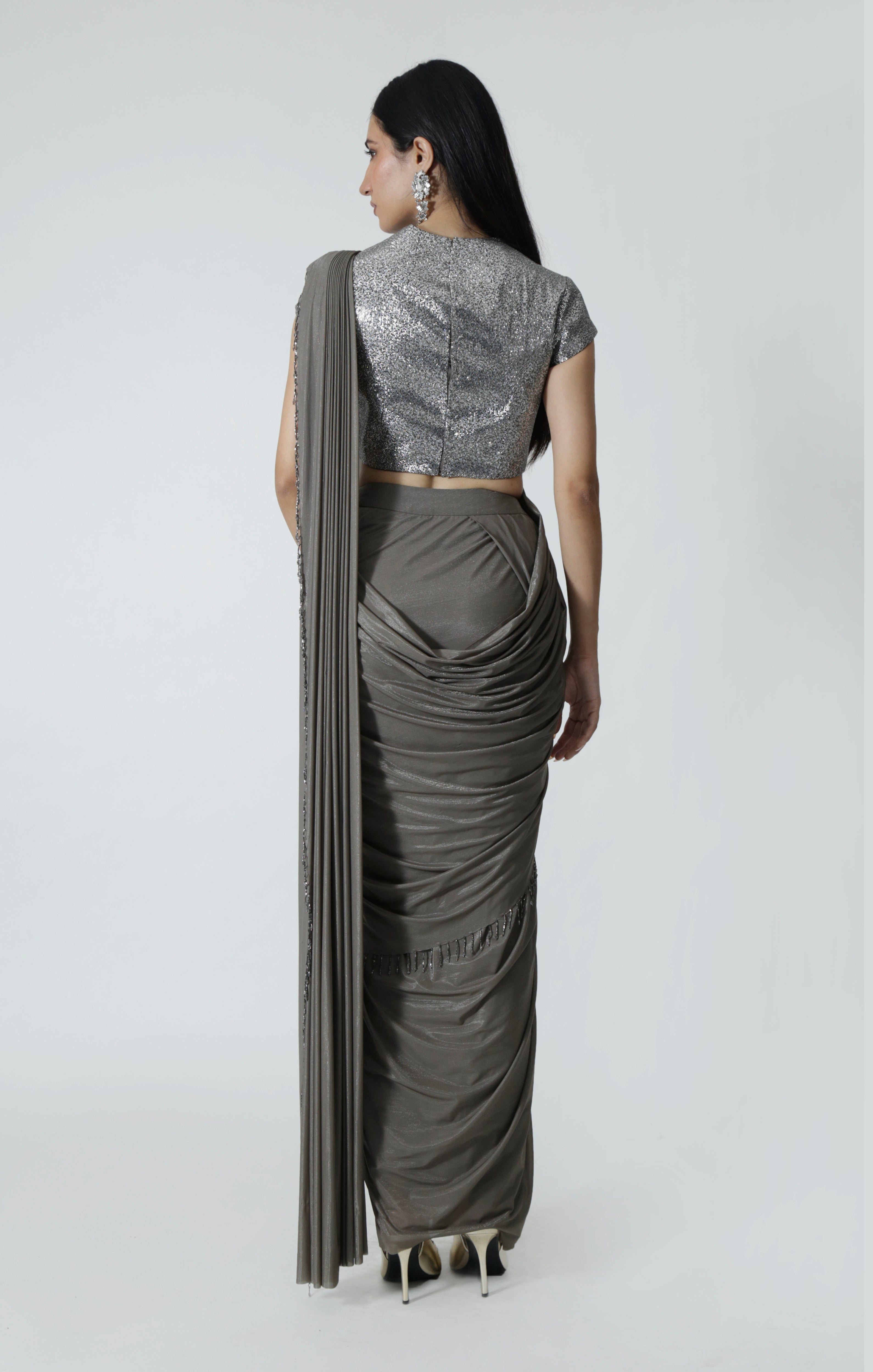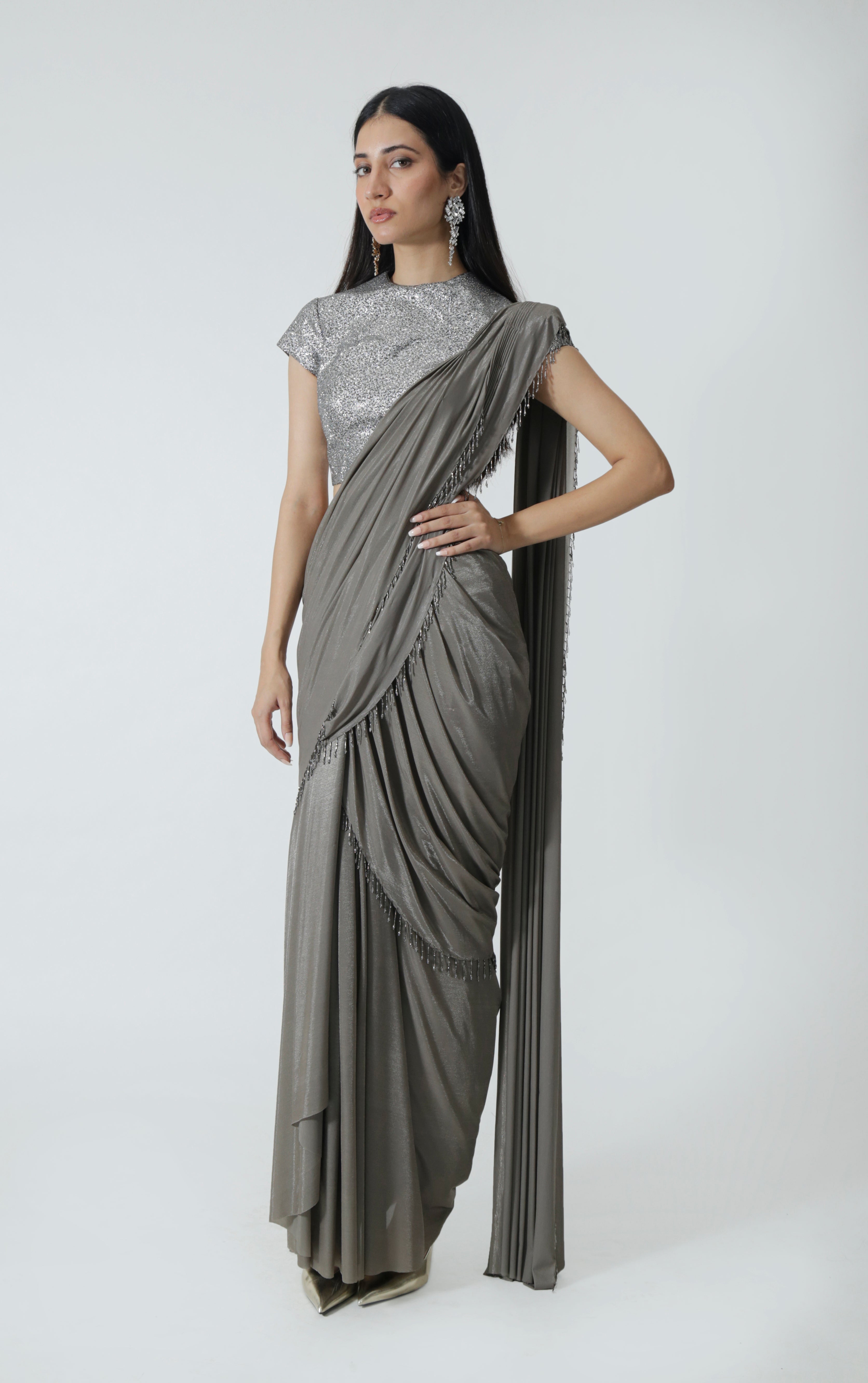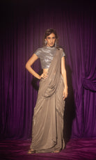 A Cement Brown layered pallu pre-draped lycra saree, adorned with tassels, paired with a dazzling rhinestones encrusted blouse.