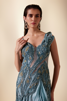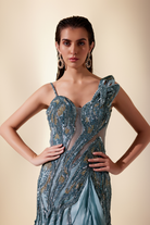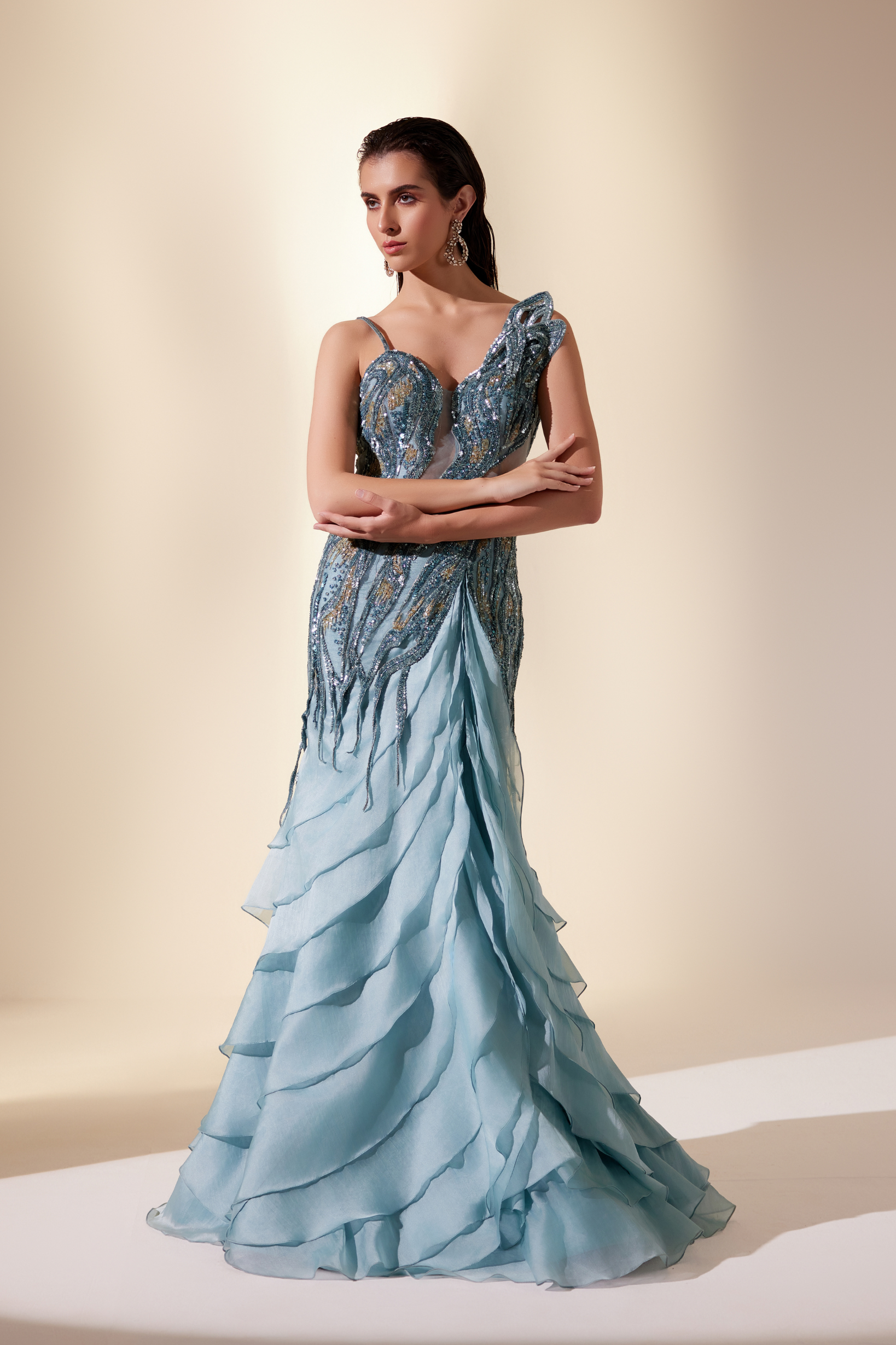 Stellar gown with delicately layered skirt embellished with delicate sequins that twinkle like distant stars.
