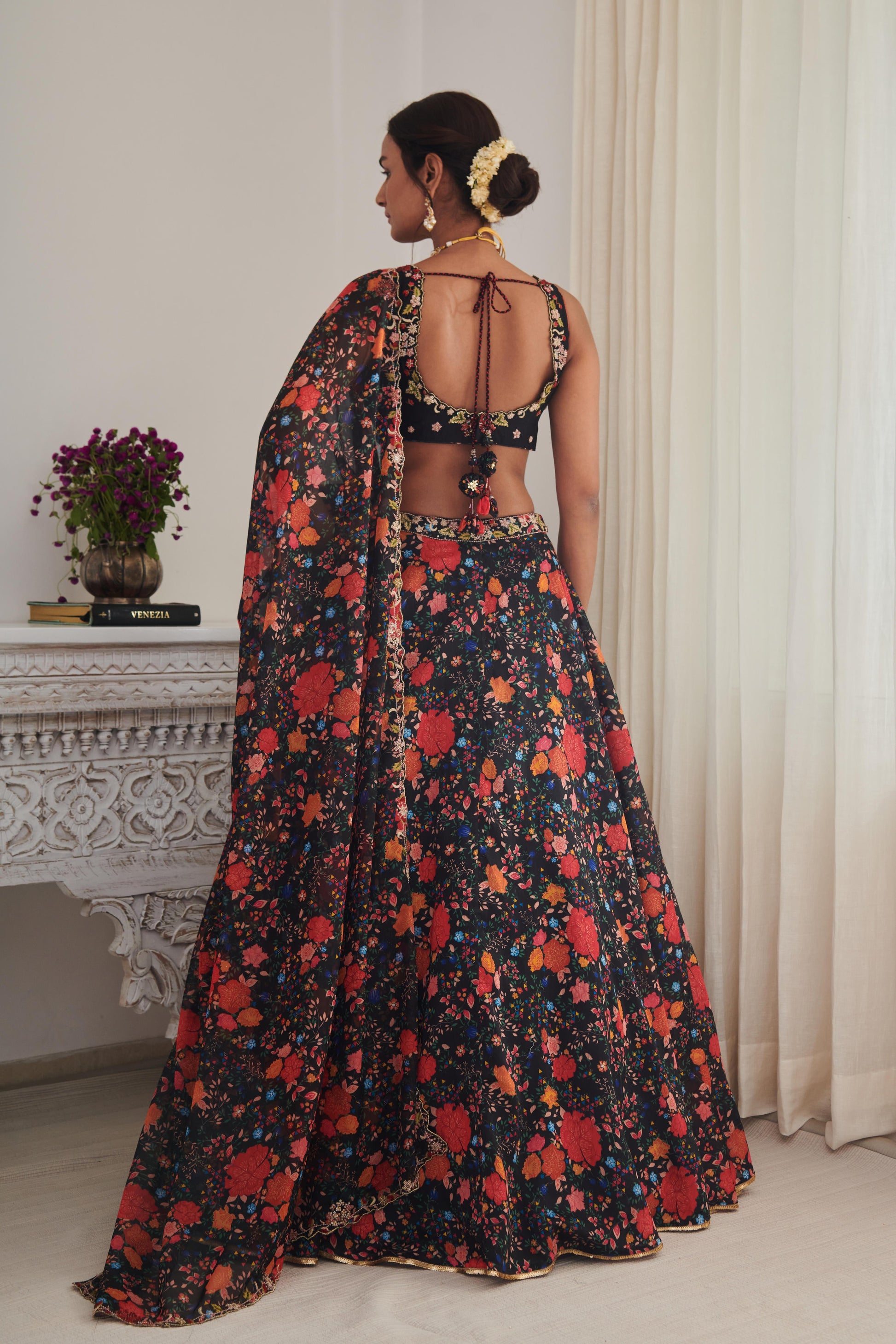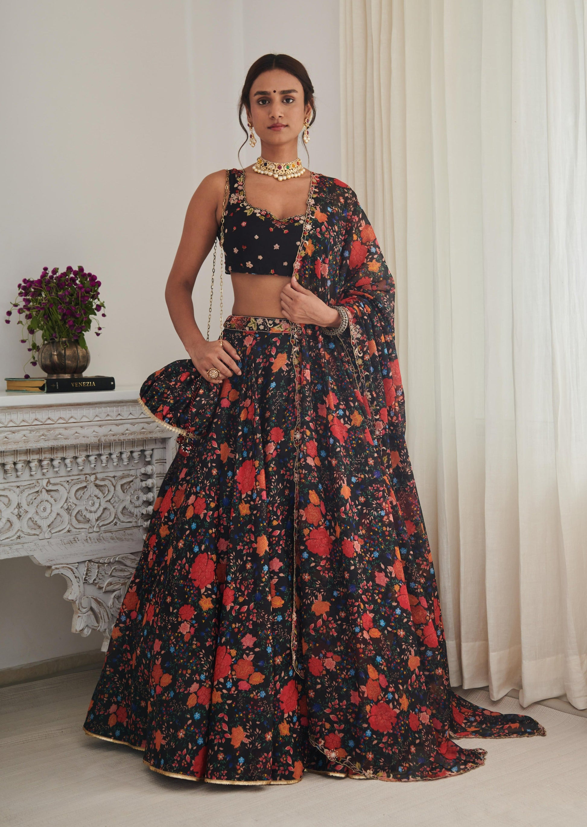 Black floral printed lehenga with multicoloured floral hand embroidery comes with cut sleeves blouse and printed embroidered dupatta.