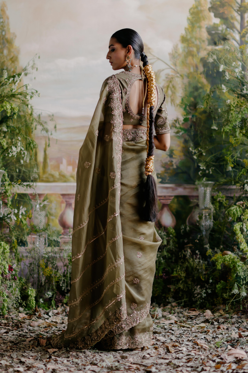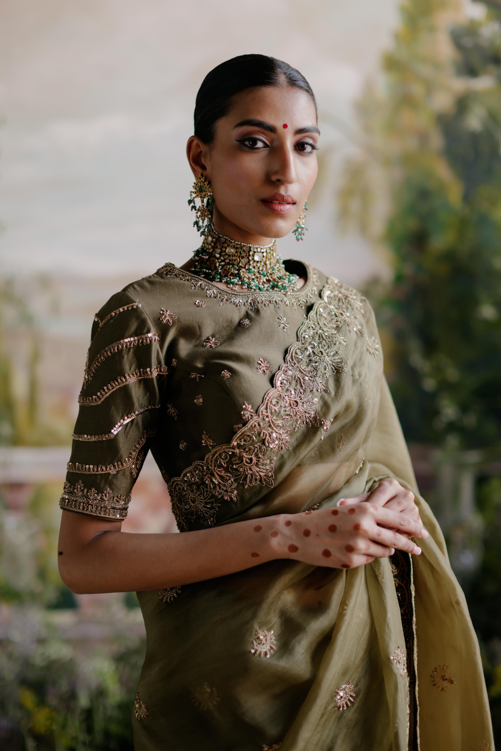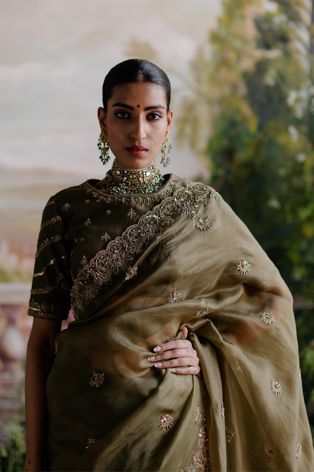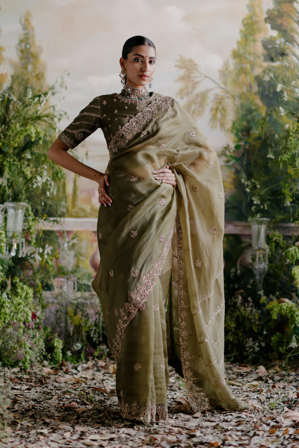 Featuring an olive green organza saree paired with a chanderi silk blouse with antique gold dori, aari and embellished hand work.
