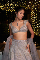 This exquisite women's ensemble in ash grey is crafted from luxurious Habutai silk, offering an elegant blend of tradition and contemporary design. The sleeveless blouse is a masterpiece, adorned with intricate silver handwork featuring sequin, cutdana, and zari, delicately embellished with silver pearls for added glamour. Paired with a stunning lehenga, the garment features intricate, heavy handwork that cascades from the waist to the thighs, while delicate silver leaves and crystals create a mesmerizing, shimmering effect. The ensemble is completed with a graceful net dupatta, adding a soft, ethereal touch to the look. Perfect for weddings or grand occasions, this outfit radiates opulence and sophistication, ensuring you stand out with timeless beauty.