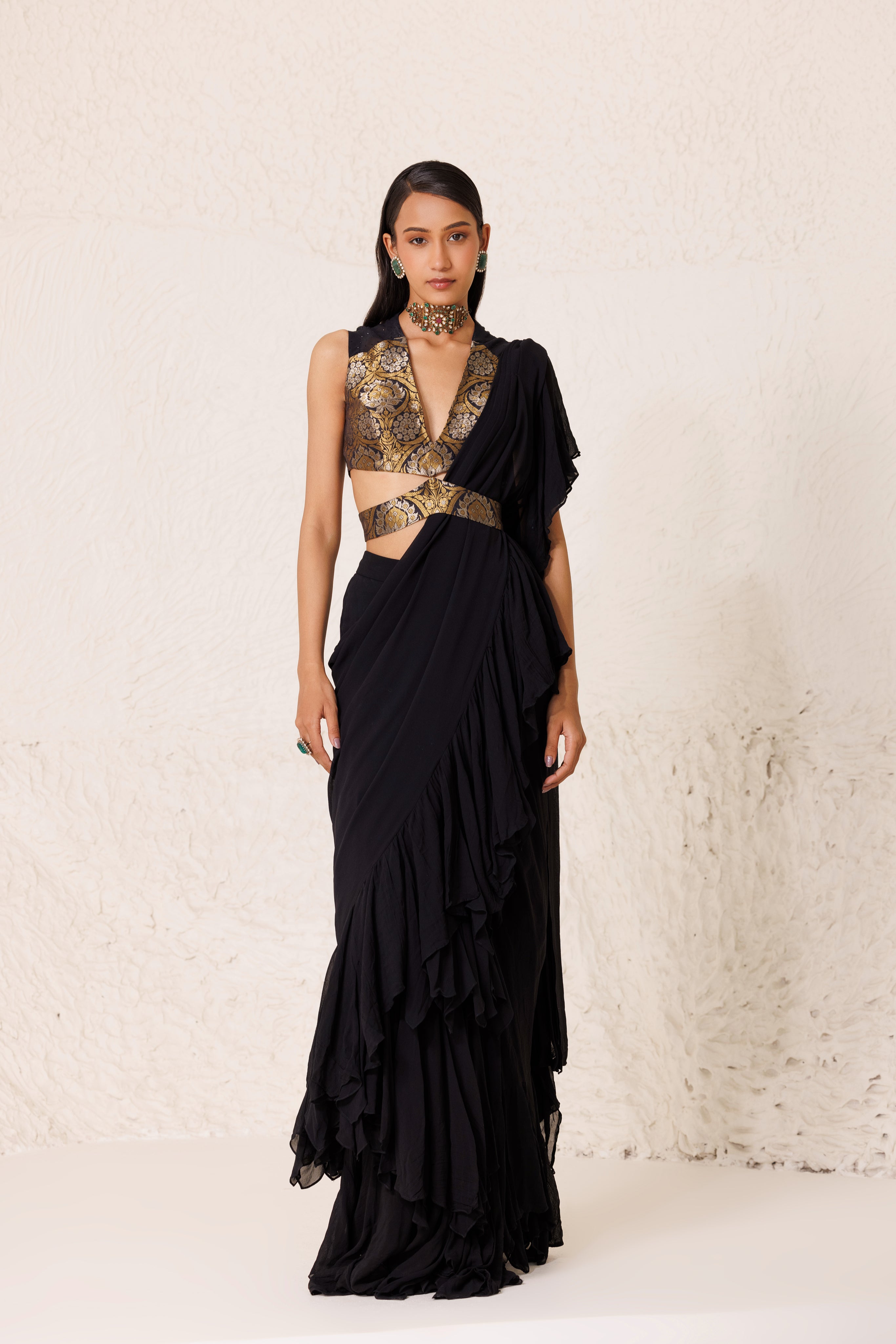 A Black Georgette saree harmoniously pairs with a Brocade and Georgette blouse adorned with a Brocade belt, infusing a sense of luxury into the ensemble.