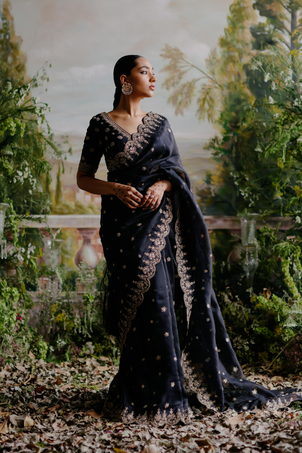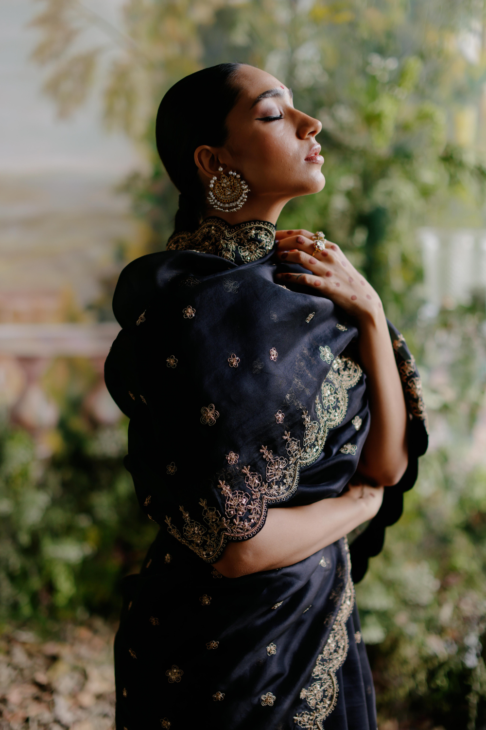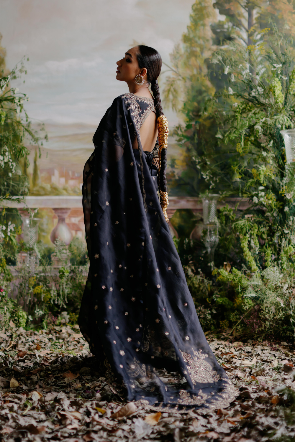 Featuring a charcoal black saree in organza base, paired with a dupion silk blouse with antique gold dori, aari and embellished hand work.