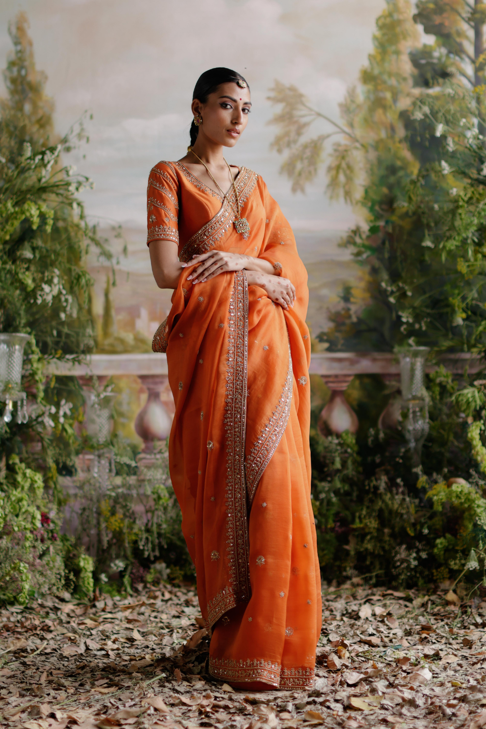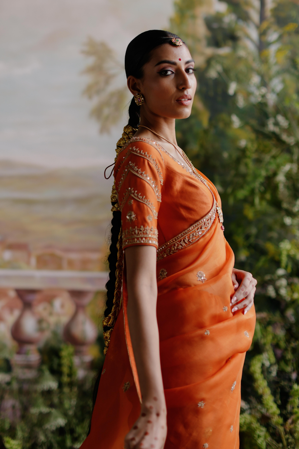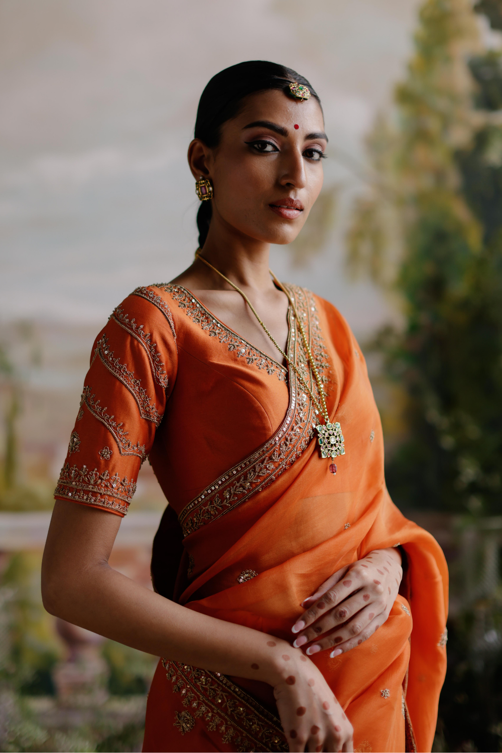 Featuring a rust orange organza saree paired with a chanderi silk blouse with antique gold dori, aari and embellished hand work.