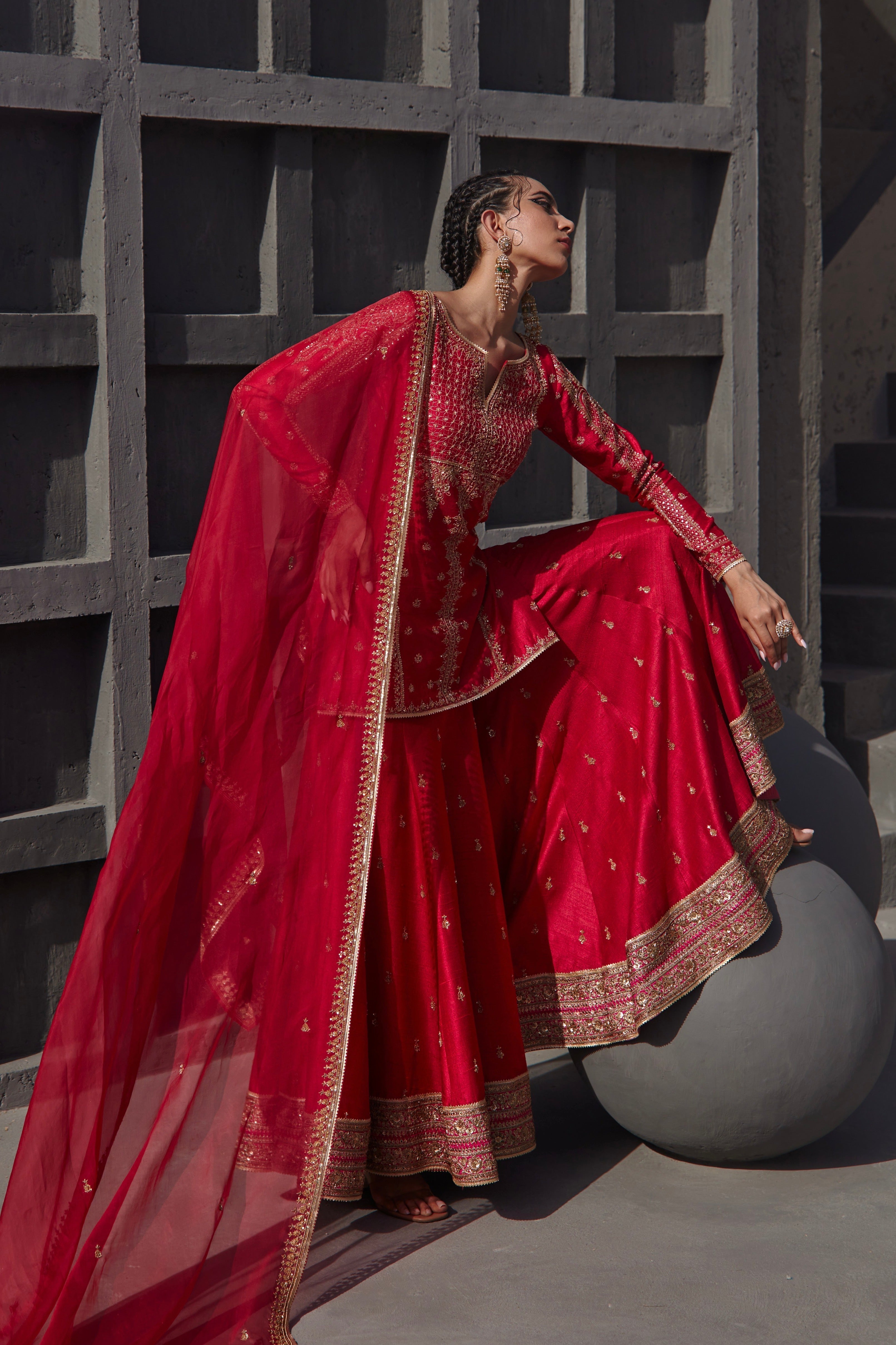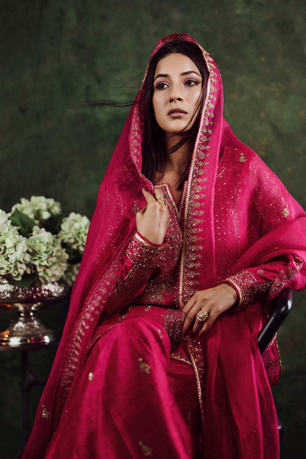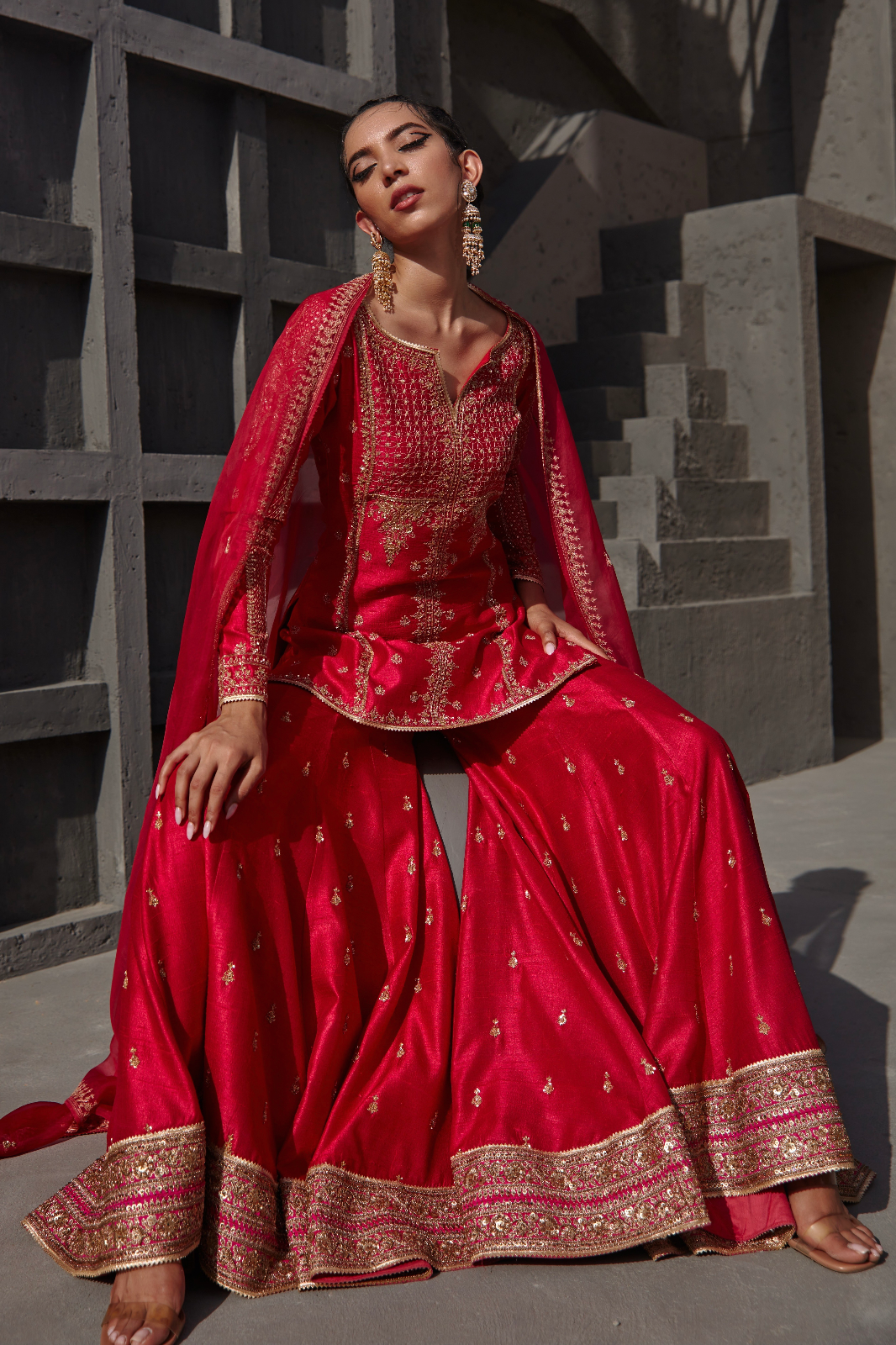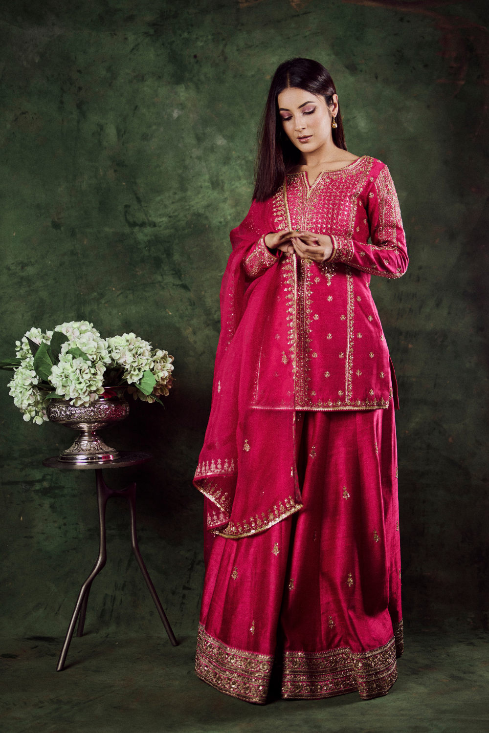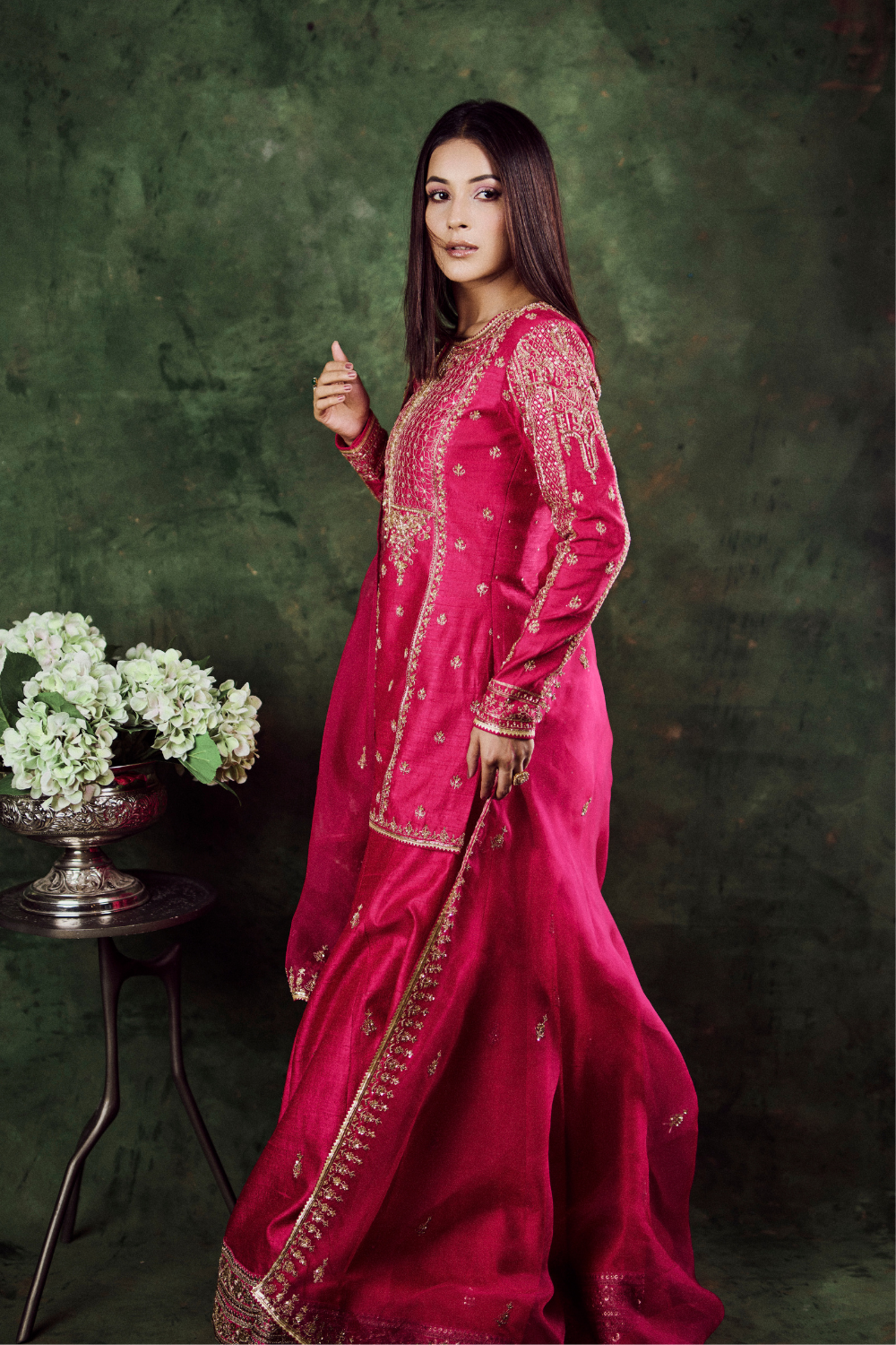 Featuring a deep pink kurta set in Raw silk with aari and dori embroidery. It is paired with matching embroidered sharara and organza dupatta.