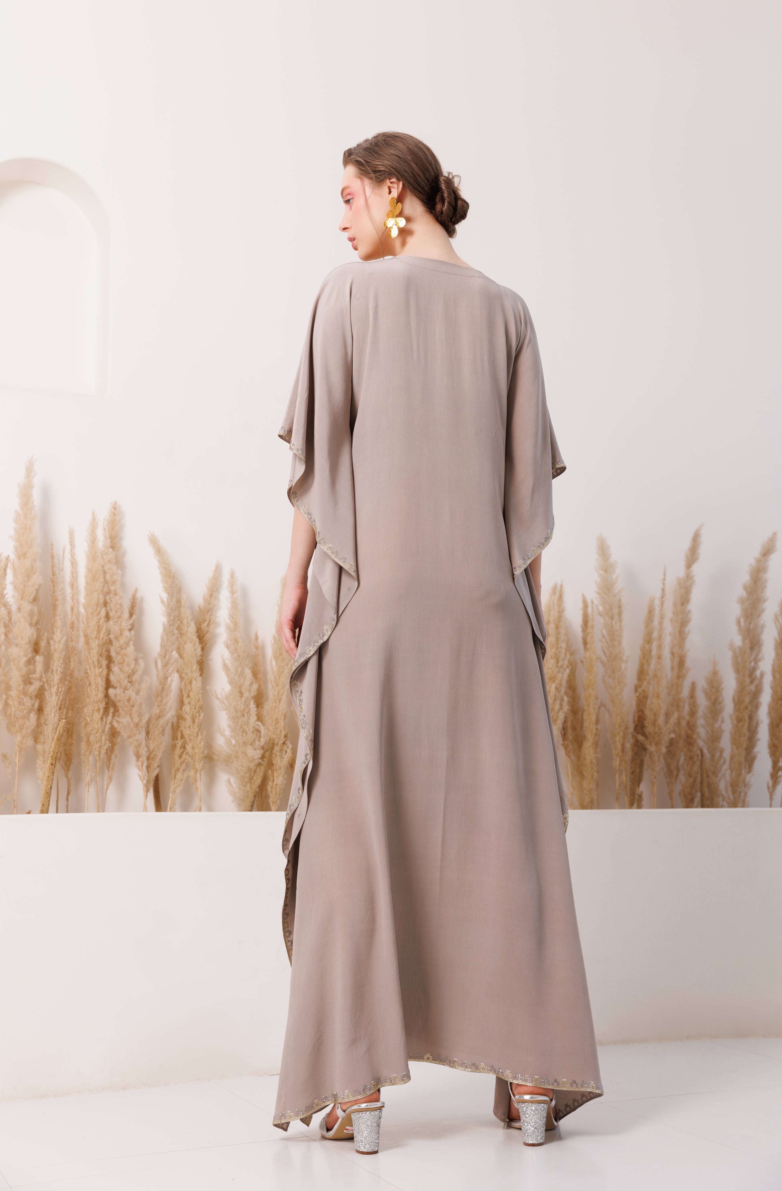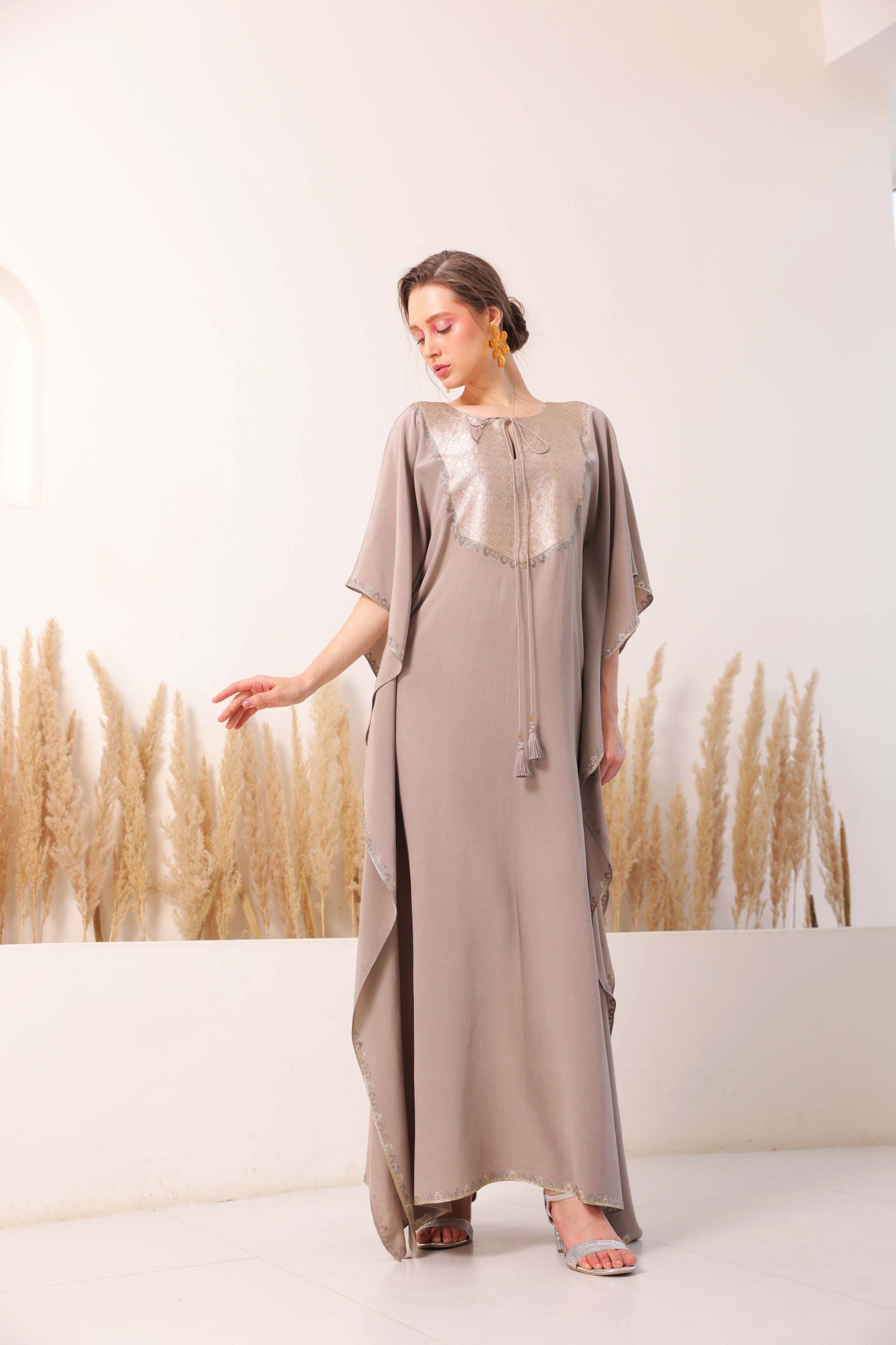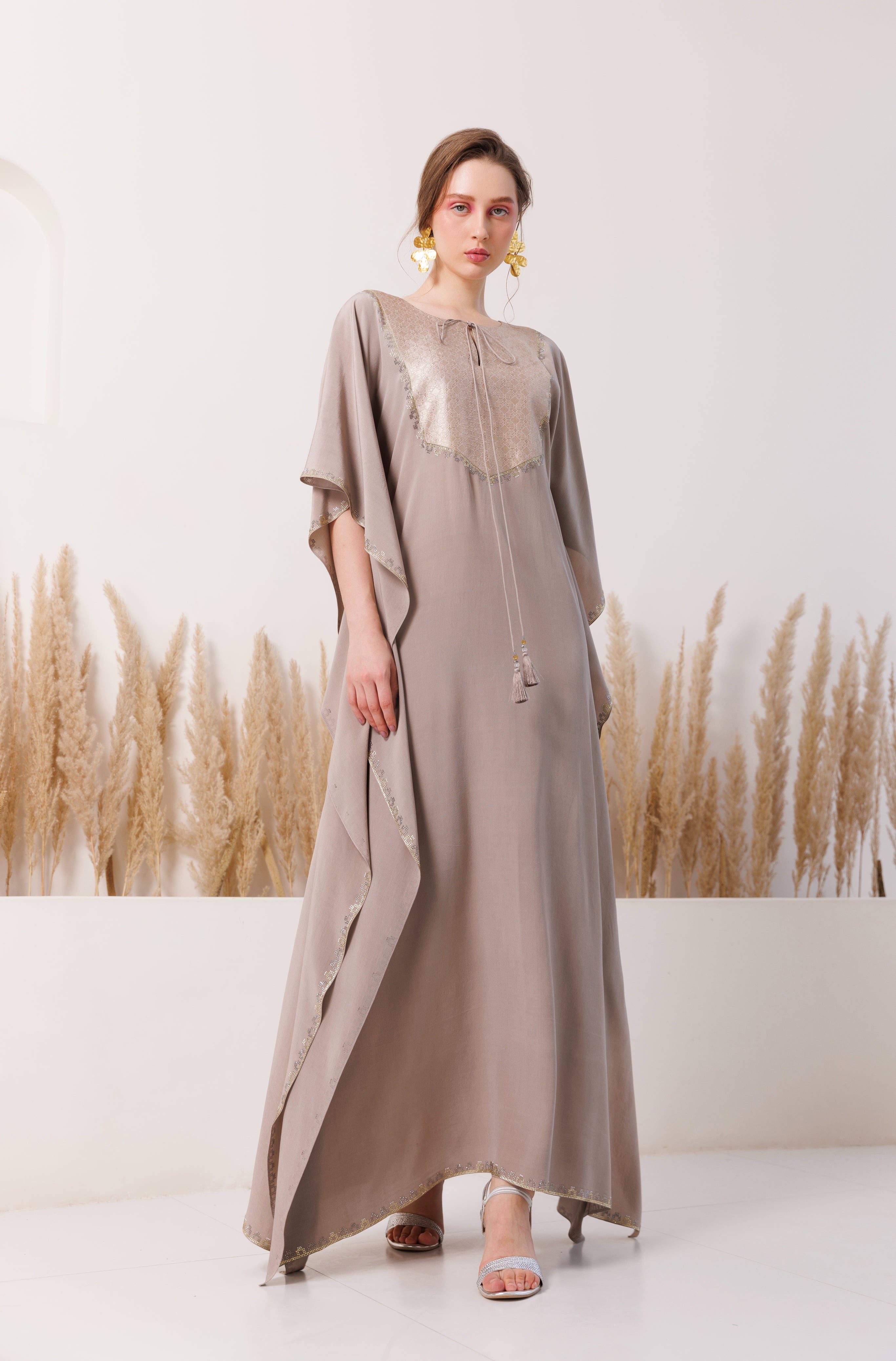 A silver grey crepe kaftan adorned with a Brocade yoke and embellished with rhinestones along the edge and yoke of the kaftan, accentuated with drawstring tassels. This fusion of elements creates a sense of luxury and opulence within the ensemble.