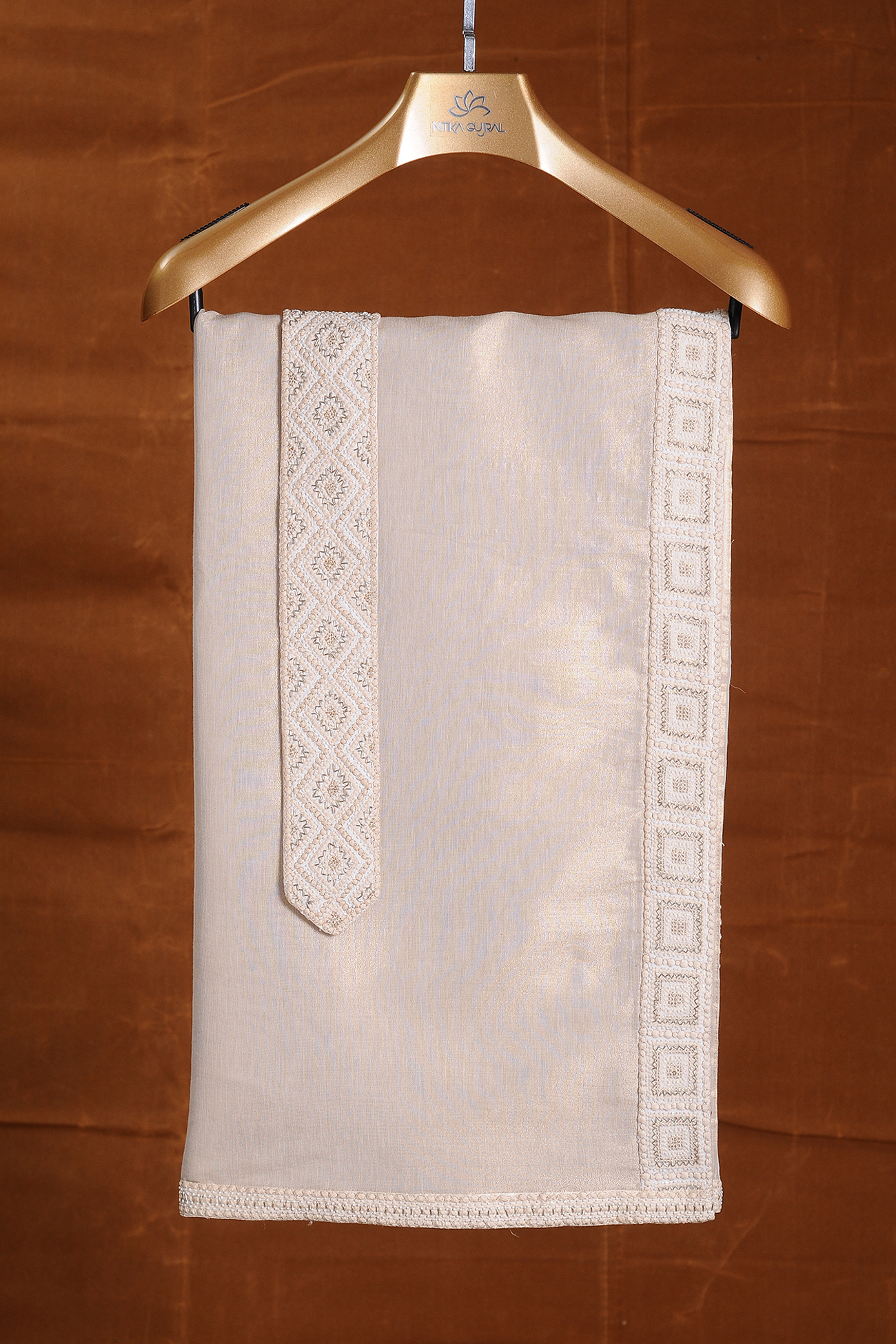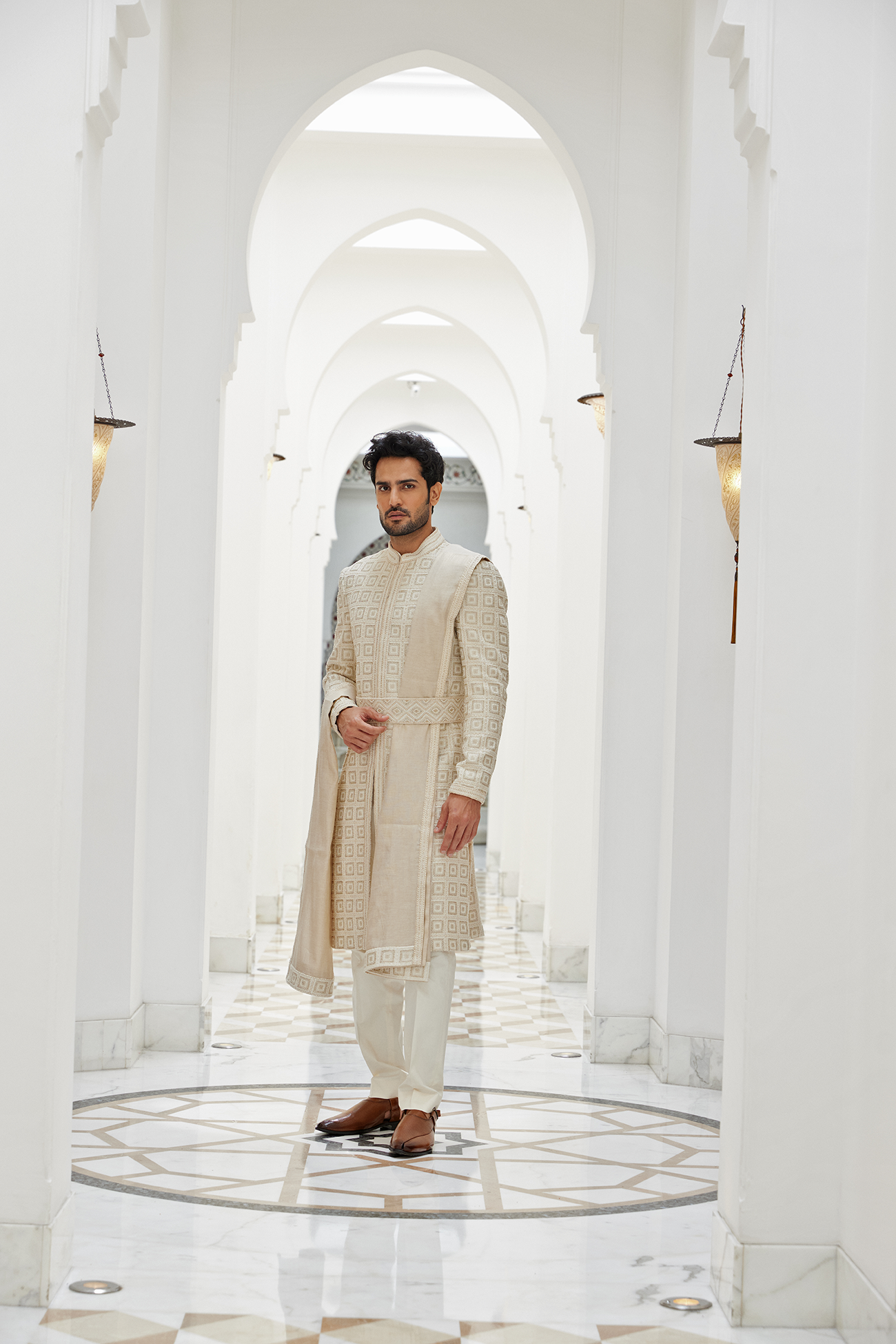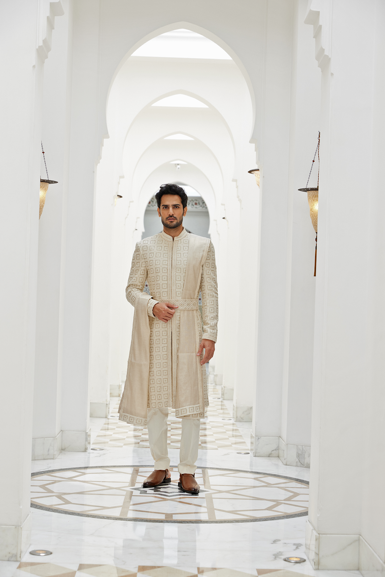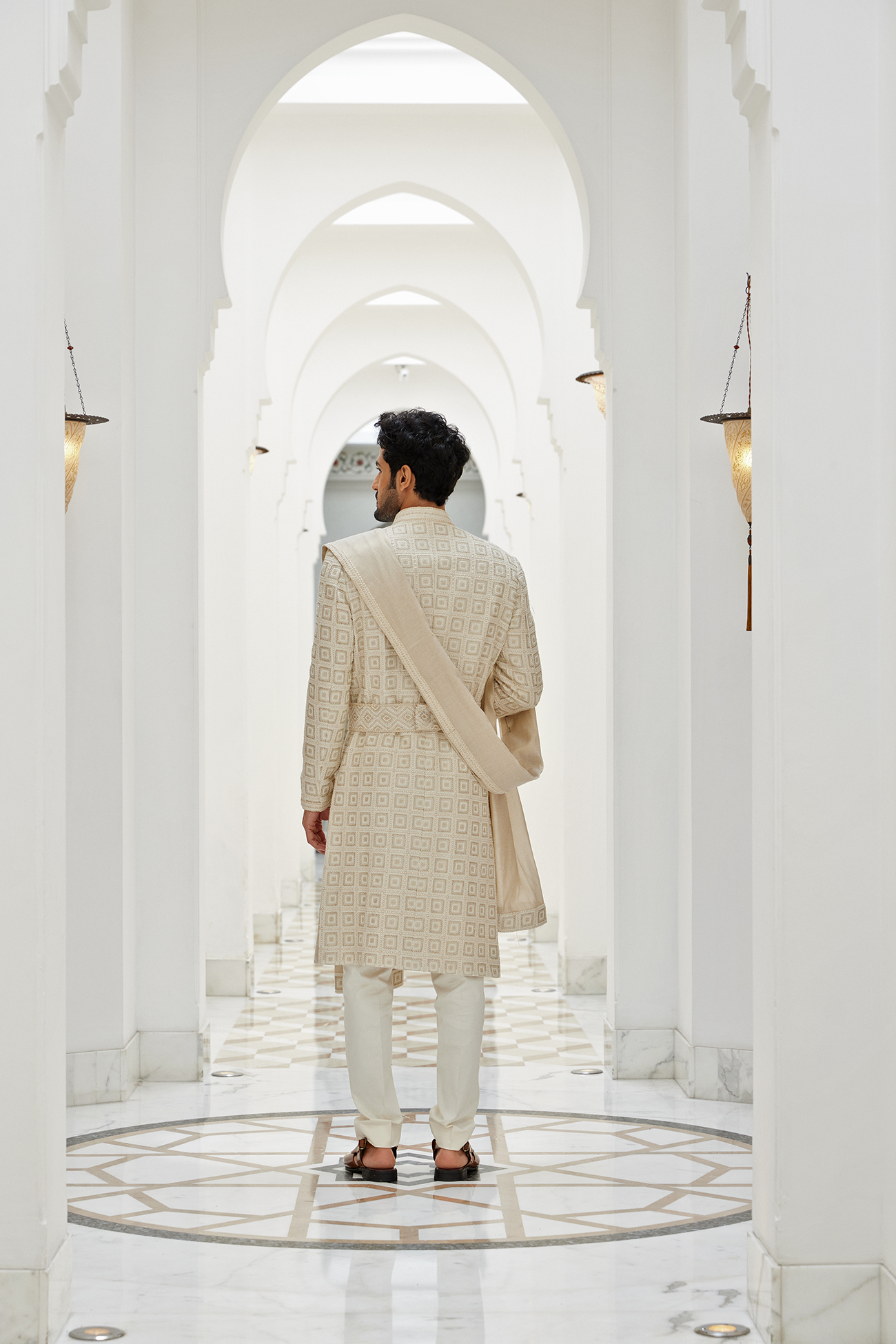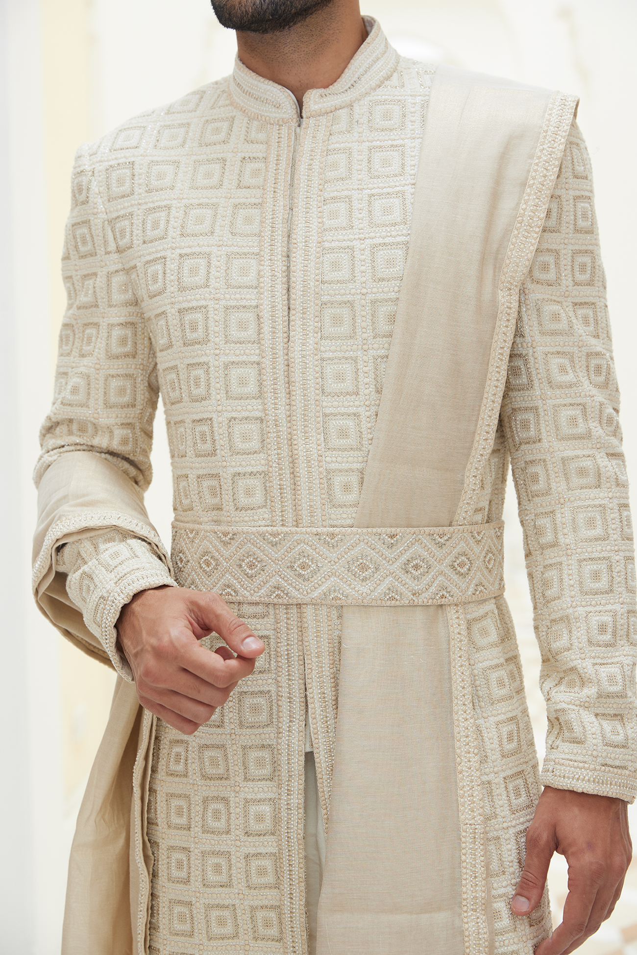 Cream Raw Silk Sherwani Embroidered In Tonal Dori In A Geometric Pattern And Highlighted With Rose Gold Sequins, Dabka And Crystals, Additional Stole And Belt For Cream Raw Silk Sherwani.