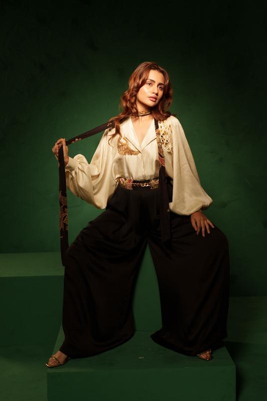 Cream silk shirt with gold bird embroidery and tassels , paired with black box pleated pants .
