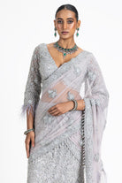 Silver Grey Fishtailed Skirt Saree With A 3/4 Sleeve Blouse And Net Palla Embroidered In Silver Zari, Dabka, Beads, And Crystals, Featuring Feathers On The Blouse Sleeves.