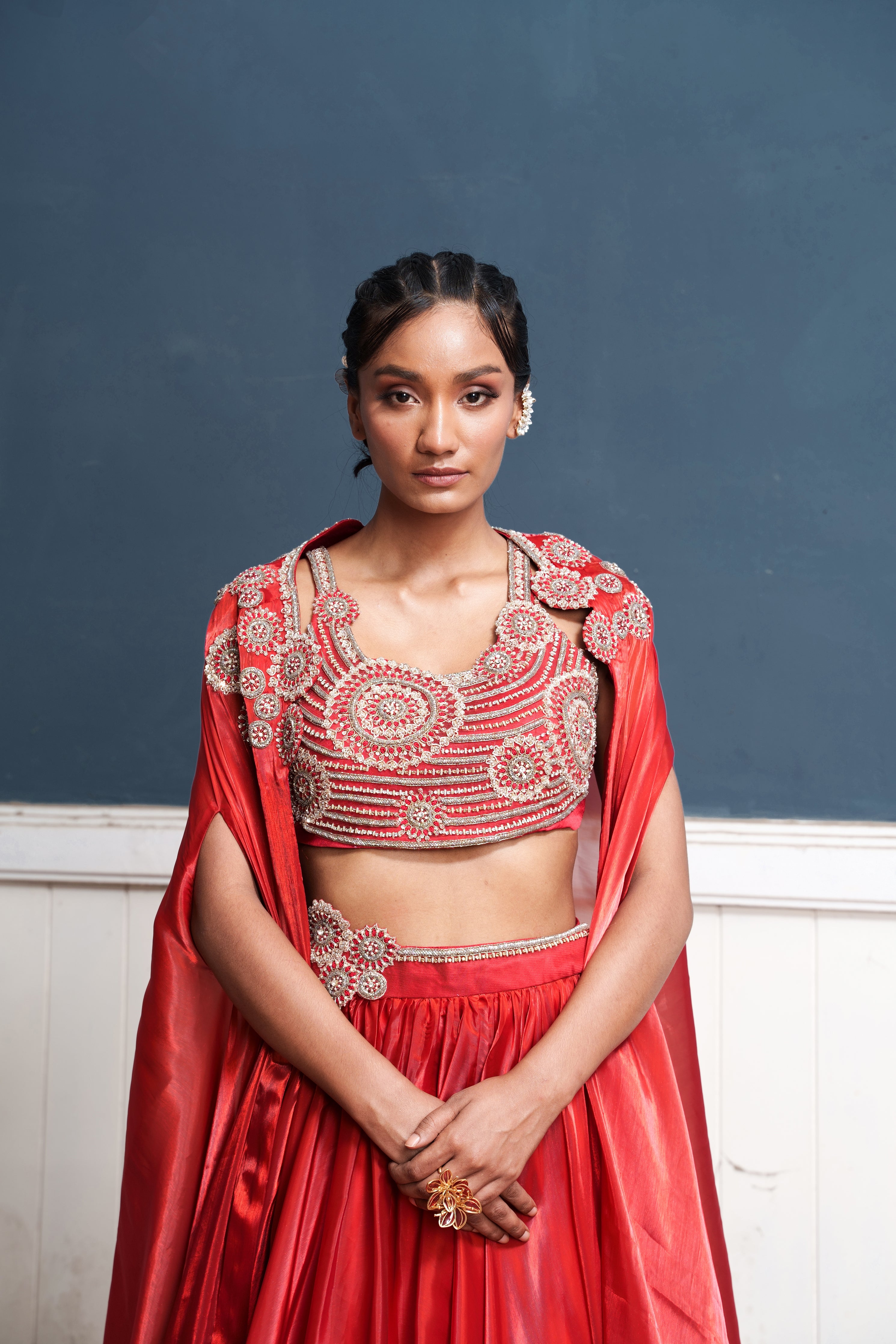 Sirius-Nakshatra Red Hand Embroidered Lehenga with Over Coat