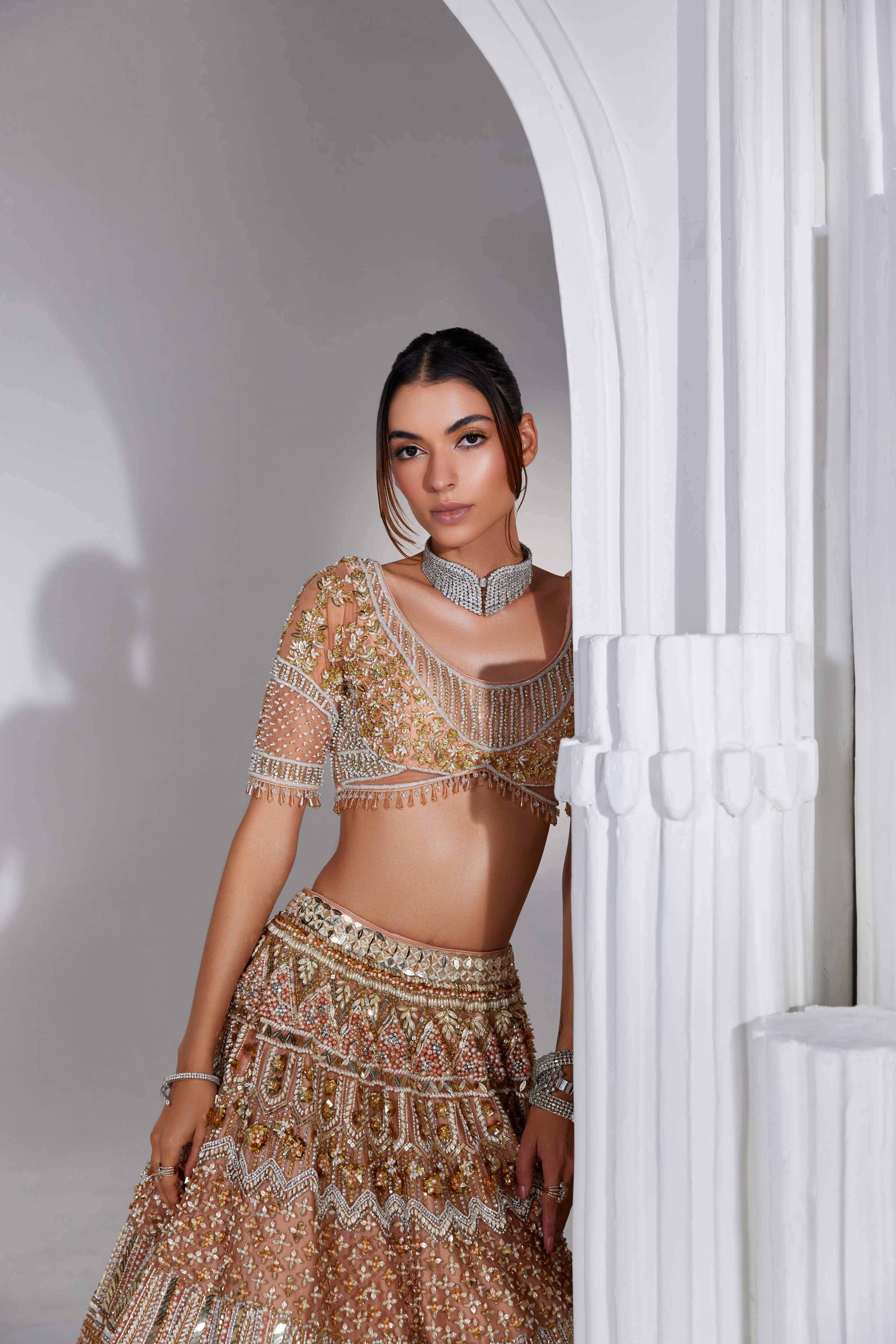 SKIN COLOR LEHENGA SET FEATURES PEARLS,SEQUINS MIXED EMBROIDERY WITH STATEMENT ELEMENTS ON NET BASE LINED WITH SILK. IT IS PAIRED WITH CUTWORK DUPPATTA.