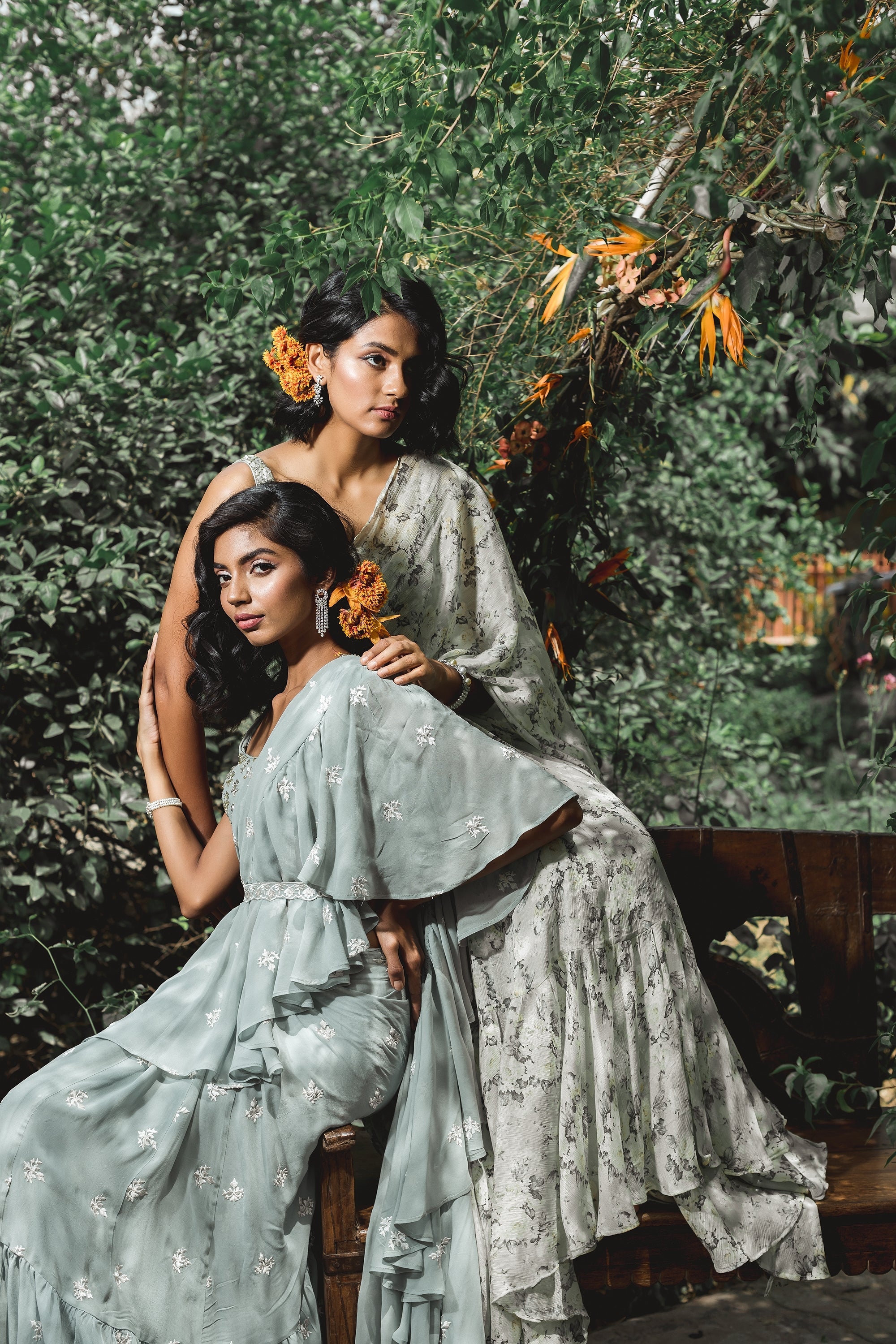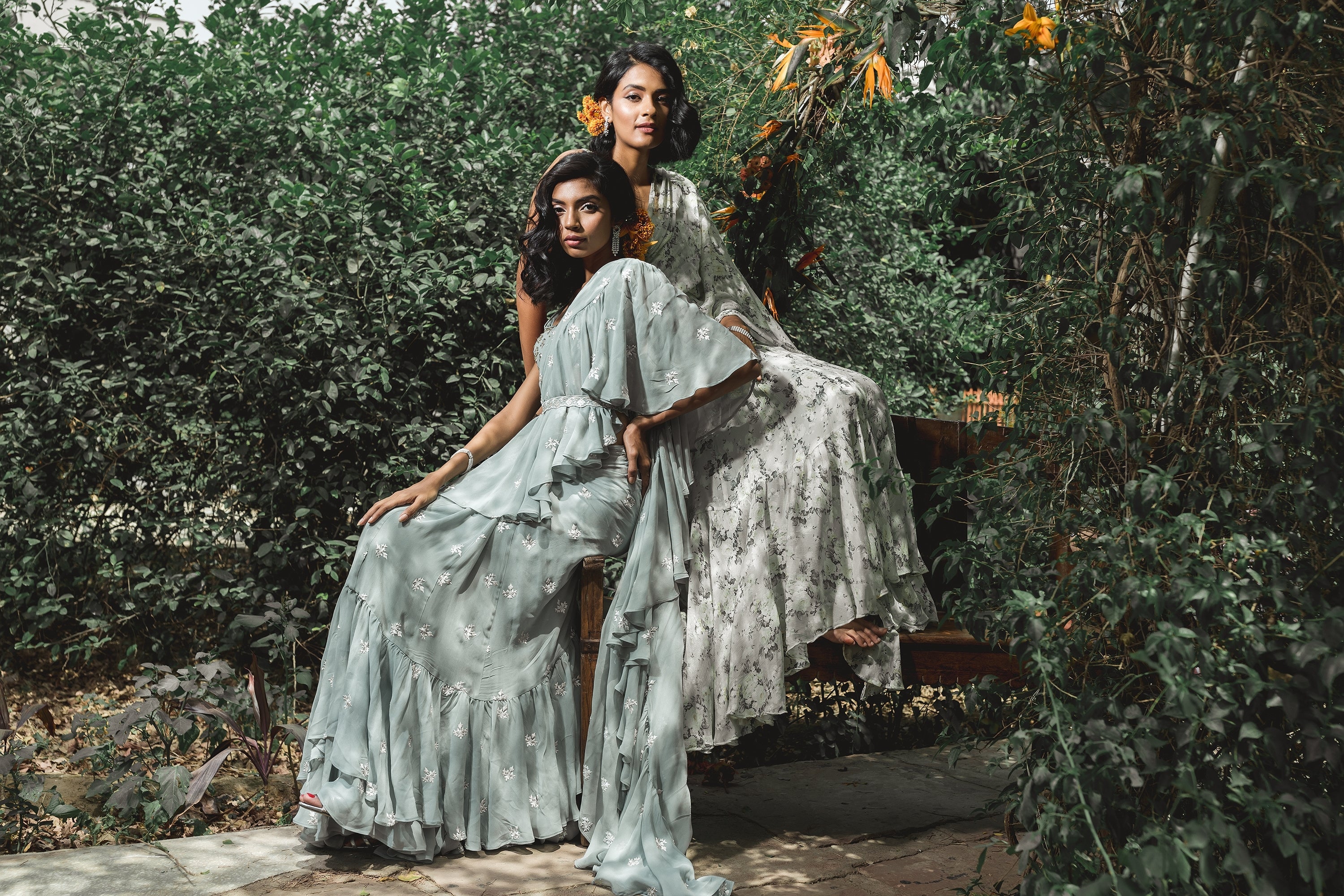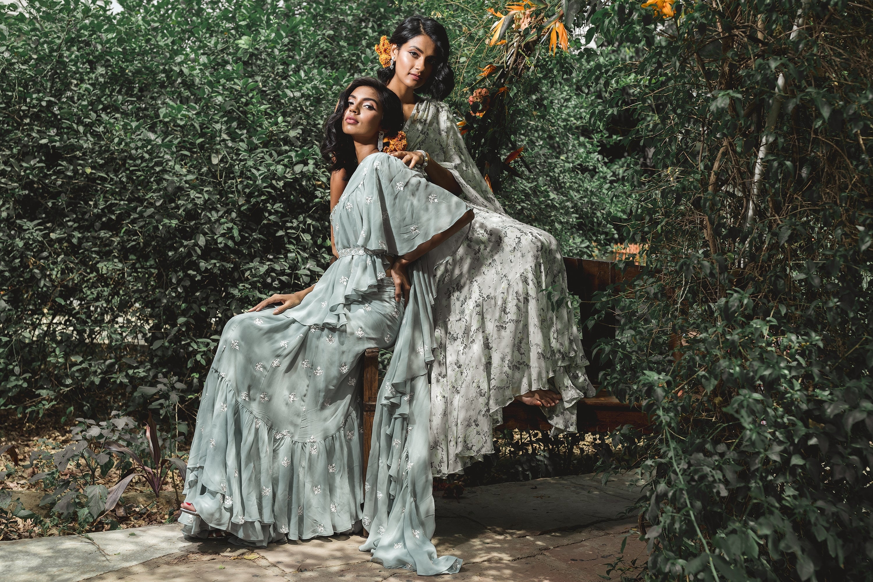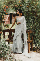 Featuring a SKY BLUE BOOTIE RUFFLE SAREE SET IN GEORJETTE.