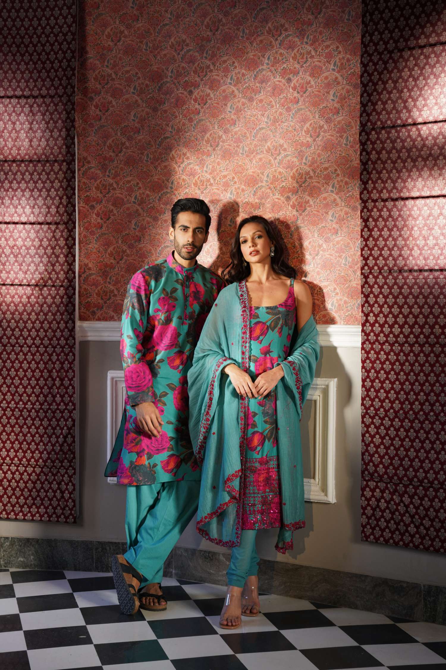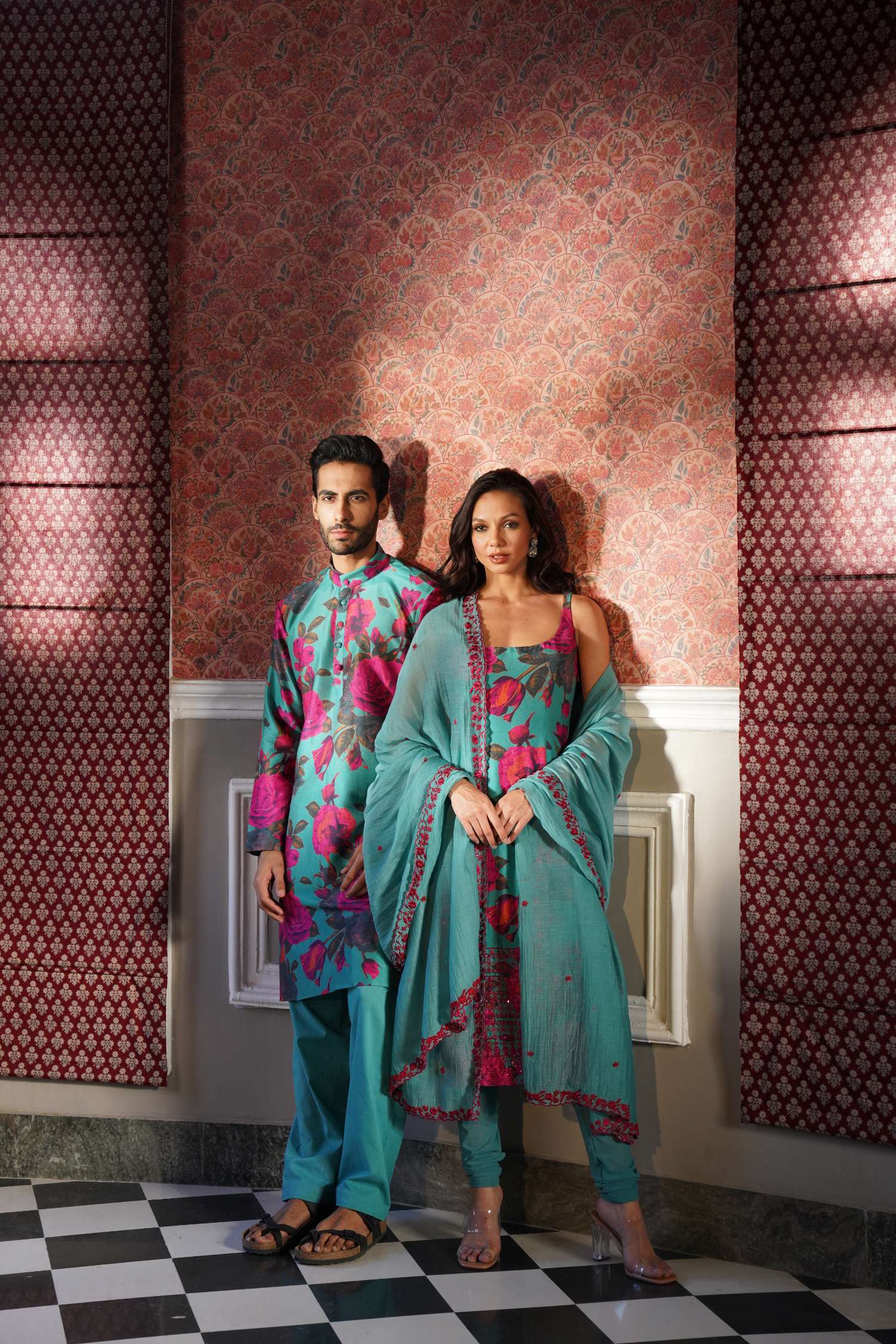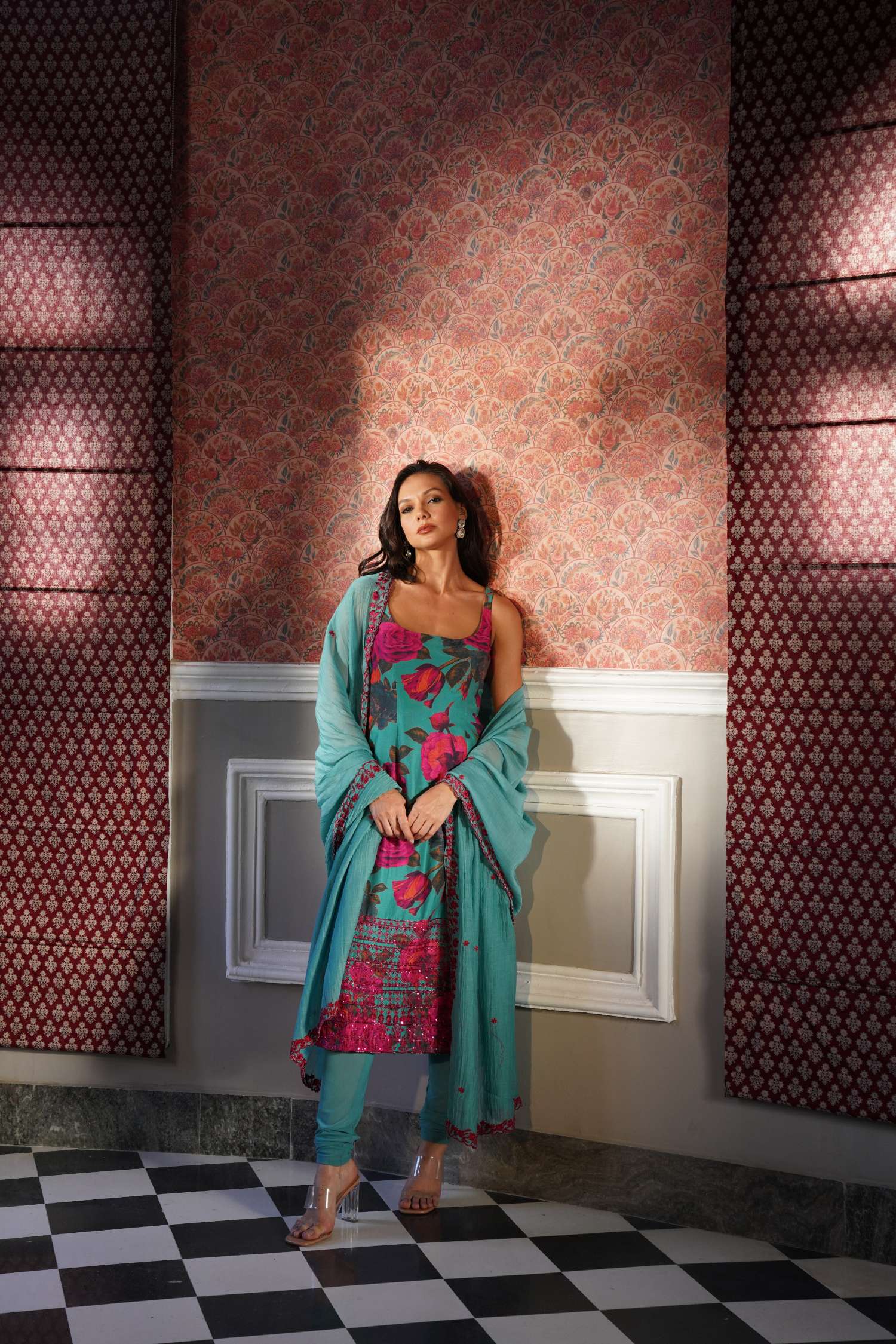 Featuring a Sky BLUE Floral Kurti Set in CHANDERI SILK.