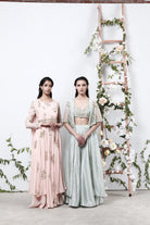 Featuring a SKY BLUE PANTS WITH CAPE IN RAW SILK.