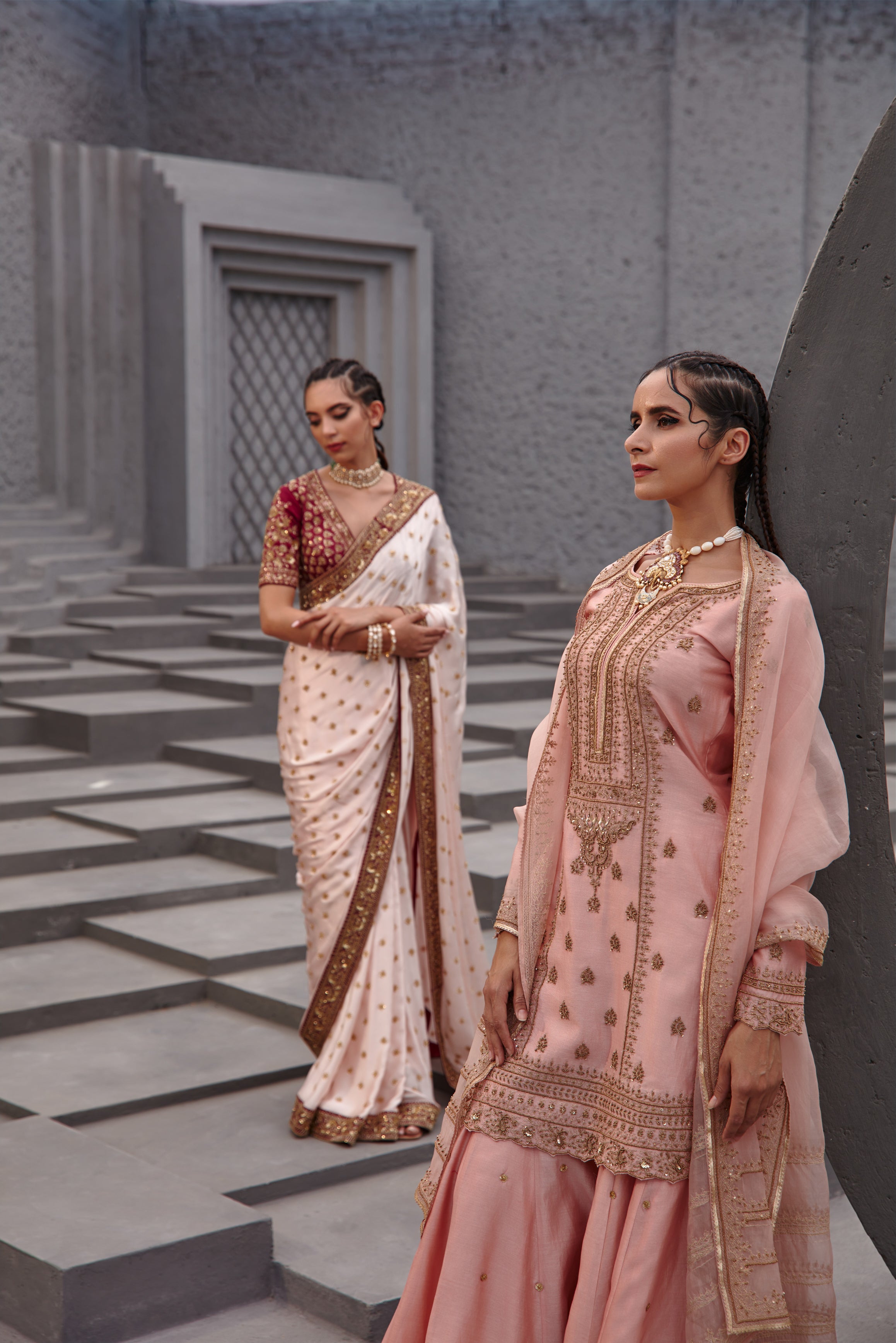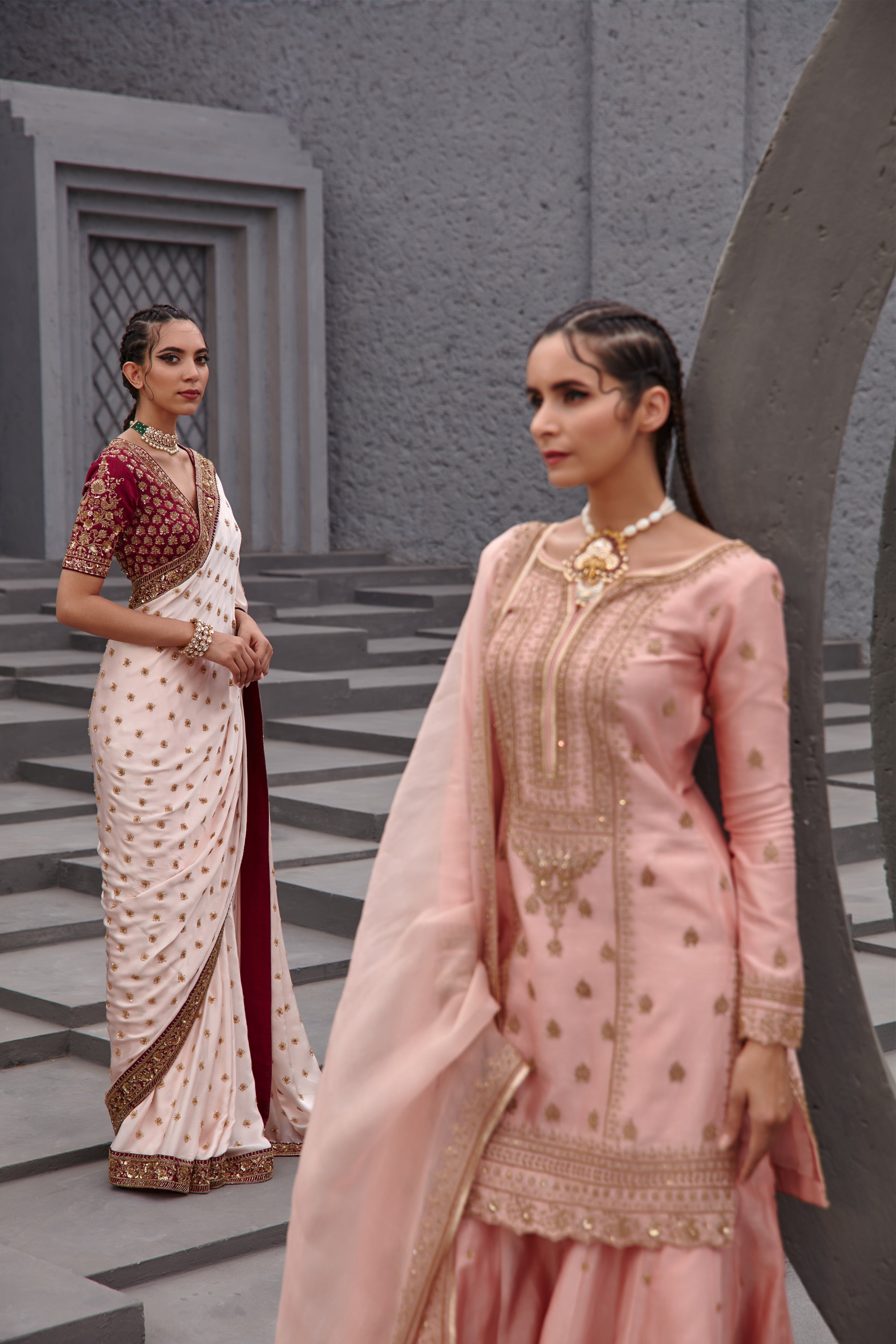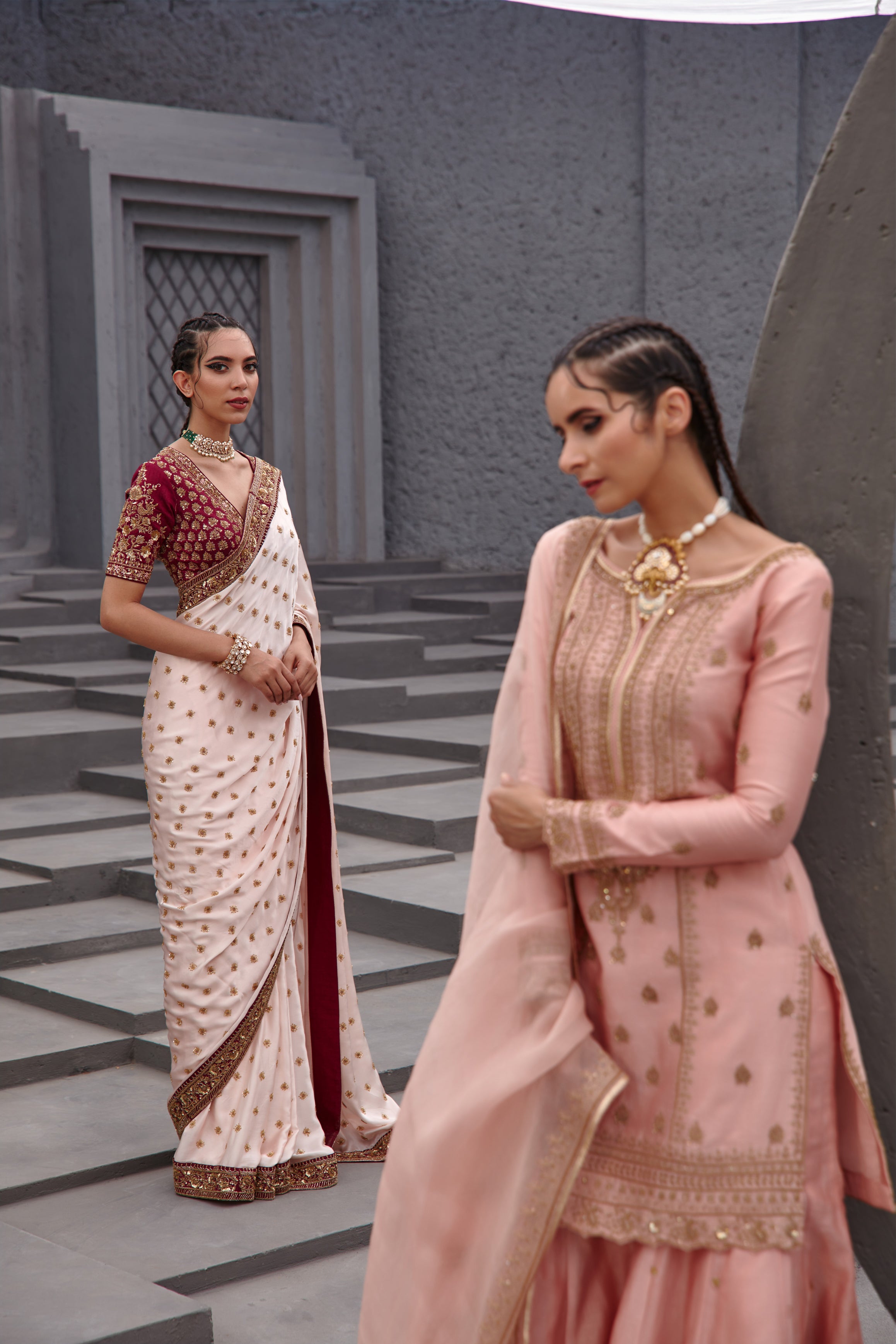 Featuring a soft pink satin georgette saree paired with wine raw silk blouse with gold aari embroidery on it.