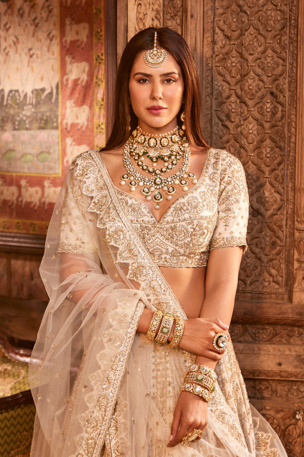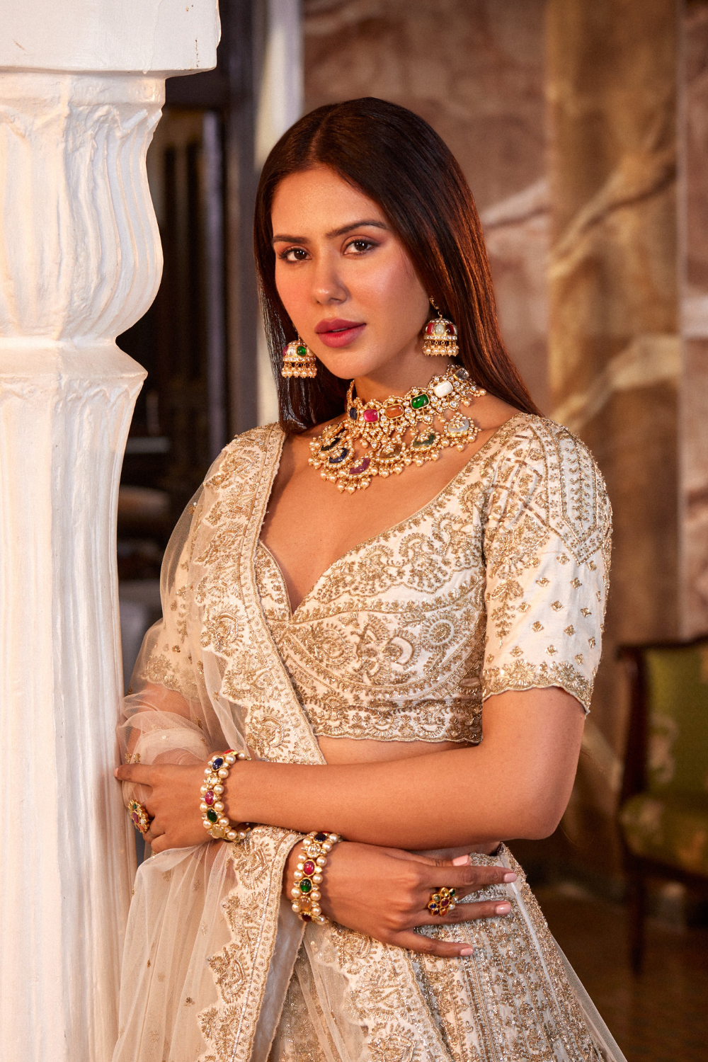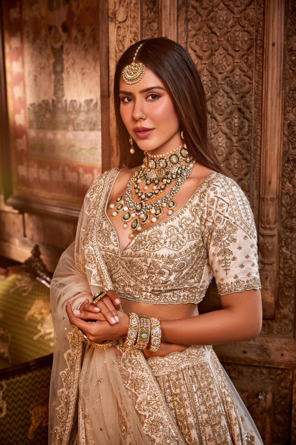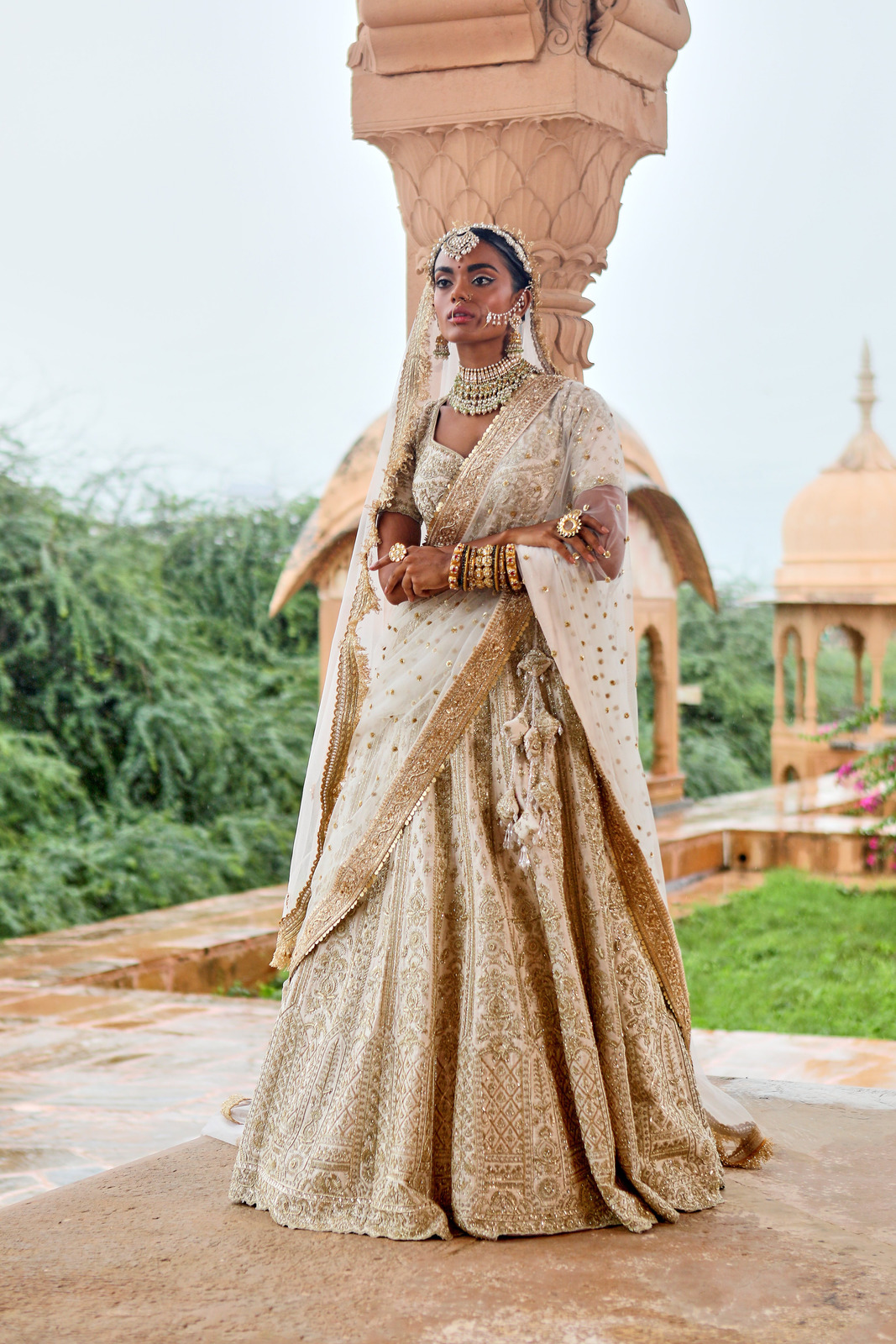 Featuring an off-white Raw Silk bridal lehenga set paired with butterfly net dupatta with gold zardozi & aari embroidery