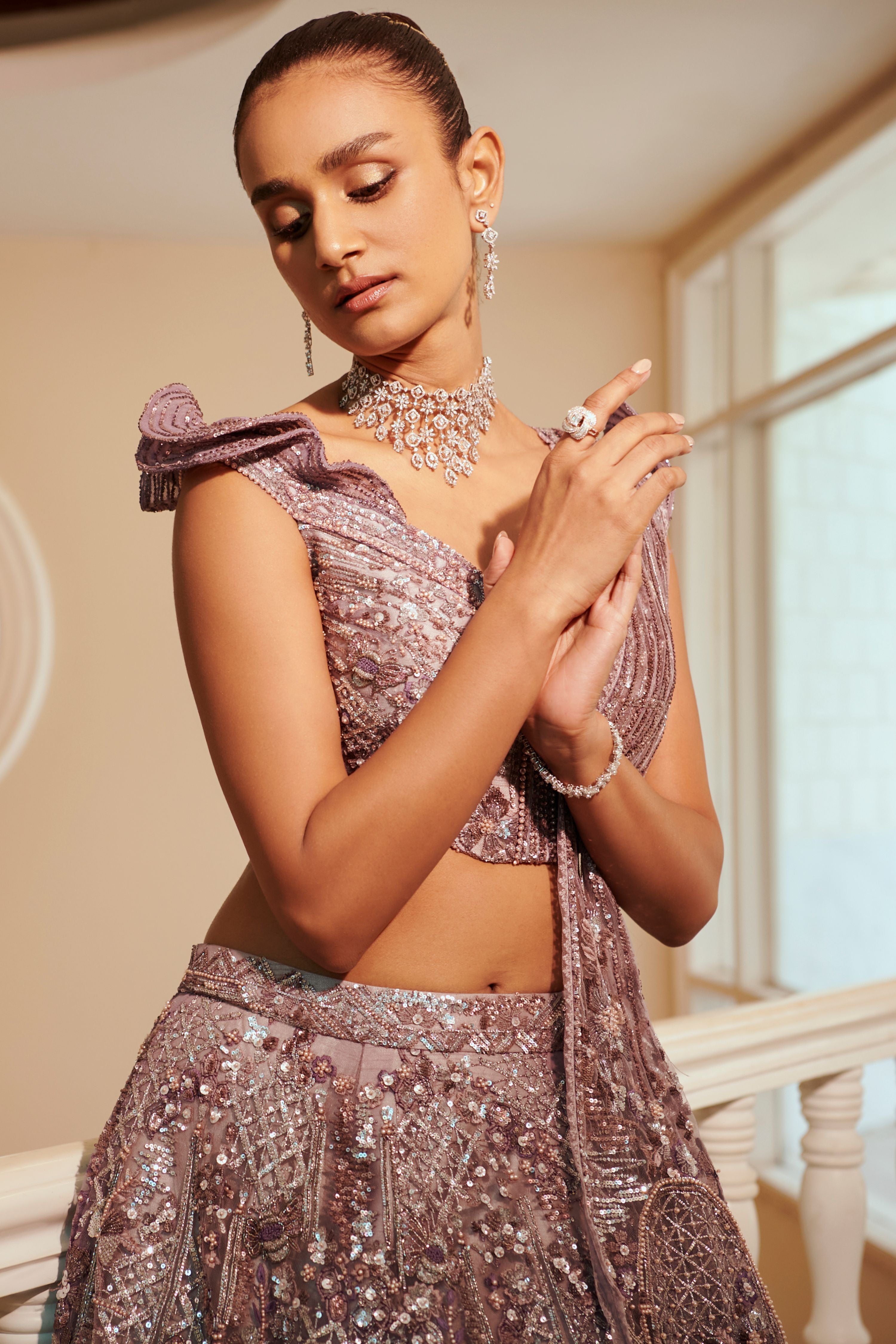 This Glittered Lehenga is enhanced with exciting motifs that are exuberant and diverse as nature itself.