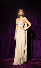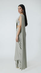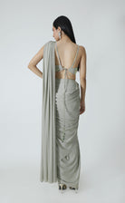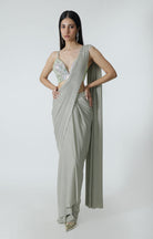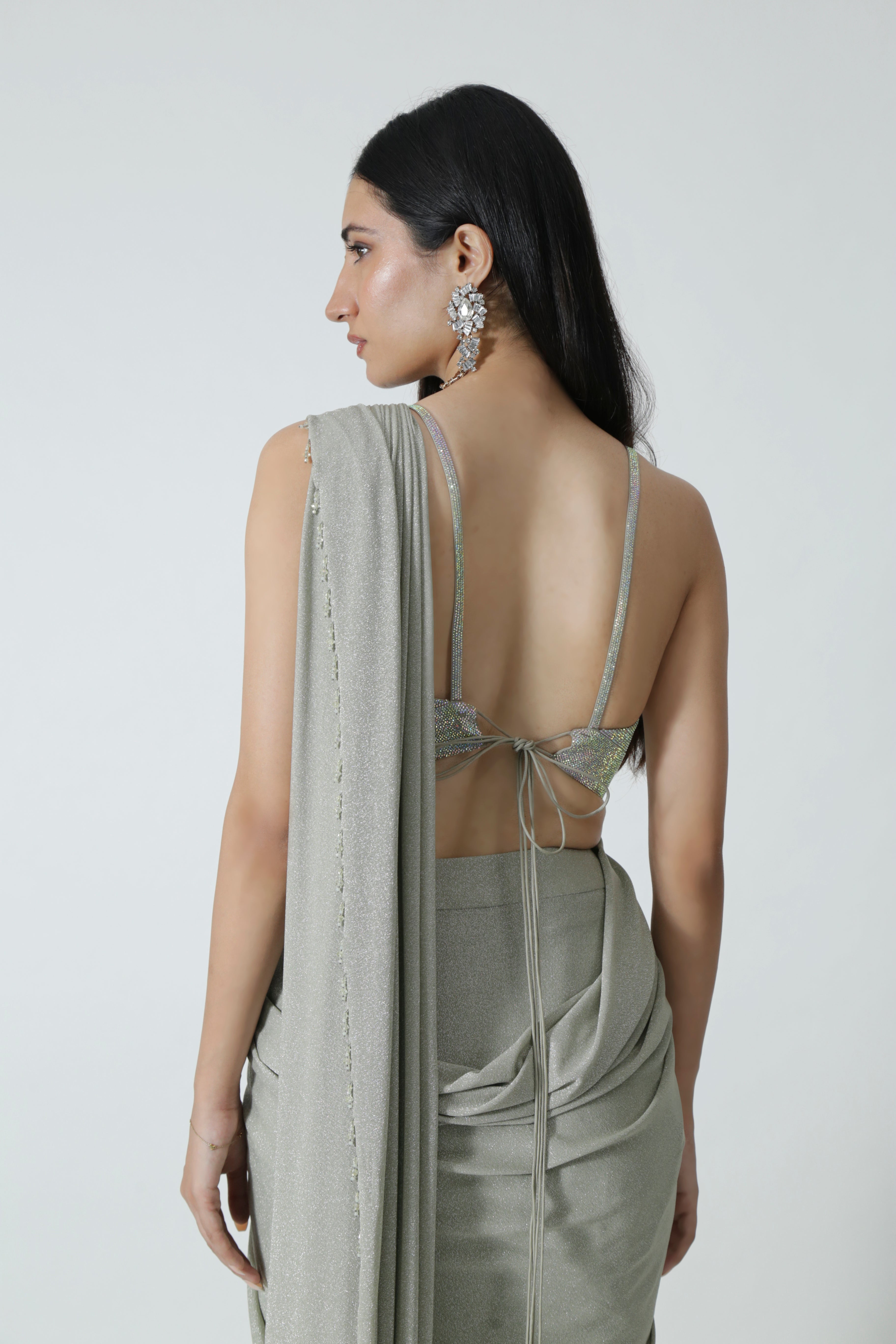 A Silver Green pre-draped lycra saree, adorned with tassels, paired with a dazzling rhinestones encrusted bralette.