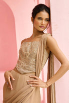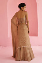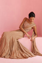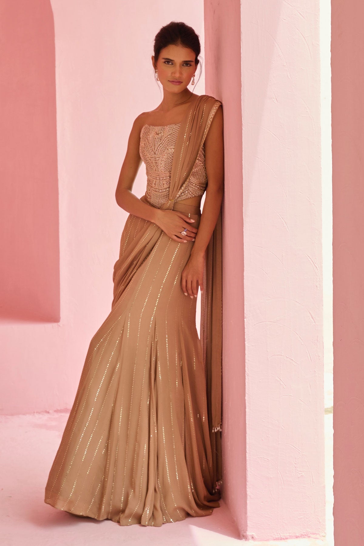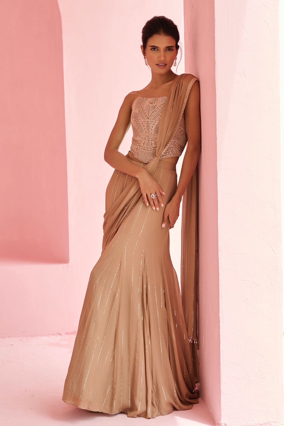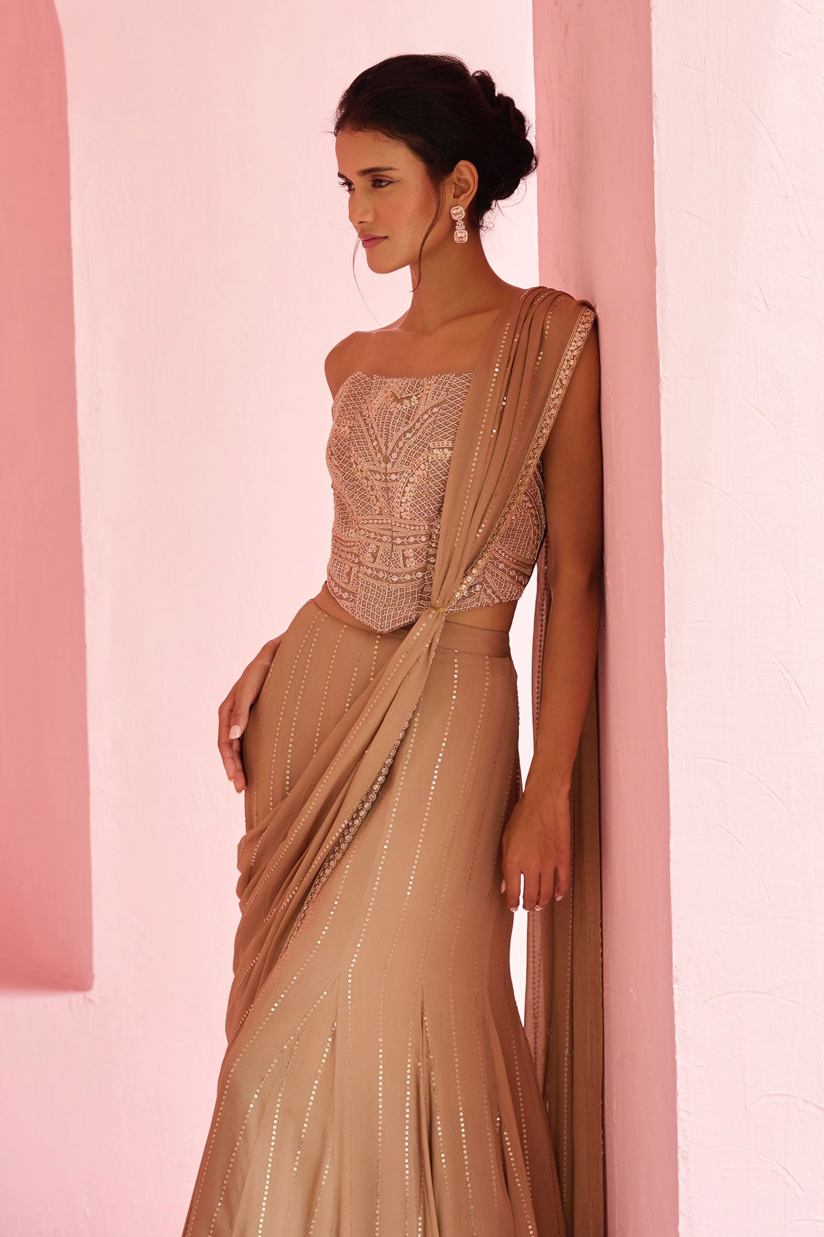 Sequence embellished georgette pre-draped saree paired with glassbeads and sequence embroidered corset blouse